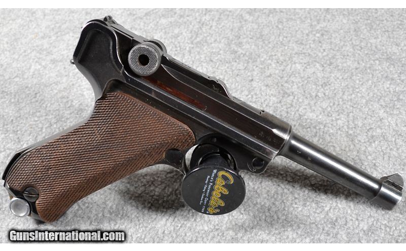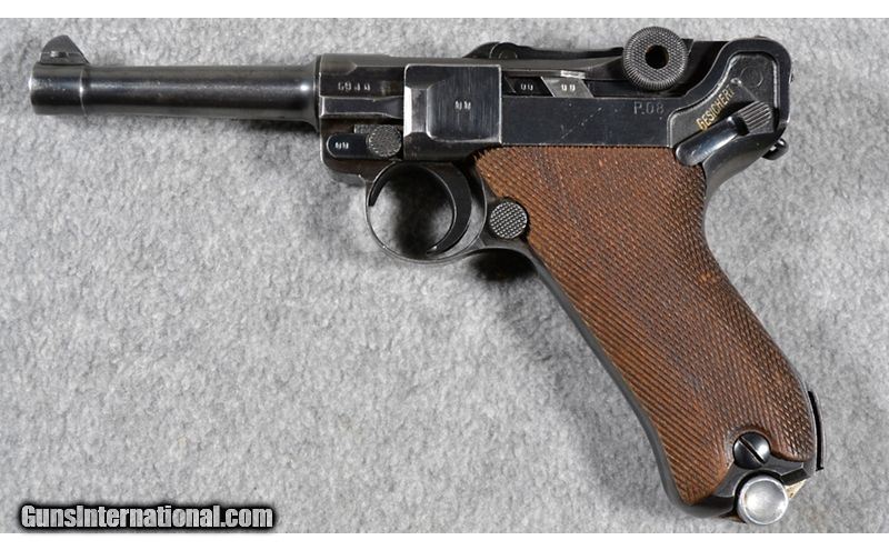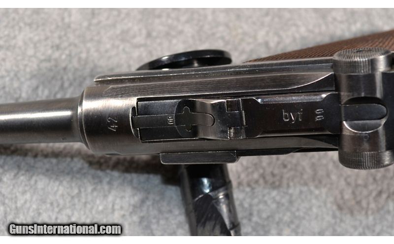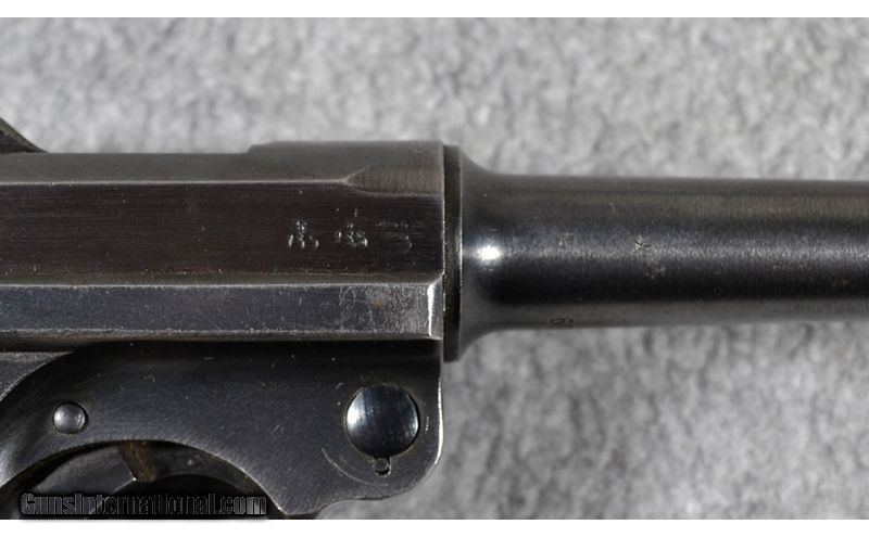 Description: This is a standard late production WWII German Army P.08 Luger as produced by the Mauser factory in 1942. This series of luger has the all blued finish with checkered walnut grips. The top of the chamber area is stamped "42" for the year of manufacture and the front toggle is stamped with "byf" the wartime code for the Mauser factory. The right side of the barrel extension has the double "eagle/135" Waffenamt proofs along with a single eagle firing proof, with the same proof on the right side of the barrel. The safety and extractor is correctly marked "GESICHERT". 9mm Luger SOLD Curio/Relic: Yes Metal Condition: Very Good Wood Condition: Very Good Bore Condition: Very Good Barrels: 4 Weight: 4lbs Item Location: Lacey, WA |