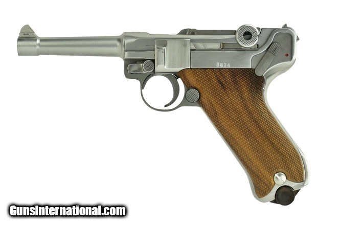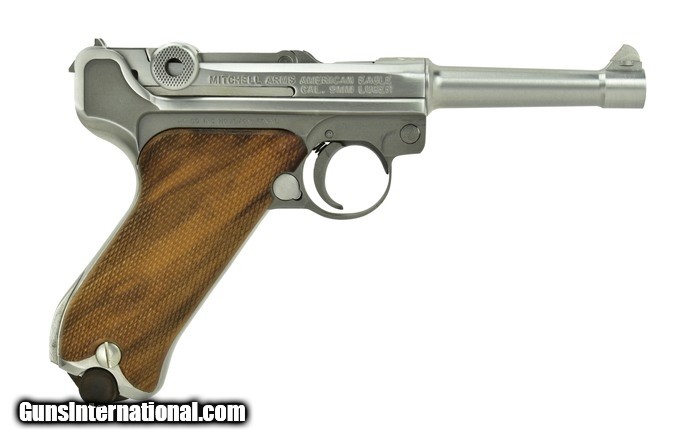 Description: Mitchell Arms American Eagle Luger 9mm caliber pistol. Stainless steel modern Luger in excellent condition.