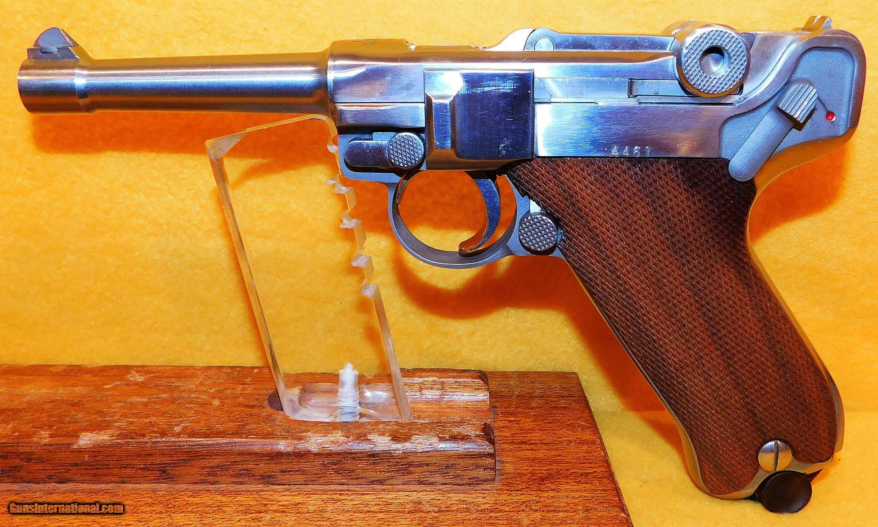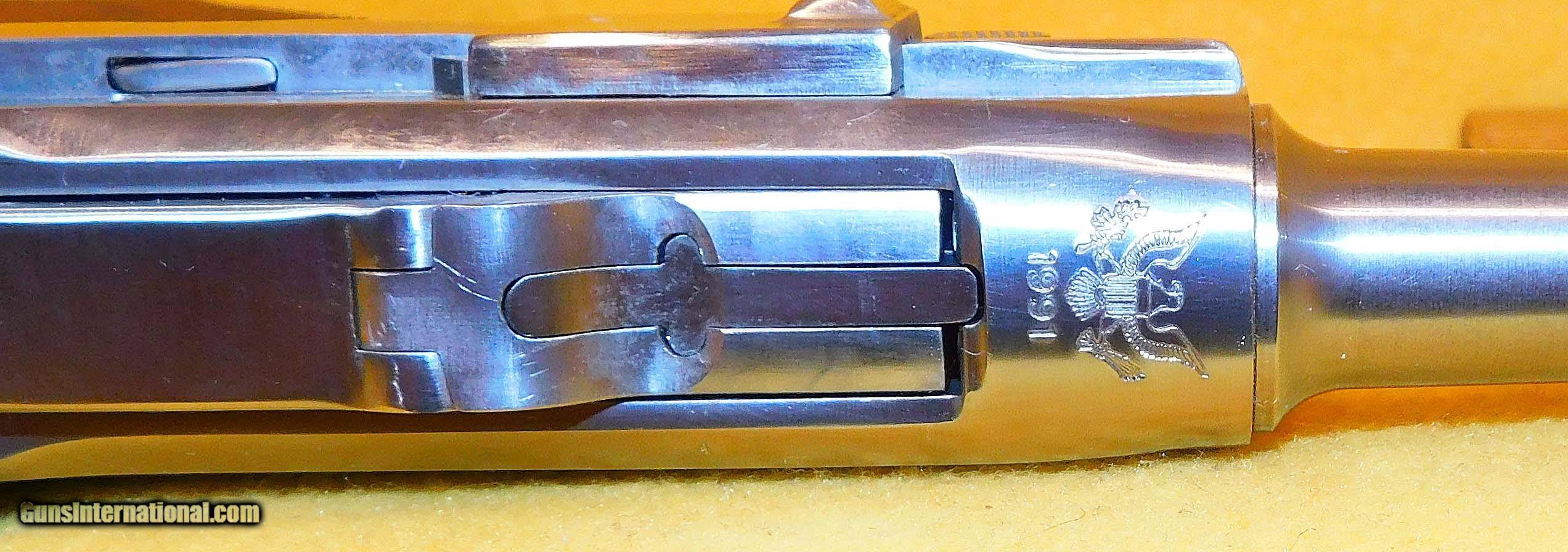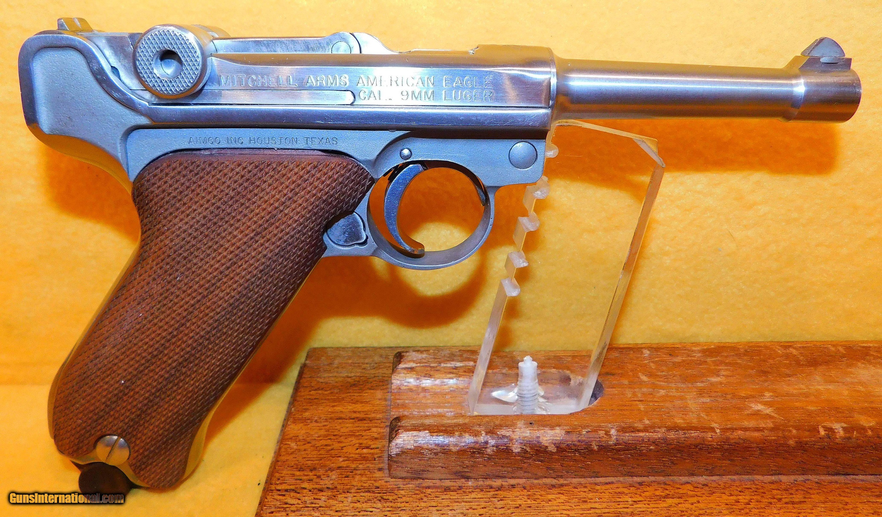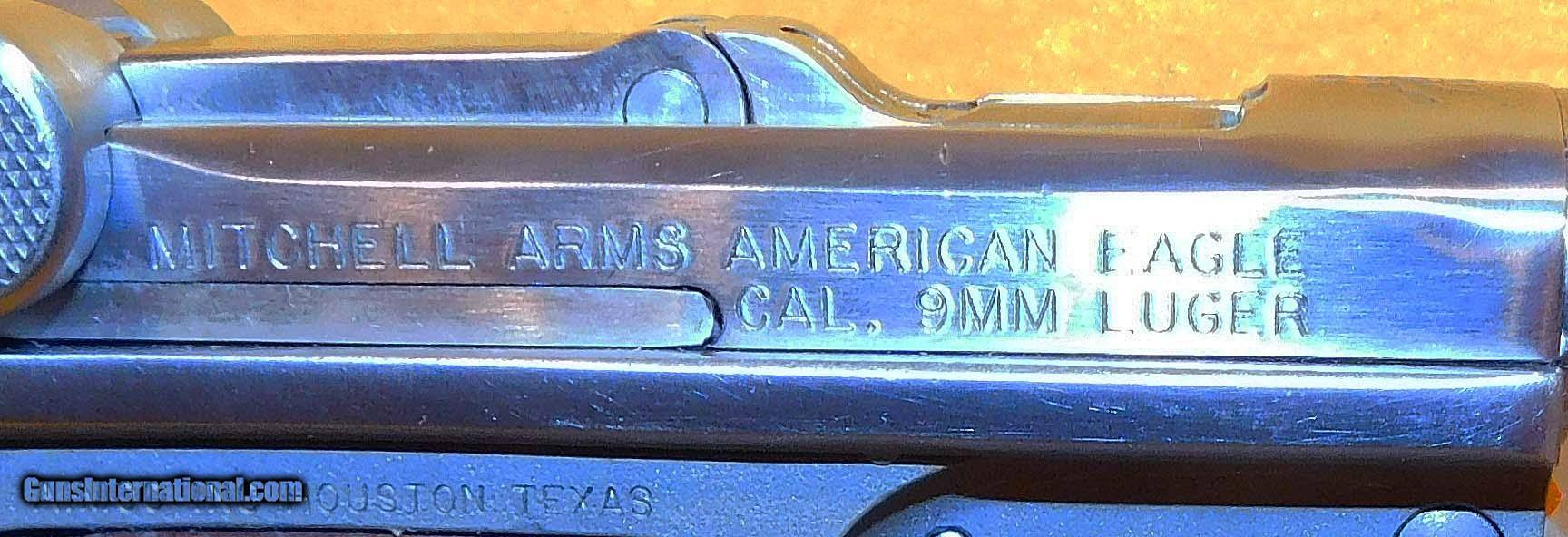 Description: MITCHELL ARMS AMERICAN EAGLE IN 9MM CAL., WITH 4" BARREL. COLOR STAINLESS STEEL. CONDITION 98%. SERIAL NUMBER 4461. MITCHELL ARMS MODEL AMERICAN EAGLE LUGER (CIRCA 1991) IN 9MM CALIBER, GRIPS EXCELLENT, BORE IS BRIGHT AND SHINY, COMES WITH ONE FACTORY MAGAZINE, 98% OVERALL CONDITION, OUR STOCK # D2405 SOLD |