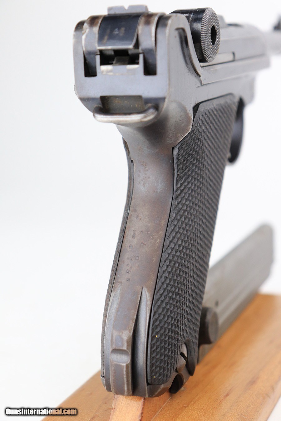 Description: This is a matching and original Police rework DWM Luger from the 1920s. Unit marking is present on the front strap, and this example is uncommon as the magazine safety is present, also. Thinning and patina in various areas, but pronounced on the straps. Unmarked grips with safety chip on left panel. Unmarked after-market mag. Bore has good rifling but signs of use and frost. SOLD Curio/Relic: Yes Handgun Caliber: 9x19mm Parabellum (9mm Luger, 9x19mm NATO) Bore: 7/10 Condition: ~70% |