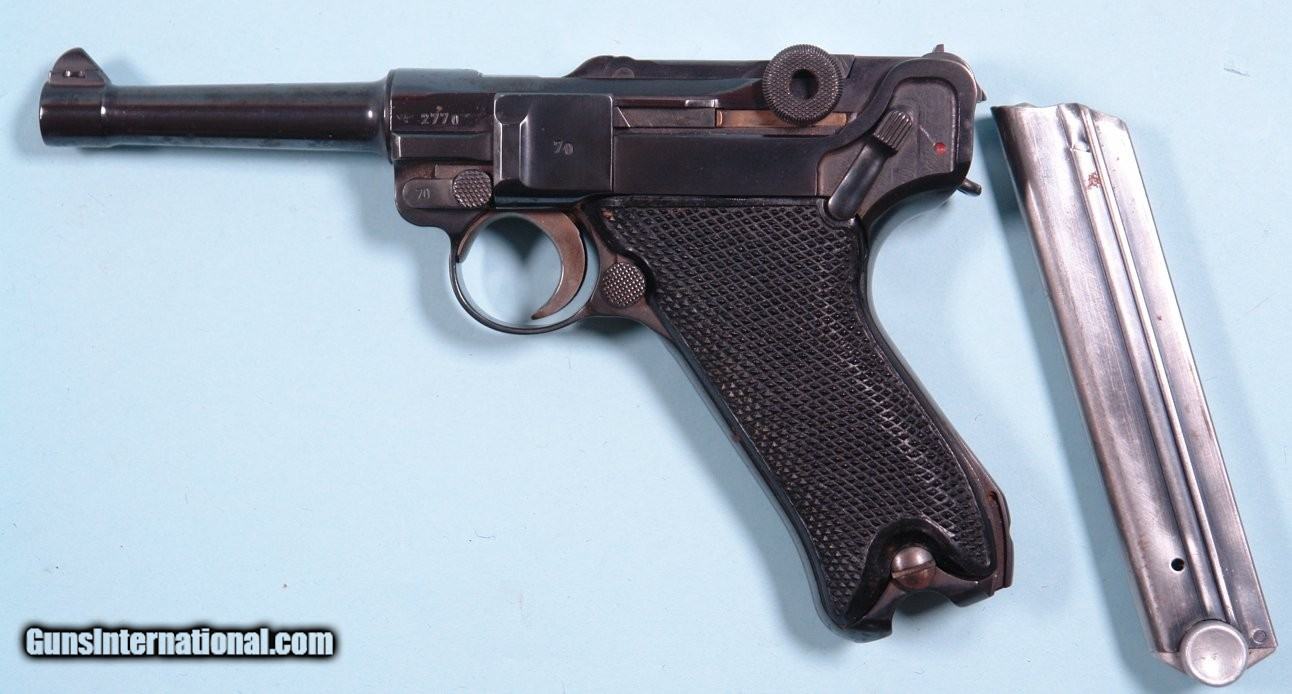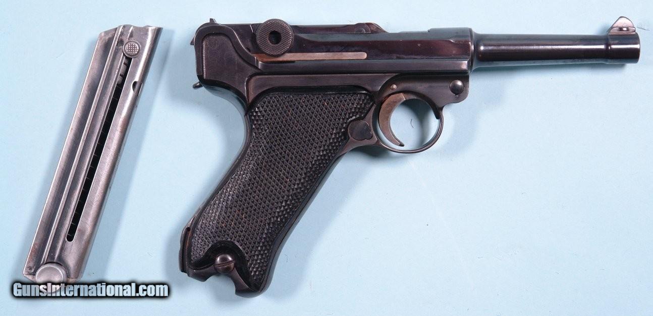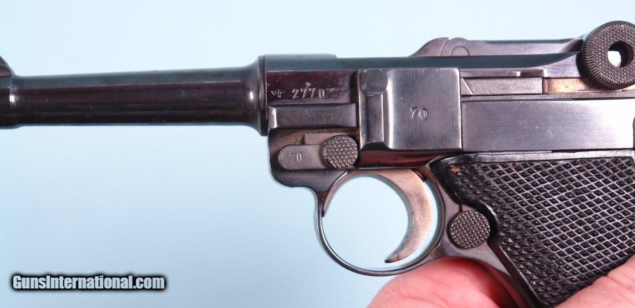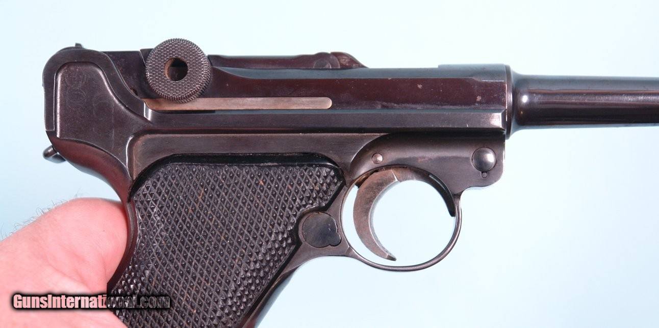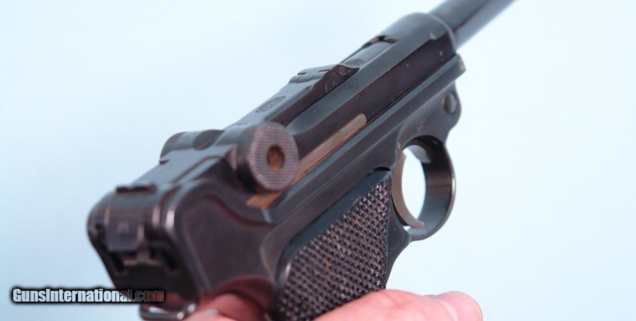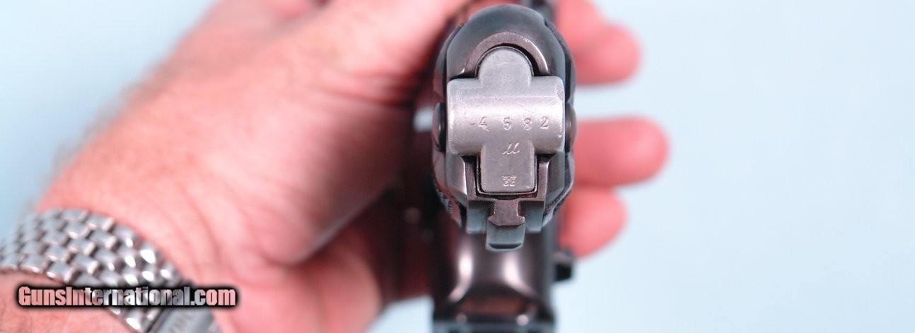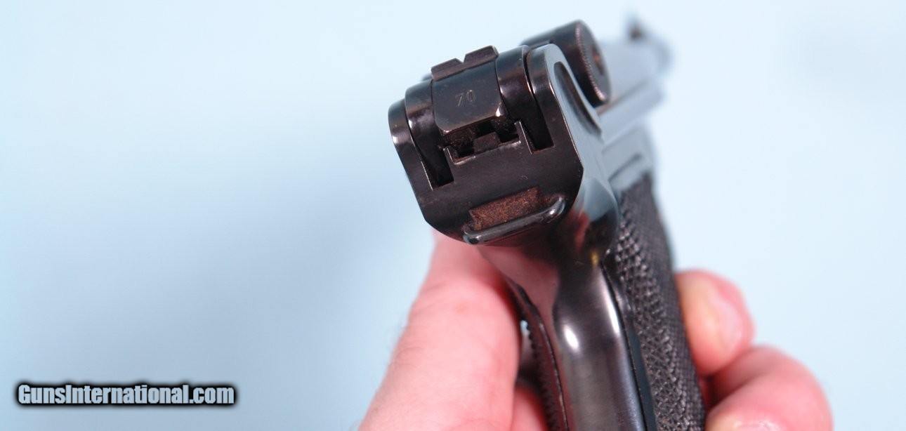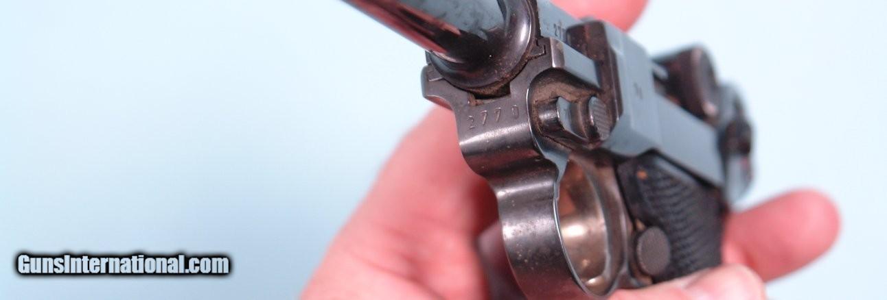 Description: PRE WW2 MAUSER BANNER MODEL 1934 LUGER 9MM PISTOL. All matching (except magazine) “No Date” with Mauser “Banner” logo toggle stamp. Early 27xx serial range. Correctly un-numbered barrel. All original as professionally refinished with correct type for this model composition black plastic grips. Excellent plus blue with 99% plus remaining. Has the original straw finish on trigger and other straw finished parts. Working order and excellent bore. Original military aluminum base magazine with Nazi “EAGLE/63” Ordnance Waffenampt inspection stamp and serial number. SOLD Curio/Relic: Yes Handgun Caliber: 9x19mm Parabellum (9mm Luger, 9x19mm NATO) |