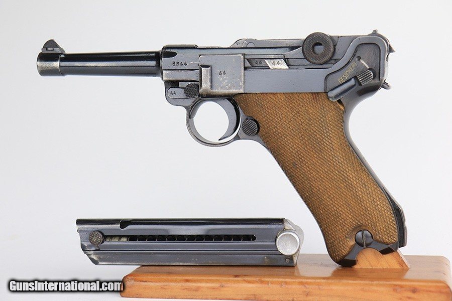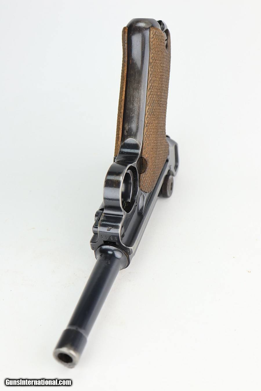 Description: This is a nice example of a rare Mauser Luger issued to the Kriegsmarine in 1940. The gun is all matching and has a "N 3916" Navy property marking on the back strap. This variation is rare, as only about 6,000 were ever produced. This one has retained somewhere between 85-90% of its original finish. Most of the finish loss is on the grip straps. There is minor wear around the muzzle and on the side rails. Light spotty wear on the side plate. A light streak of wear on the left side of the barrel. Fitted with un-numbered wood grips - they are in minty condition, but there is a small chip in the upper corner of the left panel. Comes with a blank-bottom magazine. The bore has strong rifling, but there is light freckling throughout. SOLD Curio/Relic: Yes |