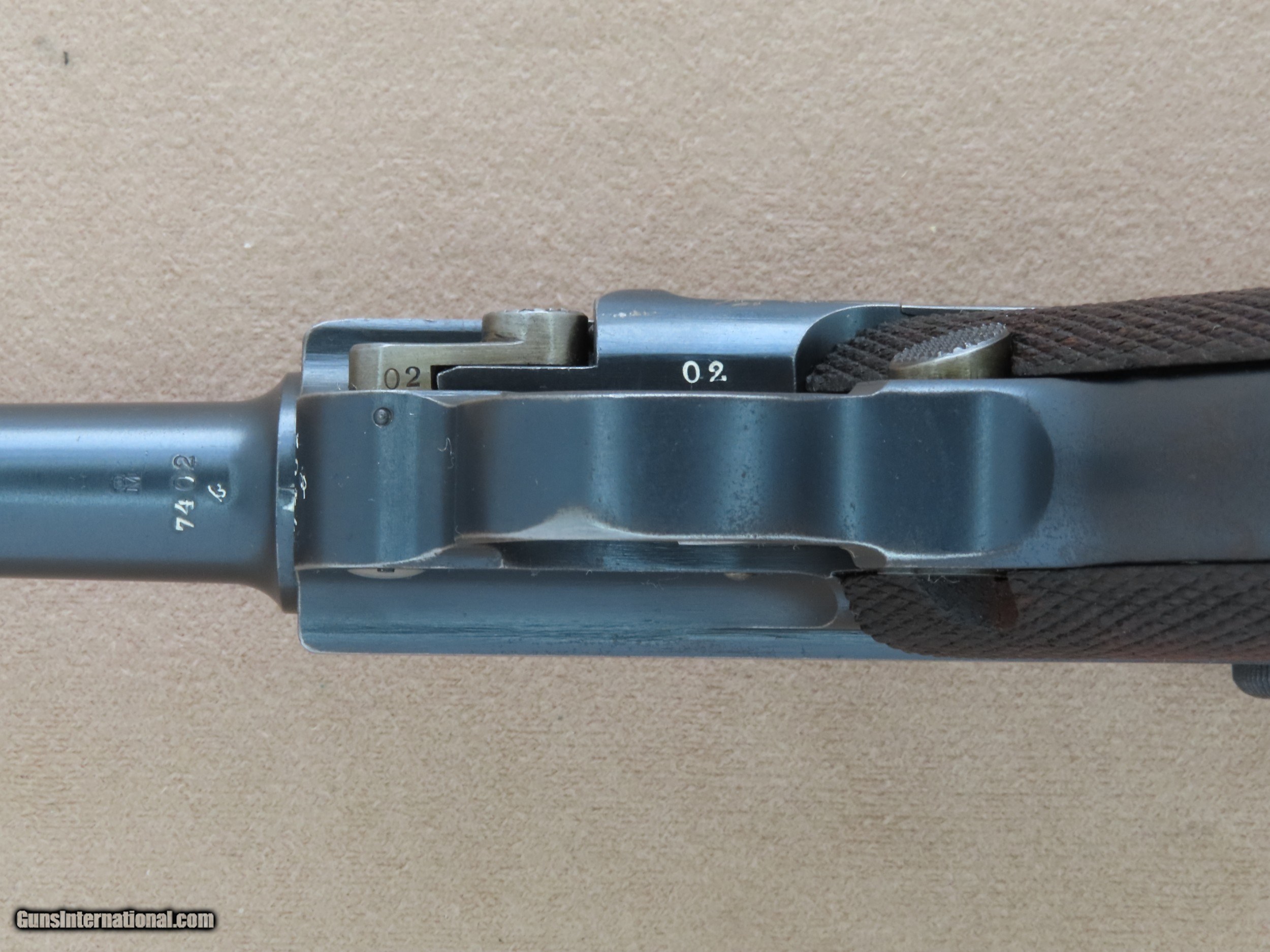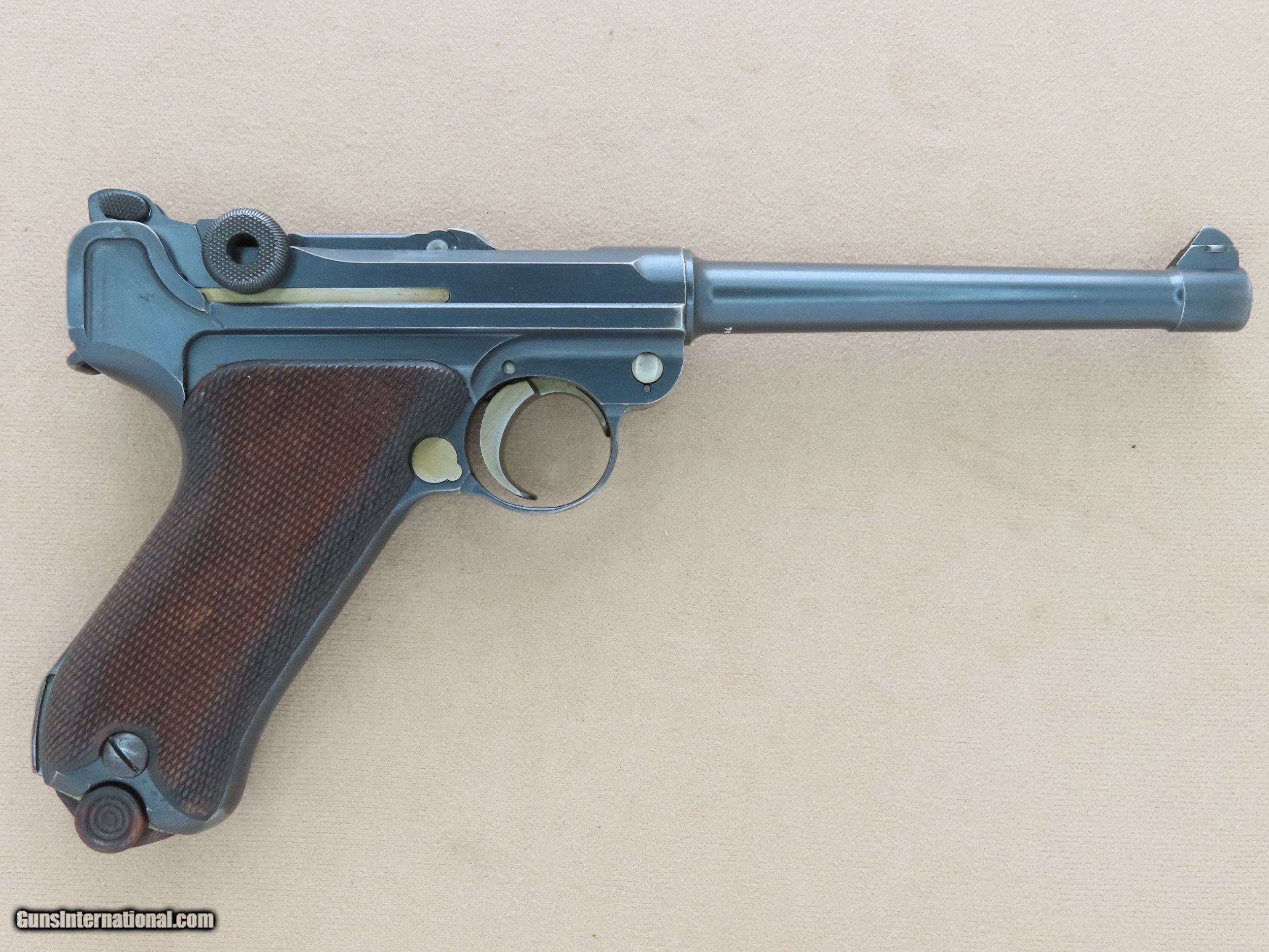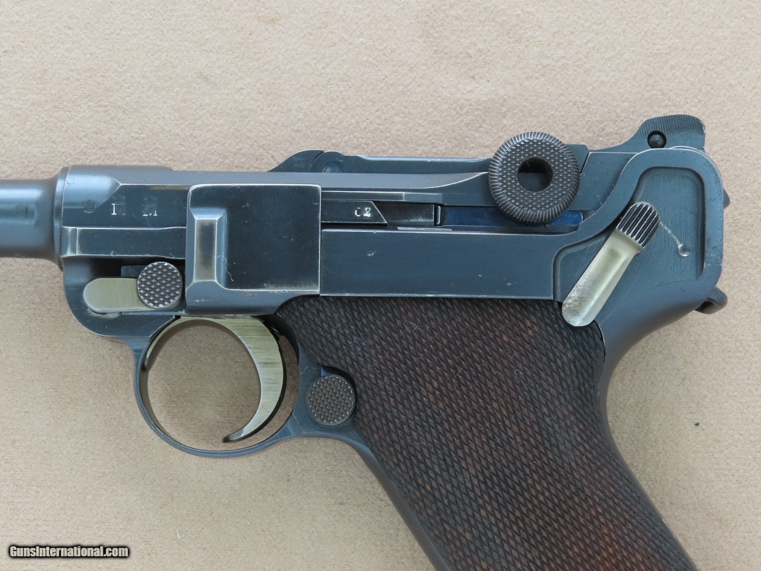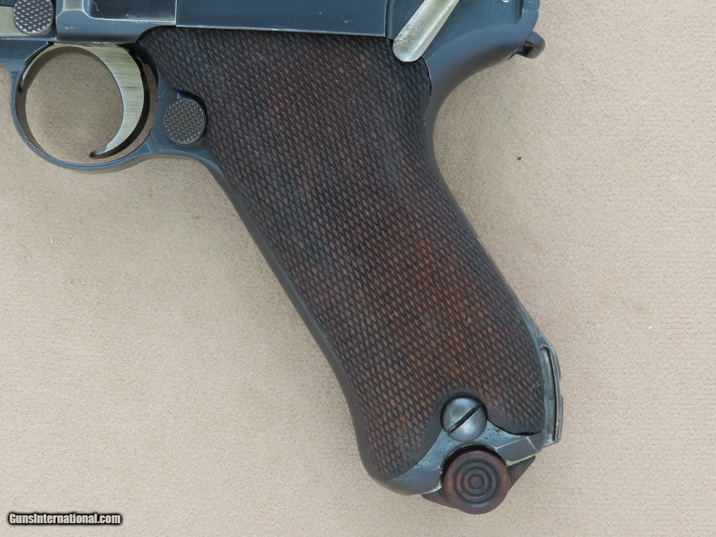 Description: The Imperial German Navy Luger is one of the most sought-after Luger variations in existence. The look of the extended 5.9" inch barrel and 2-position rear sight mated to the Luger's toggle action and distinctive grip is beautiful and very balanced in appearance. These Navy Lugers were designed for German Navy personnel and first accepted into service in 1904, before the the P-08 Luger was accepted into German Military use. The longer barrel and two position rear sight with settings for 100 meters and 200 meters gave the weapon more range and accuracy, particularly paired with a board shoulder stock and holster rig. This was very important for troops that may be periodically involved in defensive and offensive engagements. The weapon was issued to many types of Naval personnel including dockyard guards, coastal artillery troops, submariners, and sailors on many classes of ships. As the years went by the Navy Luger went thru a number of small design/engineering changes, from the first Model 1904 to the Model 1906, then to the Model 1908, and then finally to the Model 1914. The Navy Luger served the Imperial German Navy very well during it's period of service, particularly thru World War 1. This particular example is a Model 1908 Navy, the first Navy Luger without a grip safety unlike the Model 1904 and 1906 Navy Luger. The Model 1908 Navy was manufactured by DWM between early 1914 and August of 1916, with a total production of approximately 8,500 made in the serial range of 1044b to 9505b. This makes this all-original Model 1908 Navy Luger quite rare, as many of them went to the bottom of the Atlantic Ocean as ships were sunk in battle, and many more were ruined from the salty environments in which they were issued and ended up scrapped. This Model 1908 is serial number 7402b, which makes it's date of manufacture late 1915 or the first half of 1916, just before the transition to the Model 1914. This Navy Luger is all-original, all-matching except for the magazine, and unit marked on the rear gripstrap "M.A." over the weapon number "353". We have been unable to decipher what the "M.A." stands for, as the online resources we have found say the meaning is unknown. The original factory blue finish on this Luger is in very good condition overall, showing only some light finish wear in spots and some very minor handling marks. Most of the finish wear is located on the high-edges and grip straps, typical for a holster carried Luger that was well-cared for. The yellow "straw" finish on the trigger, magazine release, safety lever, take-down lever, and ejector is still very nice, showing a lot of bright gold color, particularly in the partially protected areas. The bore in this DWM Navy is beautiful, consistent with the exterior of the gun. The rifling still shows sharp lands and grooves and there is no visible pitting or imperfections. All of the numbered parts in this gun are original and matching. It is serial numbered in the commercial style where many of the numbers are stamped on the edges rather than the flats, and some of the parts that are un-numbered entirely which is correct. All of the DWM factory markings are clean and crisp, and the 3 Imperial German Navy crown proofs on the barrel, left receiver, and breach block are all sharp and visible. The original checkered Walnut grips on this Navy are in great shape, consistent with the rest of the gun. The checkering is still crisp and clean, and both sides are free from any cracks, chips, or repairs. Both grips are perfectly fit to the gun, tight to the grip frame, and un-numbered on the backside which is correct. The action on this Model 1908 Navy is slick and precise, with the toggle action locking into battery with authority when released from the rearward position. All of the controls on this Luger are in perfect working order, and we have no doubt that it would function just as well today as the day it left the factory over 100 years ago. It comes complete with one original Imperial German Navy Luger wood-bottom magazine in good condition, which is period-correct for this gun but is not numbered to this particular gun. This original Navy Luger magazine has the telltale concentric rings on the circular side tabs and the "Crown M" proof on the bottom edge, along with the serial number "1846". The magazine is in perfect working order. If you have been looking for an investment-worthy Luger for your collection this DWM Model 1908 Navy Luger would be a superb choice. This is a very rare and collectible original Navy Luger in beautiful condition, and it should continue to be an excellent long-term investment for the foreseeable future. SOLD Curio/Relic: Yes Manufacturer: Deutsche Waffen und Munitionsfabriken (DWM) Model: 1908 Navy Luger Serial Number: 7402b Caliber Info: 9mm Luger Bore: Excellent Condition: Very Good / Excellent Barrels: 5.9" Inches Extras: Original Navy Luger Magazine, Rear Grip Strap is Stamped "M.A." over "553 |