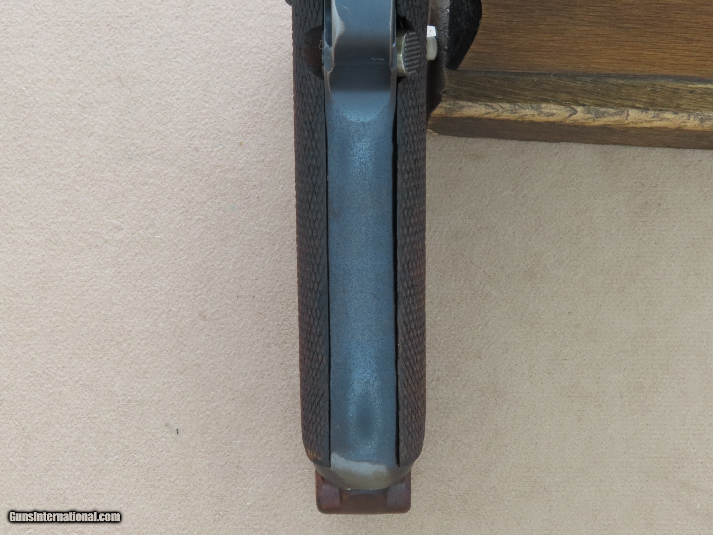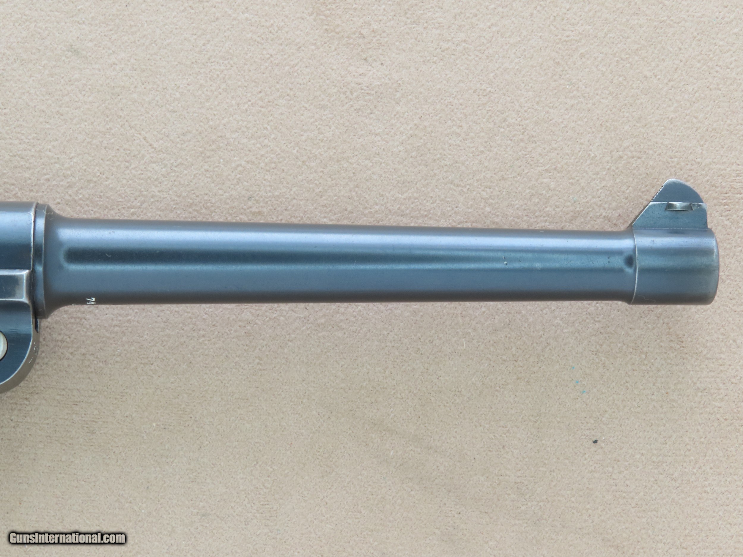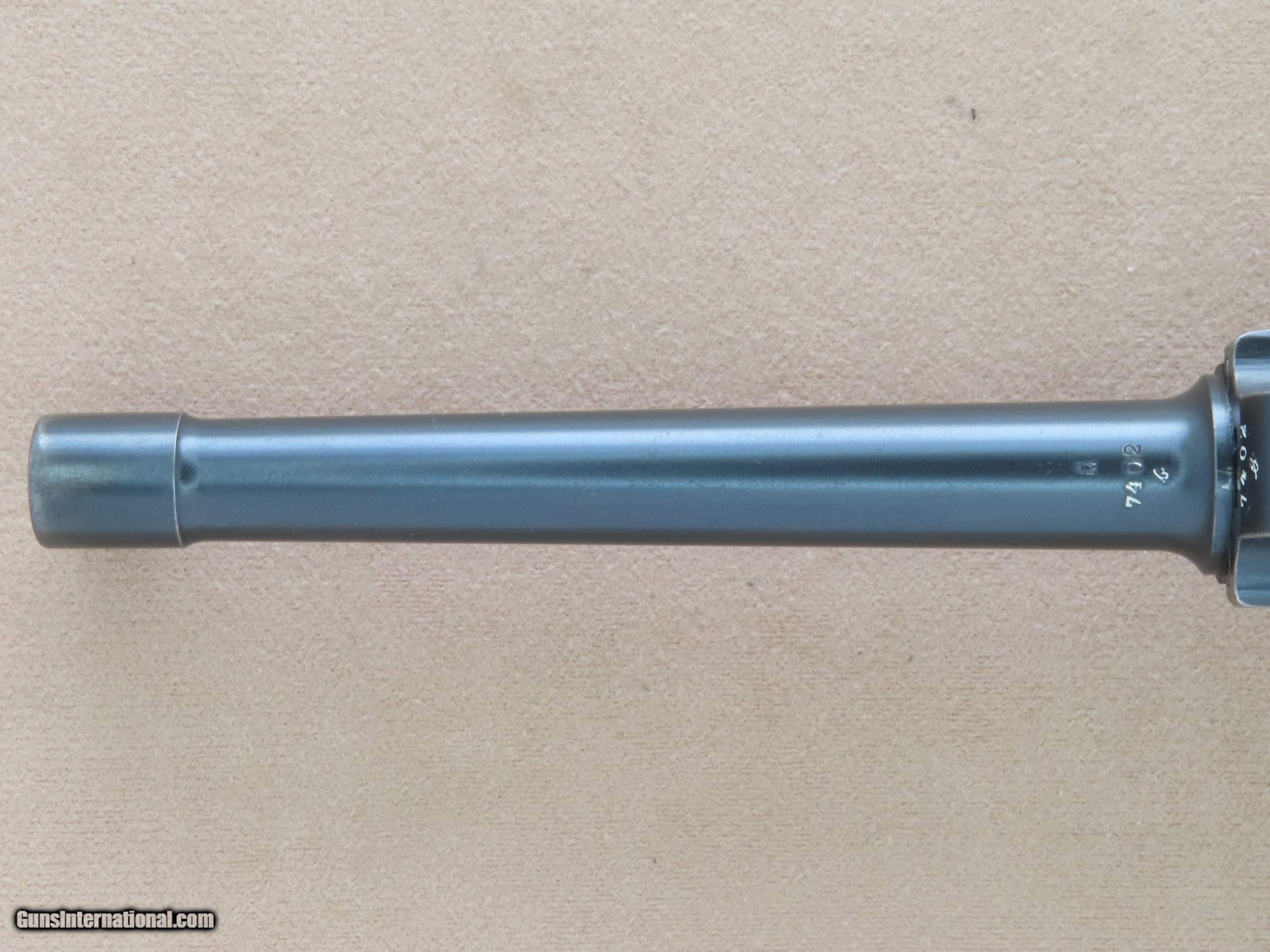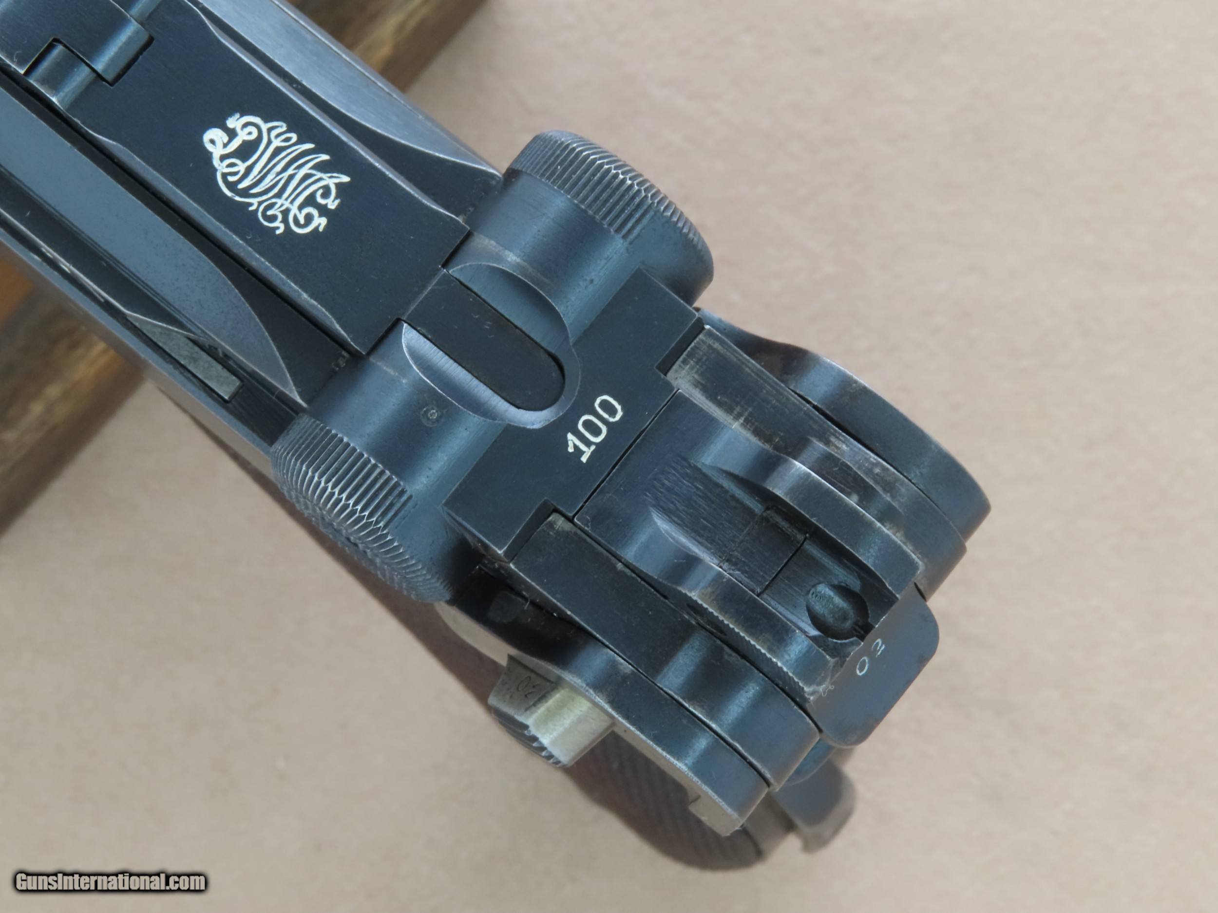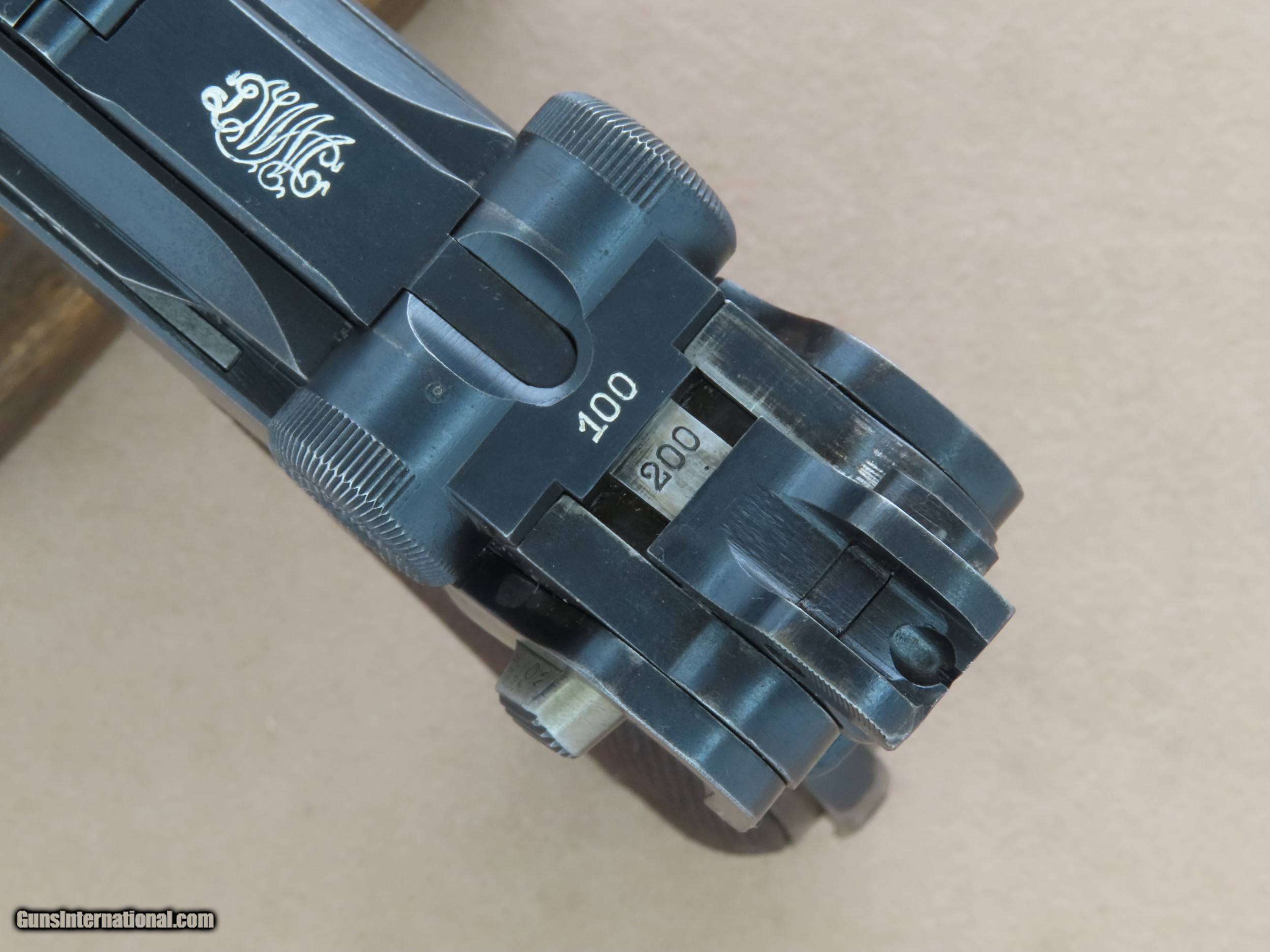 Description: The Imperial German Navy Luger is one of the most sought-after Luger variations in existence. The look of the extended 5.9" inch barrel and 2-position rear sight mated to the Luger's toggle action and distinctive grip is beautiful and very balanced in appearance. These Navy Lugers were designed for German Navy personnel and first accepted into service in 1904, before the the P-08 Luger was accepted into German Military use. The longer barrel and two position rear sight with settings for 100 meters and 200 meters gave the weapon more range and accuracy, particularly paired with a board shoulder stock and holster rig. This was very important for troops that may be periodically involved in defensive and offensive engagements. The weapon was issued to many types of Naval personnel including dockyard guards, coastal artillery troops, submariners, and sailors on many classes of ships. As the years went by the Navy Luger went thru a number of small design/engineering changes, from the first Model 1904 to the Model 1906, then to the Model 1908, and then finally to the Model 1914. The Navy Luger served the Imperial German Navy very well during it's period of service, particularly thru World War 1. This particular example is a Model 1908 Navy, the first Navy Luger without a grip safety unlike the Model 1904 and 1906 Navy Luger. The Model 1908 Navy was manufactured by DWM between early 1914 and August of 1916, with a total production of approximately 8,500 made in the serial range of 1044b to 9505b. This makes this all-original Model 1908 Navy Luger quite rare, as many of them went to the bottom of the Atlantic Ocean as ships were sunk in battle, and many more were ruined from the salty environments in which they were issued and ended up scrapped. This Model 1908 is serial number 7402b, which makes it's date of manufacture late 1915 or the first half of 1916, just before the transition to the Model 1914. This Navy Luger is all-original, all-matching except for the magazine, and unit marked on the rear gripstrap "M.A." over the weapon number "353". We have been unable to decipher what the "M.A." stands for, as the online resources we have found say the meaning is unknown. The original factory blue finish on this Luger is in very good condition overall, showing only some light finish wear in spots and some very minor handling marks. Most of the finish wear is located on the high-edges and grip straps, typical for a holster carried Luger that was well-cared for. The yellow "straw" finish on the trigger, magazine release, safety lever, take-down lever, and ejector is still very nice, showing a lot of bright gold color, particularly in the partially protected areas. The bore in this DWM Navy is beautiful, consistent with the exterior of the gun. The rifling still shows sharp lands and grooves and there is no visible pitting or imperfections. All of the numbered parts in this gun are original and matching. It is serial numbered in the commercial style where many of the numbers are stamped on the edges rather than the flats, and some of the parts that are un-numbered entirely which is correct. All of the DWM factory markings are clean and crisp, and the 3 Imperial German Navy crown proofs on the barrel, left receiver, and breach block are all sharp and visible. The original checkered Walnut grips on this Navy are in great shape, consistent with the rest of the gun. The checkering is still crisp and clean, and both sides are free from any cracks, chips, or repairs. Both grips are perfectly fit to the gun, tight to the grip frame, and un-numbered on the backside which is correct. The action on this Model 1908 Navy is slick and precise, with the toggle action locking into battery with authority when released from the rearward position. All of the controls on this Luger are in perfect working order, and we have no doubt that it would function just as well today as the day it left the factory over 100 years ago. It comes complete with one original Imperial German Navy Luger wood-bottom magazine in good condition, which is period-correct for this gun but is not numbered to this particular gun. This original Navy Luger magazine has the telltale concentric rings on the circular side tabs and the "Crown M" proof on the bottom edge, along with the serial number "1846". The magazine is in perfect working order. If you have been looking for an investment-worthy Luger for your collection this DWM Model 1908 Navy Luger would be a superb choice. This is a very rare and collectible original Navy Luger in beautiful condition, and it should continue to be an excellent long-term investment for the foreseeable future. SOLD Curio/Relic: Yes Manufacturer: Deutsche Waffen und Munitionsfabriken (DWM) Model: 1908 Navy Luger Serial Number: 7402b Caliber Info: 9mm Luger Bore: Excellent Condition: Very Good / Excellent Barrels: 5.9" Inches Extras: Original Navy Luger Magazine, Rear Grip Strap is Stamped "M.A." over "553 |