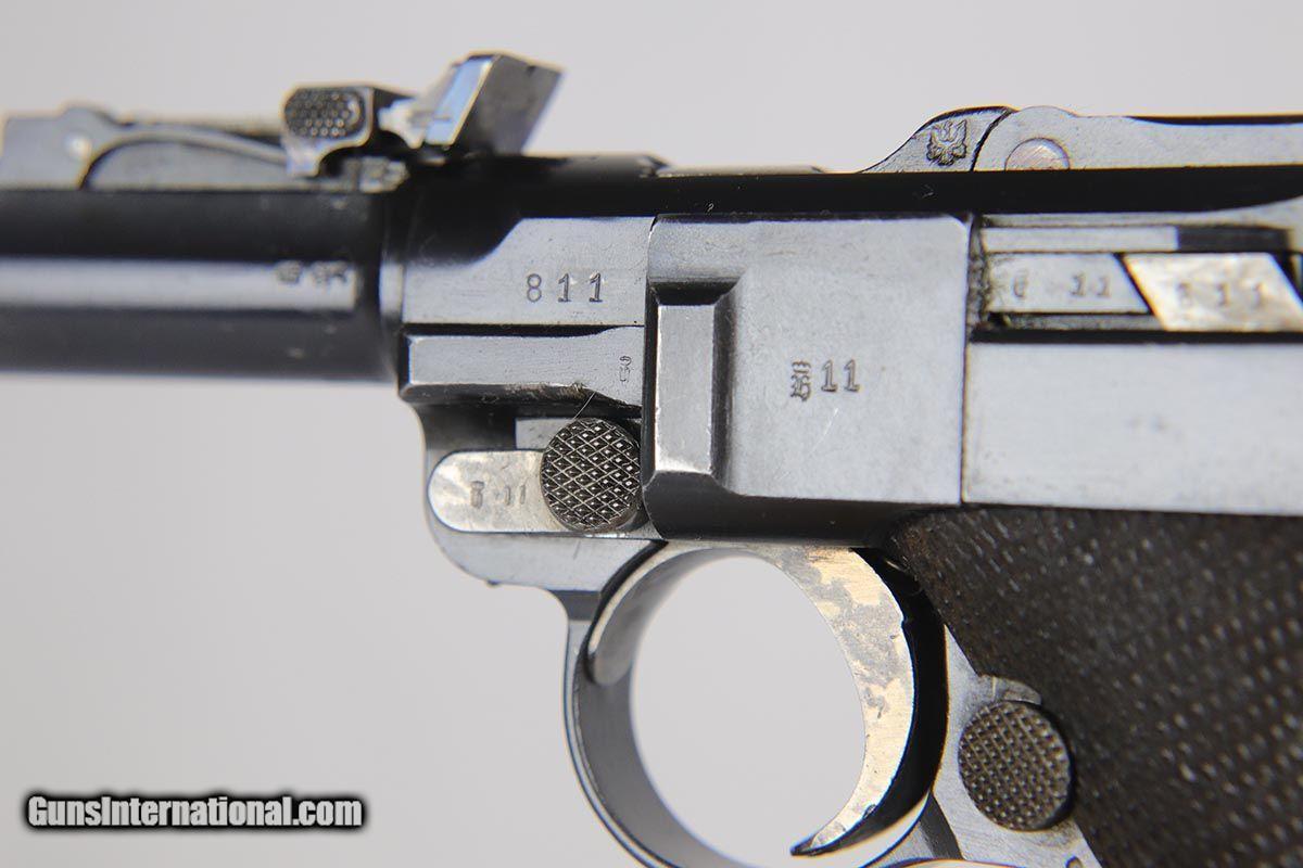 Description: This is one of the earliest recorded Erfurt Artillery Luger rigs, made in 1914, with a 3-digit serial number. It is the 811th Artillery Luger made! It is in an absolutely beautiful original condition, retaining close to 98% of the bluing. It is all matching except for the magazine, and has excellent grips and bore. It has just a hint of edge wear and a small area of old pitting/patina on the stock lug, and a few freckles on the right receiver ear - both detract very little from its overall appearance. The gun is profusely proofed with German Imperial proofmarks and has a high quality rust-blue finish that you can find only on the earliest of Erfurt made guns. With only 20,000 Erfurt artilleries made in the beginning of WWI, it is the second rarest variation, following the 1914 dated DWM production. Many perished in the Great War, and to find such pristine example is next to impossible. The pistol comes as part of a rig, with correct holster, stock and cleaning rod that are numbered to a different gun. The holster is maker marked and in very good condition, as is the stock, which is properly Imperial proofed. SOLD Curio/Relic: Yes Manufacturer: Erfurt Model: P.08 Artillery Serial Number: 811 Caliber Info: 9mm Bore: 9/10 Condition: 98%+ Manufacture Date: 1914 |