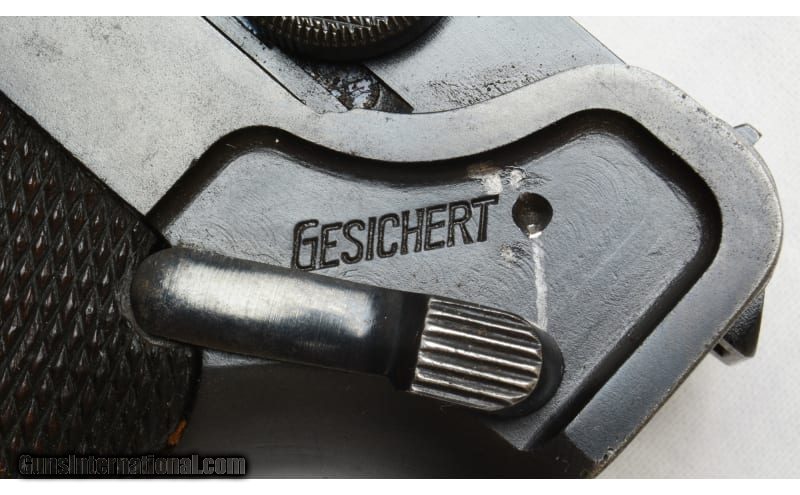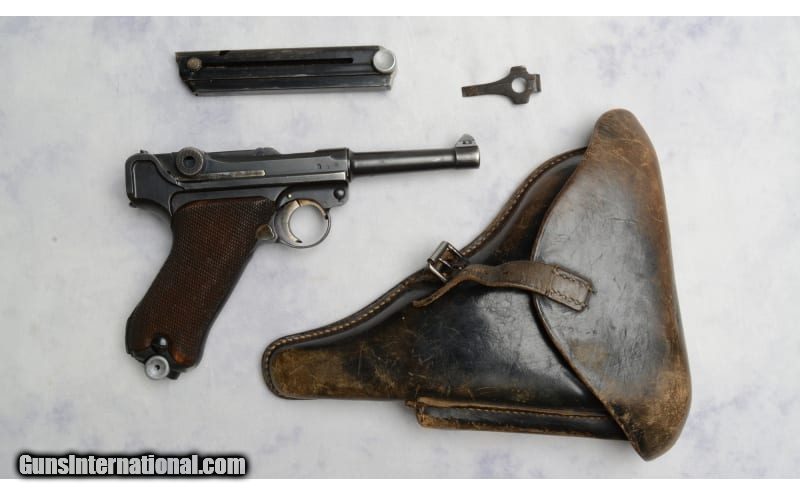 Description: This S/42 (Mauser) Luger features; 4" Barrel, Matching External Numbers, SE 63/SE 63/ Droop Eagle Proofs on Receiver, Droop Eagle Proof on Barrel. "GESICHERT" Stamp, Fixed Integral Sights, Two (2) Non-matching Aluminum Bottom Magazines, Black Hardshell Holster by Hans Romer, Neu-Ulm 1936, has Droop Eagle "WaA101" Stamp, and Takedown Tool. Unknown SOLD Chambers: Unmarked Metal Condition: Good Wood Condition: Good Bore Condition: Good Barrels: 4 Sights: Fixed Integral Item Location: Green Bay |