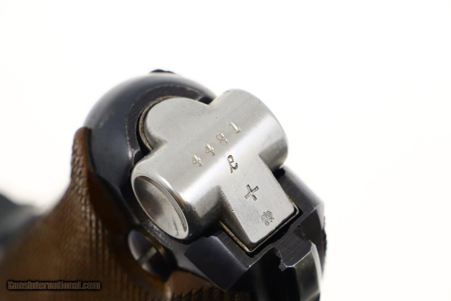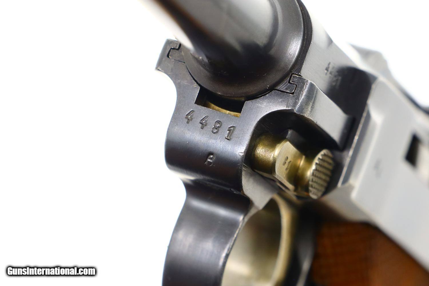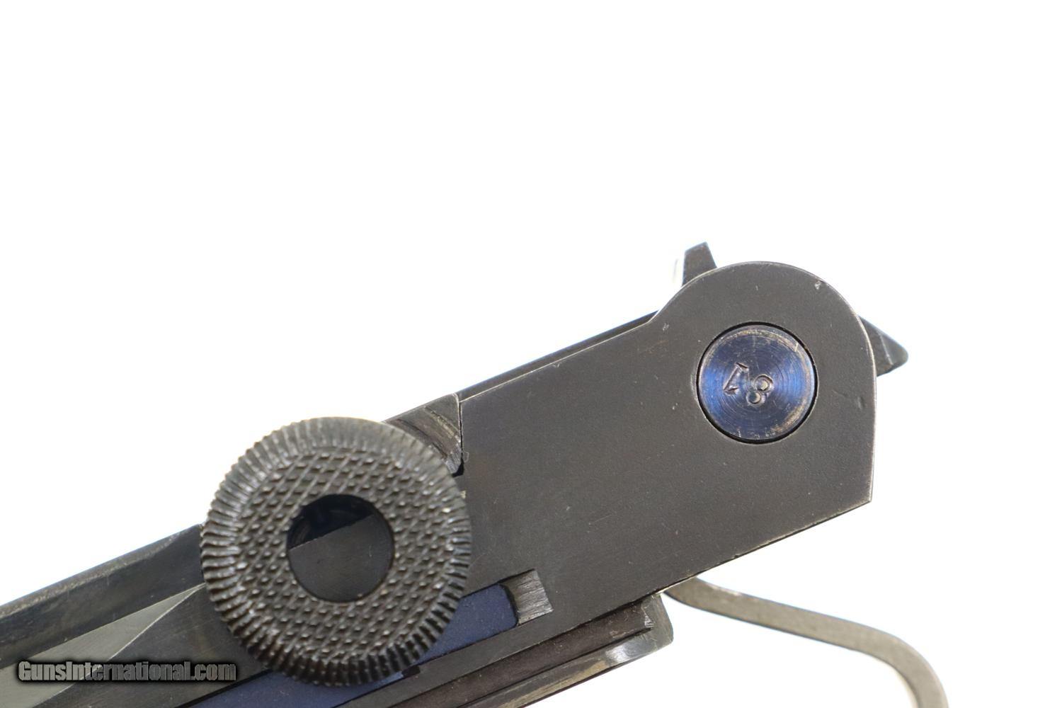 Description: Synopsis: Extremely attractive Mauser G-date Luger made in 1935, all matching to include original matching magazine. Description: Standard configuration military Luger made by Mauser in 1925 with G-date chamber code and S/42 toggle. Usual 4-inch barrel with drift adjustable front sights, and v-notch rear sight. Full serial number with letter suffix on forward frame, with SN repeated under barrel and on left side of barrel extension. Military proofs on right side of barrel extension. Last 2 digits on all of the usual small parts, except for unmarked grips. Original magazine with full serial number/'+' reflecting its use as a spare magazine. Major components rust blued; small parts strawed except for the fire blued toggle pins and grip screws. Condition: Near excellent original finish, excepting touchup/partial restoration of the frame. Excellent straw parts showing no enhancement. Grip screws with enhanced fire blue. Very bright bore with minimal etching and sharp rifling. Perfect manual mechanics. A great looking G-date Luger with crisp, original matching magazine! ~~Insured shipping fee of $75; most packages shipped using FedEx 2nd Day.~~ SOLD Curio/Relic: Yes Manufacturer: Mauser Serial Number: 4481 e Caliber Info: 9mm P |