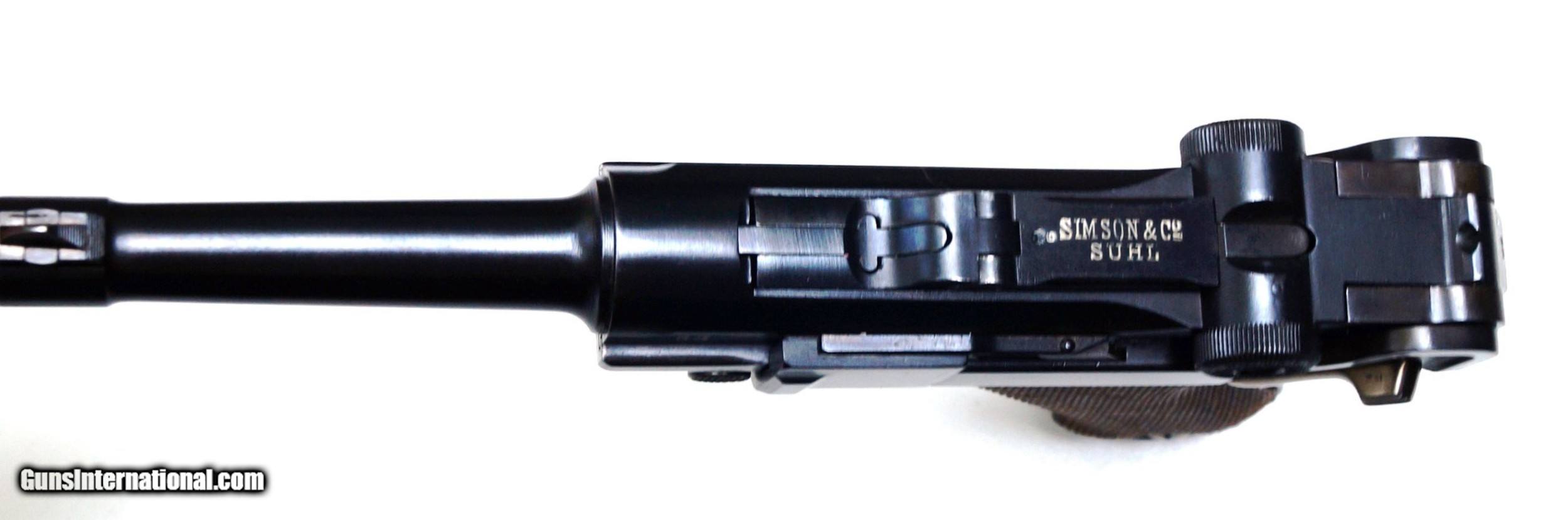 Description: THIS IS A SIMSON / SUHL POLICE GERMAN LUGER RIG, 9MM. THE LUGER IS IN VERY GOOD CONDITION. ALL ORIGINAL, NUMBER MATCHING (THIS INCLUDES BOTH GRIPS AND MAGAZINE), VERY GOOD BORE AND GRIPS, MECHANICALLY CORRECT (IT WILL SHOOT). THE RIG CONSISTS OF THE LUGER, 2 ORIGINAL MAGAZINES (1 NUMBERED TO THE GUN), 1 ORIGINAL POLICE HOLSTER AND 1 SIMSON PROOF MARKED LOADING TOOL.THIS LUGER IN MY OPINION IS A PRE-1920s COMMERCIAL DWM LUGER REMANUFACTURED BY SIMSON. IT HAS BOTH SIMSON PROOF MARKINGS AND COMMERCIAL PROOF MARKINGS. A VERY RARE SIMSON AND IN VERY GOOD CONDITION. A MUST SIMSON FOR THE SIMSON LUGER COLLECTOR. SOLD Curio/Relic: Yes |