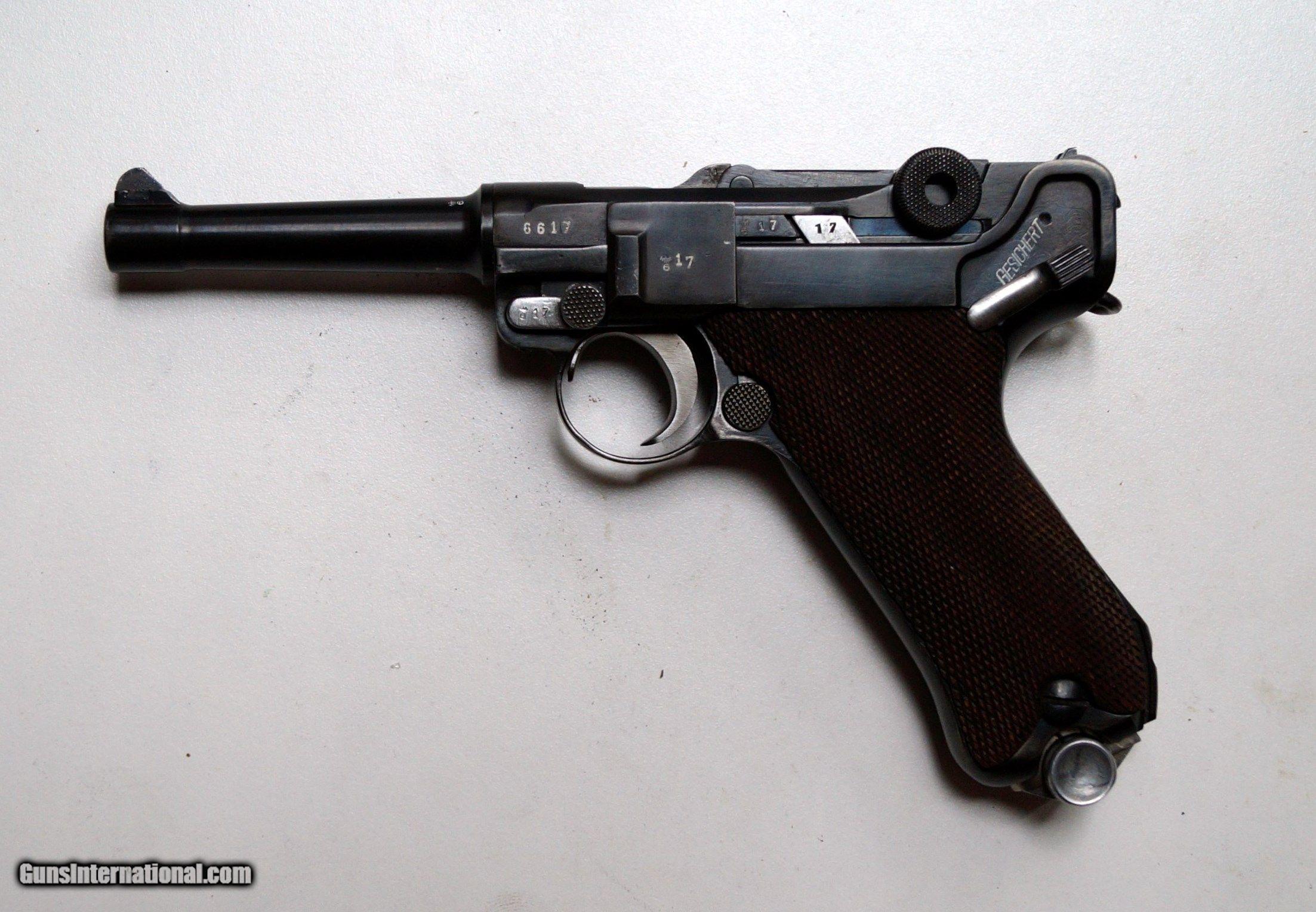 Description: THIS IS A SIMSON SUHL GERMAN LUGER RIG, 9MM. THE LUGER IS IN VERY GOOD CONDITION. NUMBER MATCHING (THIS INCLUDES BOTH SIMSON PROOFED MAGAZINES, THE INSIDE OF THE GRIPS AND THE LOADIING TOOL), VERY GOOD BORE AND GRIPS, MECHANICALLY CORRECT AND TIGHT. THE RIG CONSISTS OF THE LUGER, 2 MAGAZINES, 1 ORIGINAL GERMAN LUGER HOLSTER AND 1 ORIGINAL LOADING TOOL. SIMSON SUHL LUGERS ARE RARE TO FIND AND 2 FIND ONE WITH MATCHING MAGAZINES AND TOOL IS EVEN RARER. SOLD Curio/Relic: Yes |