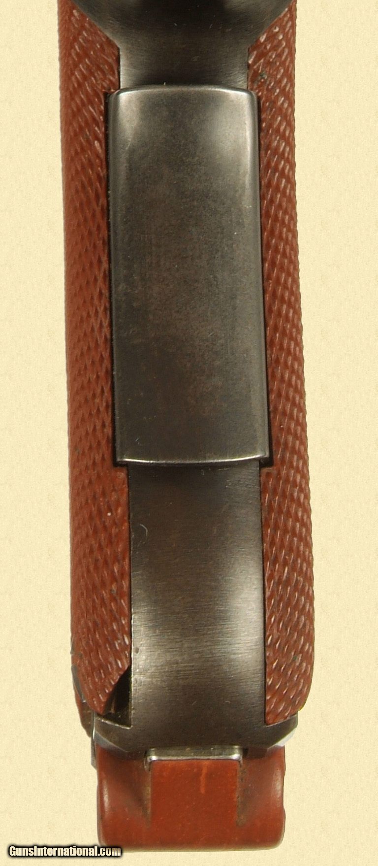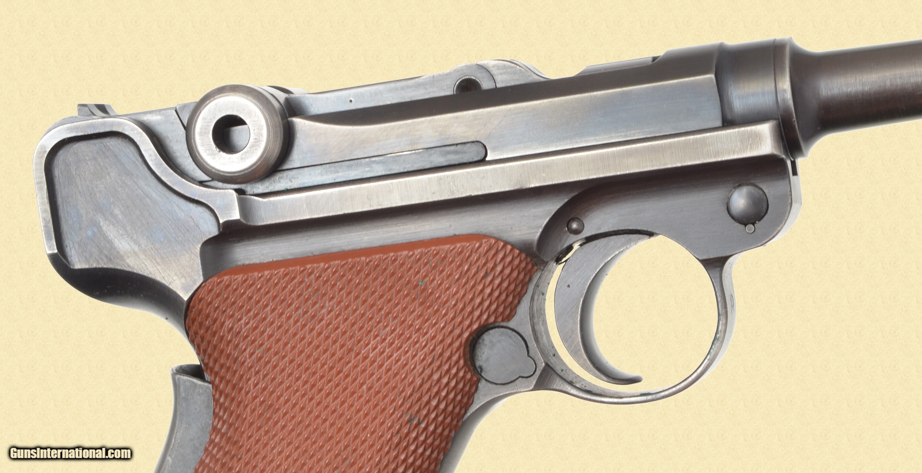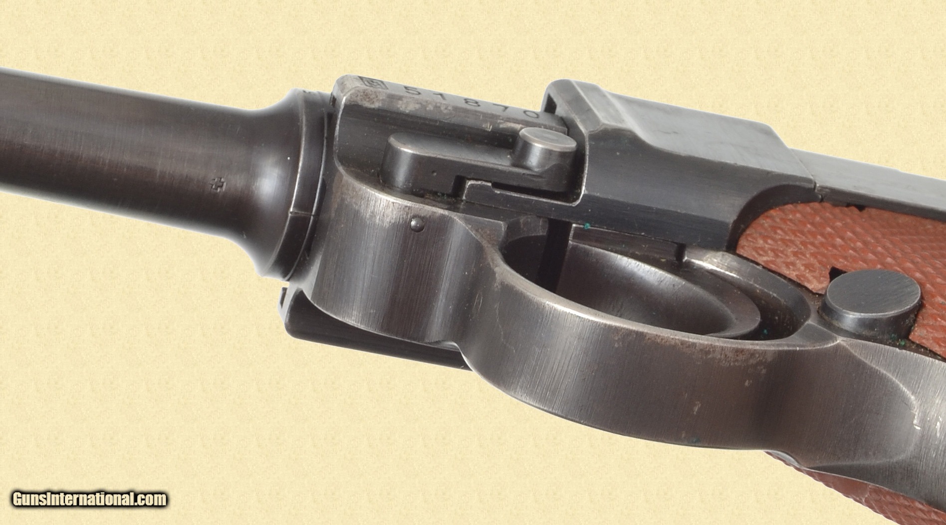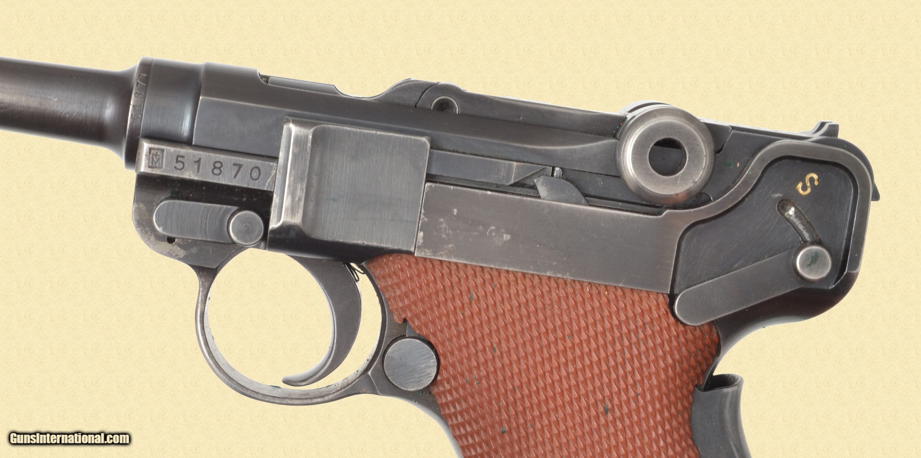 Description: 30 LUGER; 85% blue, excellent bore, very good grips, 4.75'' barrel, Made in 1934. Original blue finish and checkered red plastic grips. Stamped on top of the toggle with the Swiss Cross in Shield. The back of the frame is stamped with the F+W mark and the left side rail is stamped with a +/M proof. Complete with one original Swiss red bottom magazine stamped with a P low on the spine. The numbered parts are matching. The finish shows wear and thinning overall. The grips show some handlng with some smoothed points on the checkering. The magazine base has small chips on the sides of the base. Rig, includes a 1932 dated leather holster with shoulder strap in good original intact condition and an extra Swiss brown plastic bottom magazine. Please call (309)342-5800 Tues-Fri, 10 am -6pm (CST), or Sat 1pm-6pm (CST), to speak with our sales team for further information, or to purchase firearms. FEDERAL FIREARMS LICENSE (FFL): is required on all shipments of modern guns. We must wait for a copy from your dealer before we can ship to them. We will also ship C&R eligible firearms to Curio and Relic (C&R) license holders. We accept your signed, legible FFL and C&R licenses via fax at 309/ 342-5730 (always on), email at FFLsimpsonltd or through the mail at Simpson Ltd; 140 S Seminary St; Galesburg, IL 61401. Pre-1898 firearms and non-firearms items are exempt from licensing requirements. All items shipped to an Illinois address will be charged 8.75% sales tax. NOTE: Because of recent shipping restrictions and charges placed on us by UPS and FedEx (handguns must ship via next day or 2nd day air and they have added a $10 surcharge for parcels over 48”. Our return policy lasts a maximum of 3 days from the time you receive your item. If 3 days have passed since you received your purchase, and we have not been contacted by you, unfortunately, we can’t offer you a refund or exchange. If you are not happy with your purchase, please contact us by phone and/or email to arrange for a return. Items must be shipped back to us to arrive with 7 days of notification of return. SOLD Curio/Relic: Yes Serial Number: 51870 |
