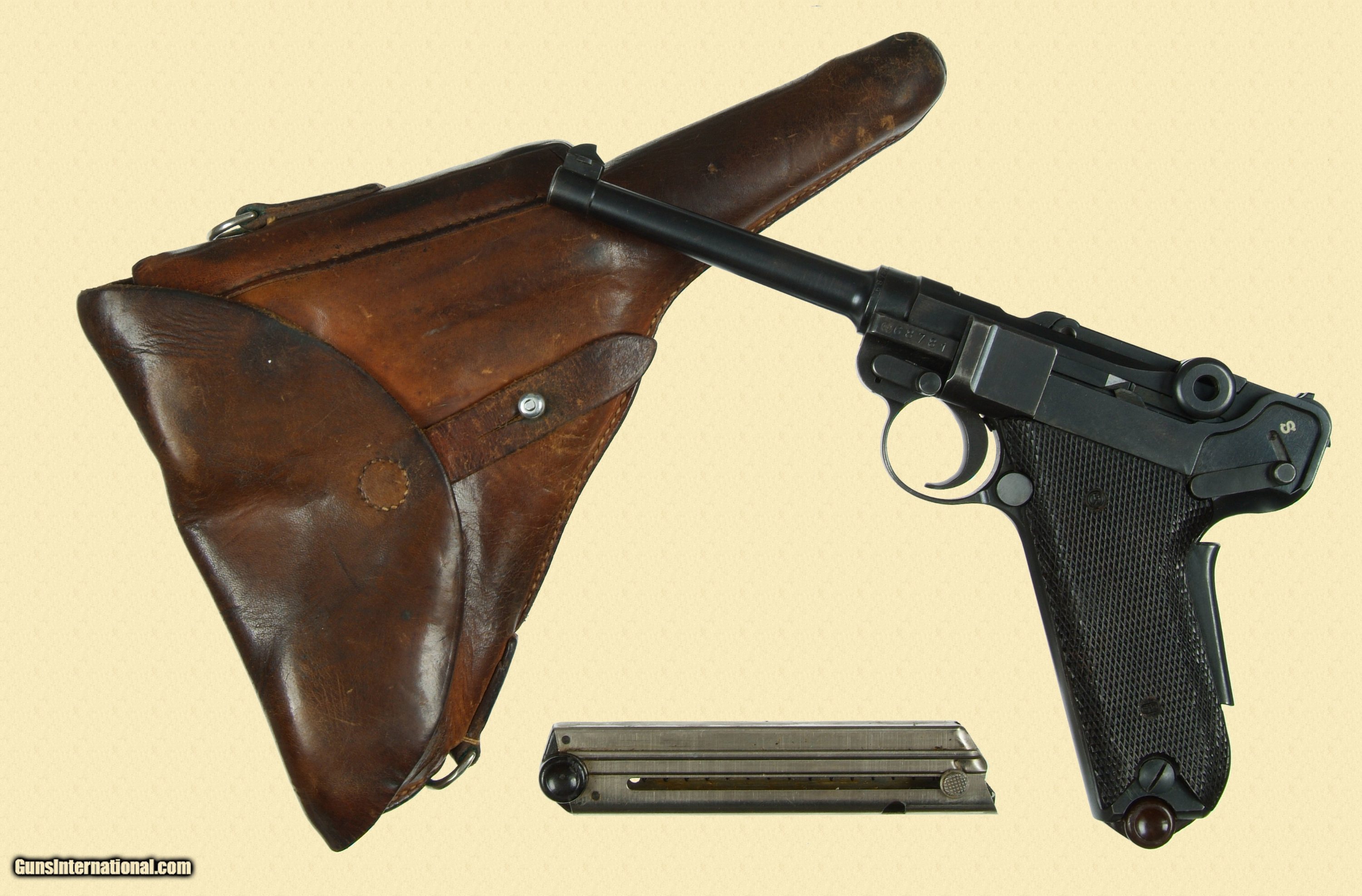 Description: 30 LUGER; 97% blue, excellent bore, excellent grips, 4.75'' barrel, Manufactured in 1943 with original blue finish and checkered black plastic grips. Stamped on top of the toggle with the Swiss Cross in Shield and on the back of the frame with the F+W mark, which appears on the left side rail as well. The right side of the frame has a P private purchase stamp. Matching numbers except for the sideplate. The metal finish shows lgiht holstering and minor edge wear. The grips are excellent with sharp checkering. Complete with an original Swiss brown plastic bottom magazine stamped with a P low on the spine. Includes a 1944 dated military leather holster in good original intact condition., Please call (309)342-5800 Tues-Fri, 10 am -6pm (CST), or Sat 1pm-6pm (CST), to speak with our sales team for further information, or to purchase firearms. FEDERAL FIREARMS LICENSE (FFL): is required on all shipments of modern guns. We must wait for a copy from your dealer before we can ship to them. We will also ship C&R eligible firearms to Curio and Relic (C&R) license holders. We accept your signed, legible FFL and C&R licenses via fax at 309/ 342-5730 (always on), email at FFLsimpsonltd or through the mail at Simpson Ltd; 140 S Seminary St; Galesburg, IL 61401. Pre-1898 firearms and non-firearms items are exempt from licensing requirements. All items shipped to an Illinois address will be charged 8.75% sales tax. NOTE: Because of recent shipping restrictions and charges placed on us by UPS and FedEx (handguns must ship via next day or 2nd day air and they have added a $10 surcharge for parcels over 48”. Our return policy lasts a maximum of 3 days from the time you receive your item. If 3 days have passed since you received your purchase, and we have not been contacted by you, unfortunately, we can’t offer you a refund or exchange. If you are not happy with your purchase, please contact us by phone and/or email to arrange for a return. Items must be shipped back to us to arrive with 7 days of notification of return. SOLD Curio/Relic: Yes Serial Number: 68781 |
