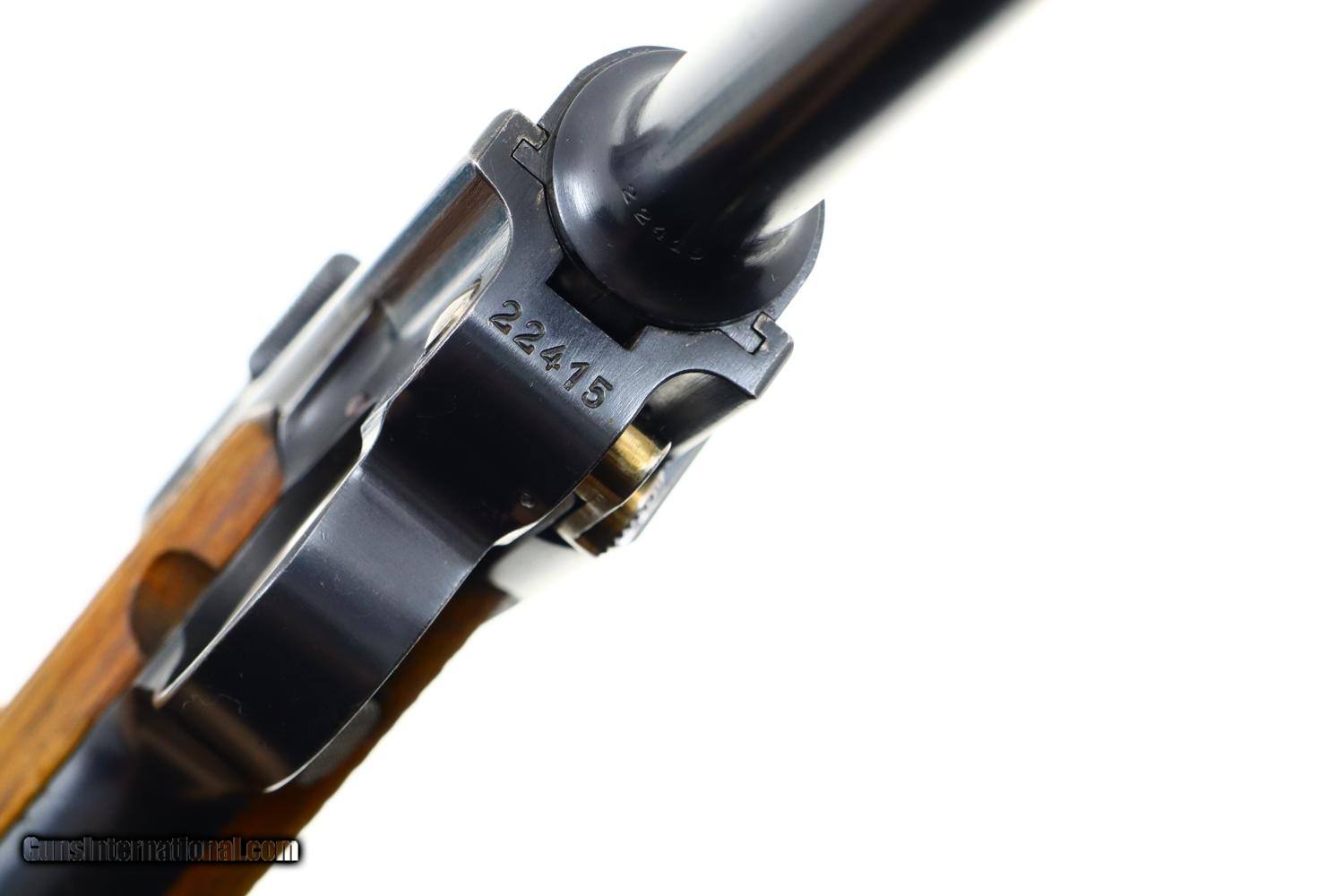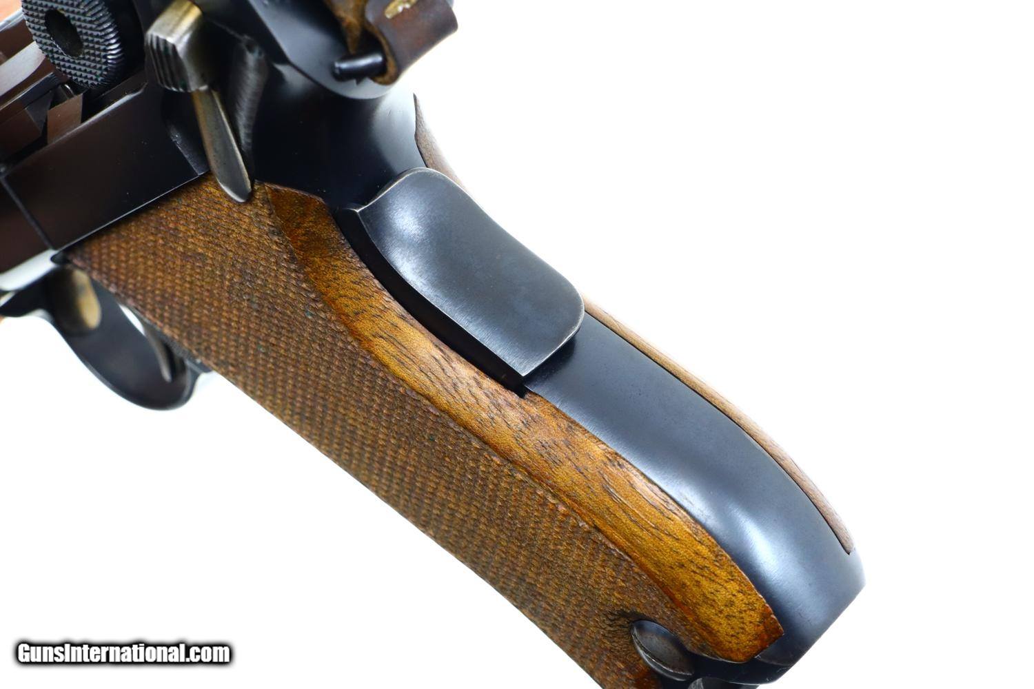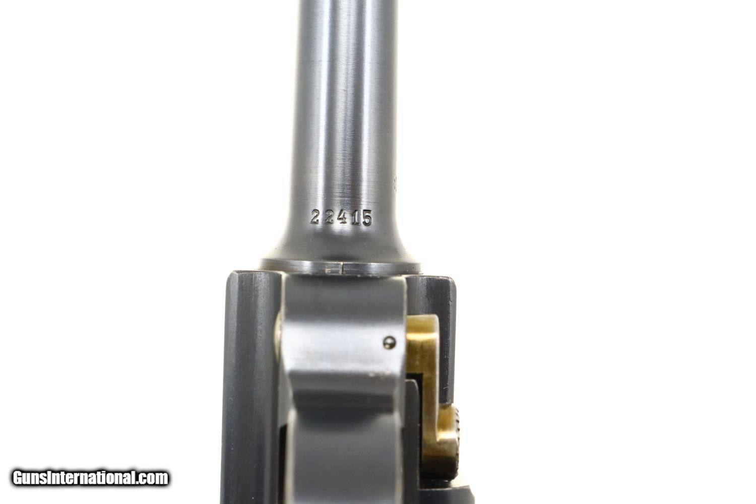 Description: Standard configuration Bern 1924, 7.65mm Luger, with 4.75” barrel having drift adjustable fire blued front sight and fixed rear sight. Blank chamber. Middle link with WAFFENFABRIK BERN. “P53” release on left rail. Full serial number under barrel and forward frame with the last few digits under the sideplate, trigger, barrel extension, and on all three components of the toggle, grip safety and each of the grips. Scattered Swiss crosses in usual locations. Strawed takedown lever, trigger, magazine release button, ejector and safety lever. Correct magazine with tinned body and walnut plug marked “15”. Complete with Lothar Walther conversion kit marked for 7.65 Para/4mm with eight inserts, no box. Synopsis: A very high, original condition Swiss 1924 Bern Military Luger with an unusual 4mm Lothar Walther conversion kit. Condition: Beautiful, bright rust blue, at least 98%, only minimal sharp edge wear as one might expect from a pistol that has not seen much service. Small parts with richly retempered strawing. Comparable condition front and backstraps. Near excellent grips and magazine. Mirror bore. Perfect manual mechanics. Excellent Lothar Walther conversion kit components. A very high, original condition Swiss 1924 Bern Military Luger with a 4mm Lothar Walther conversion kit. ~~Insured shipping fee of $65; most packages shipped using FedEx 2nd Day.~~ SOLD Manufacturer: Bern Serial Number: 22415 Caliber Info: 7.65mm Luger |
