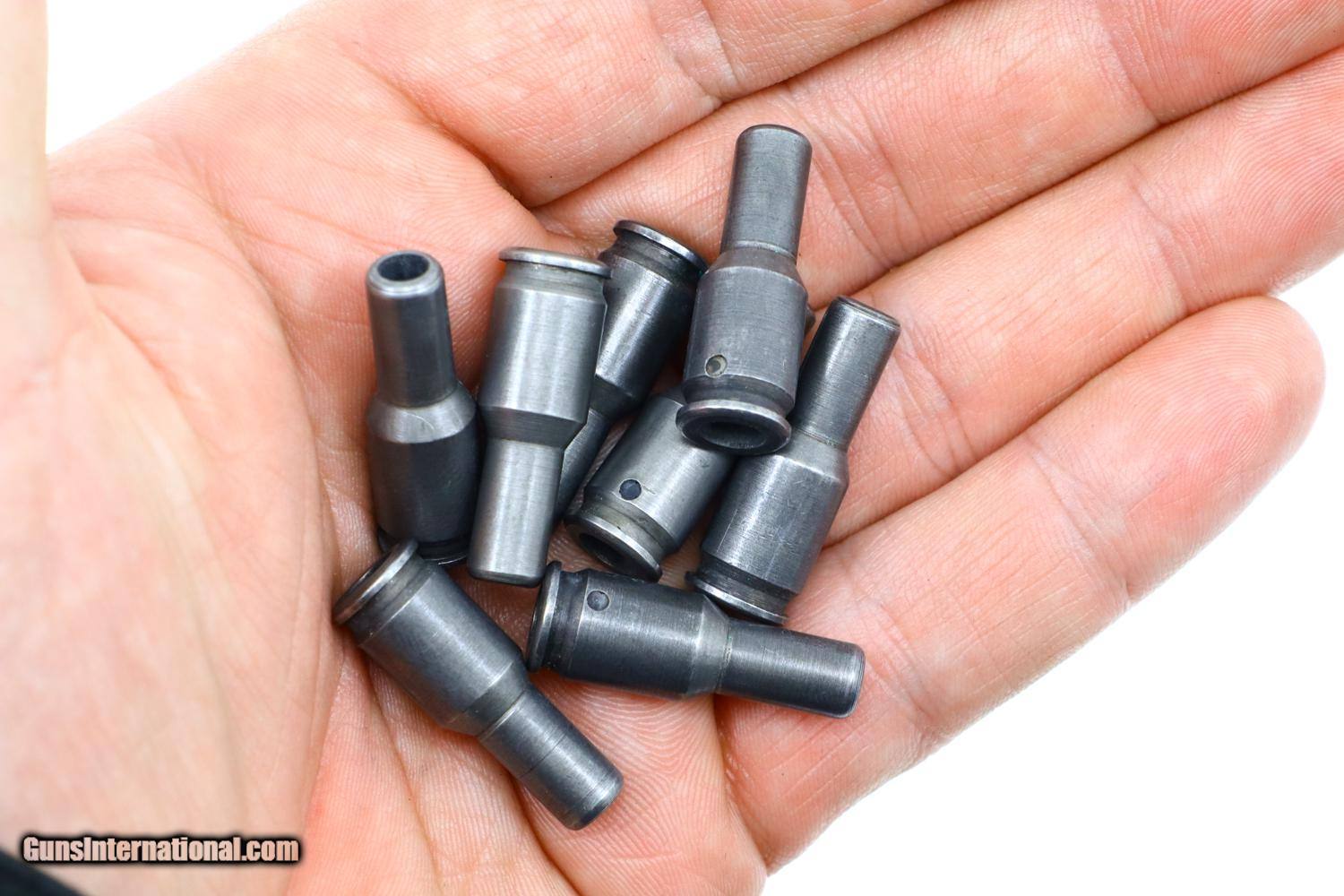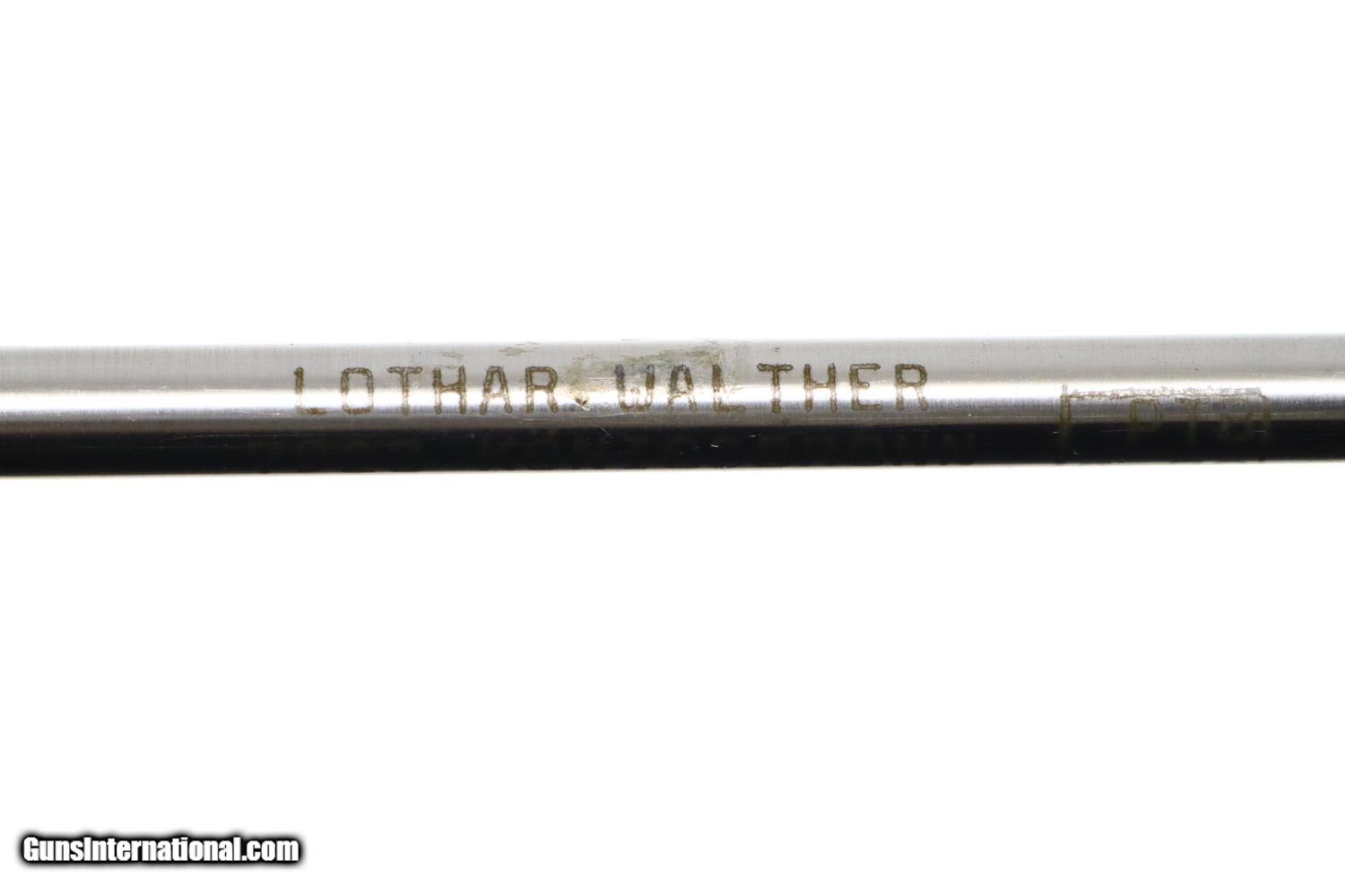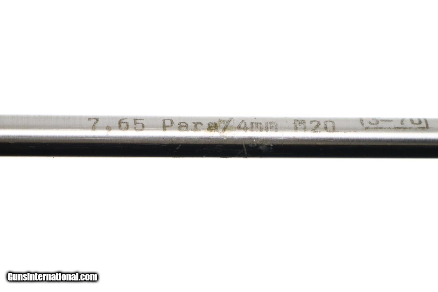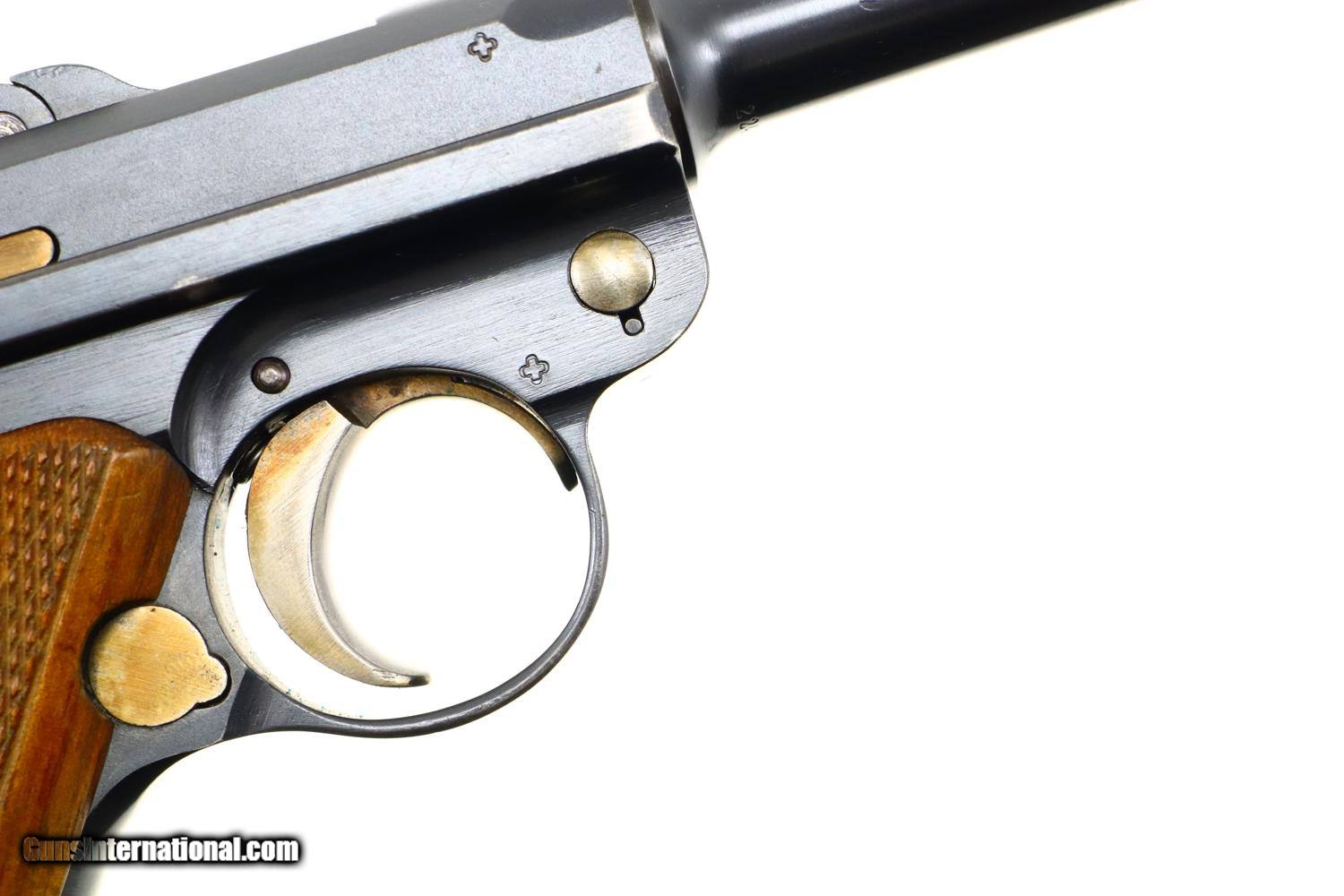 Description: Standard configuration Bern 1924, 7.65mm Luger, with 4.75” barrel having drift adjustable fire blued front sight and fixed rear sight. Blank chamber. Middle link with WAFFENFABRIK BERN. “P53” release on left rail. Full serial number under barrel and forward frame with the last few digits under the sideplate, trigger, barrel extension, and on all three components of the toggle, grip safety and each of the grips. Scattered Swiss crosses in usual locations. Strawed takedown lever, trigger, magazine release button, ejector and safety lever. Correct magazine with tinned body and walnut plug marked “15”. Complete with Lothar Walther conversion kit marked for 7.65 Para/4mm with eight inserts, no box. Synopsis: A very high, original condition Swiss 1924 Bern Military Luger with an unusual 4mm Lothar Walther conversion kit. Condition: Beautiful, bright rust blue, at least 98%, only minimal sharp edge wear as one might expect from a pistol that has not seen much service. Small parts with richly retempered strawing. Comparable condition front and backstraps. Near excellent grips and magazine. Mirror bore. Perfect manual mechanics. Excellent Lothar Walther conversion kit components. A very high, original condition Swiss 1924 Bern Military Luger with a 4mm Lothar Walther conversion kit. ~~Insured shipping fee of $65; most packages shipped using FedEx 2nd Day.~~ SOLD Manufacturer: Bern Serial Number: 22415 Caliber Info: 7.65mm Luger |