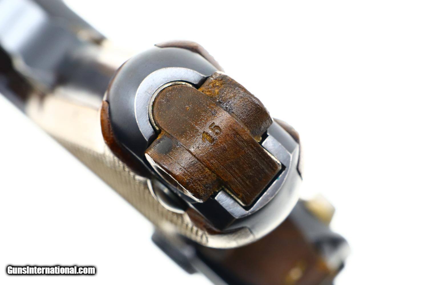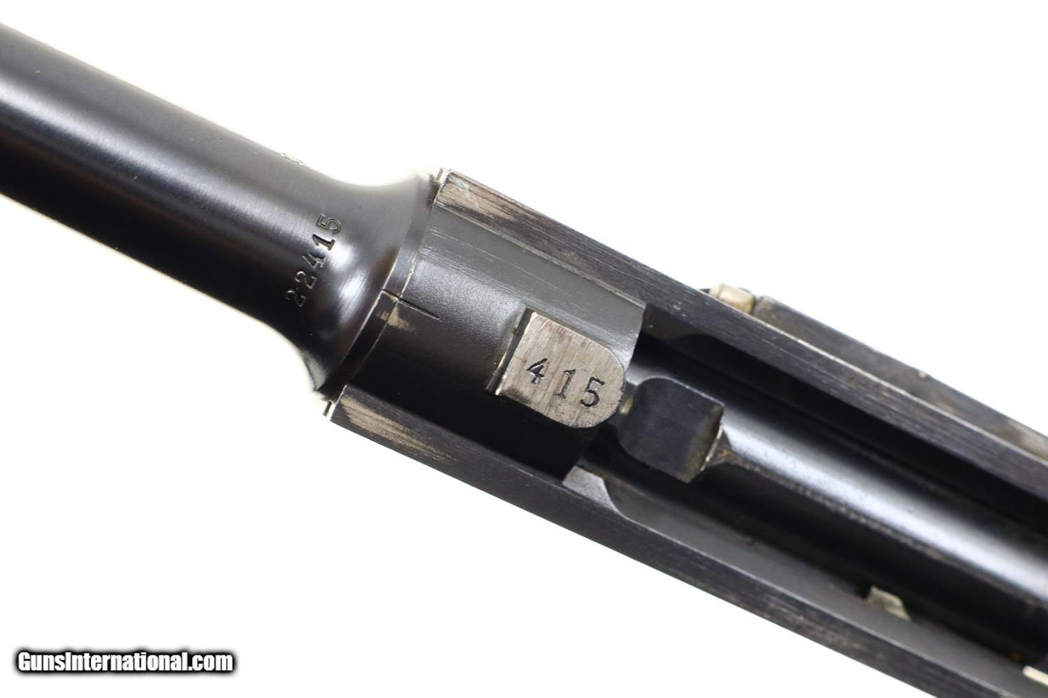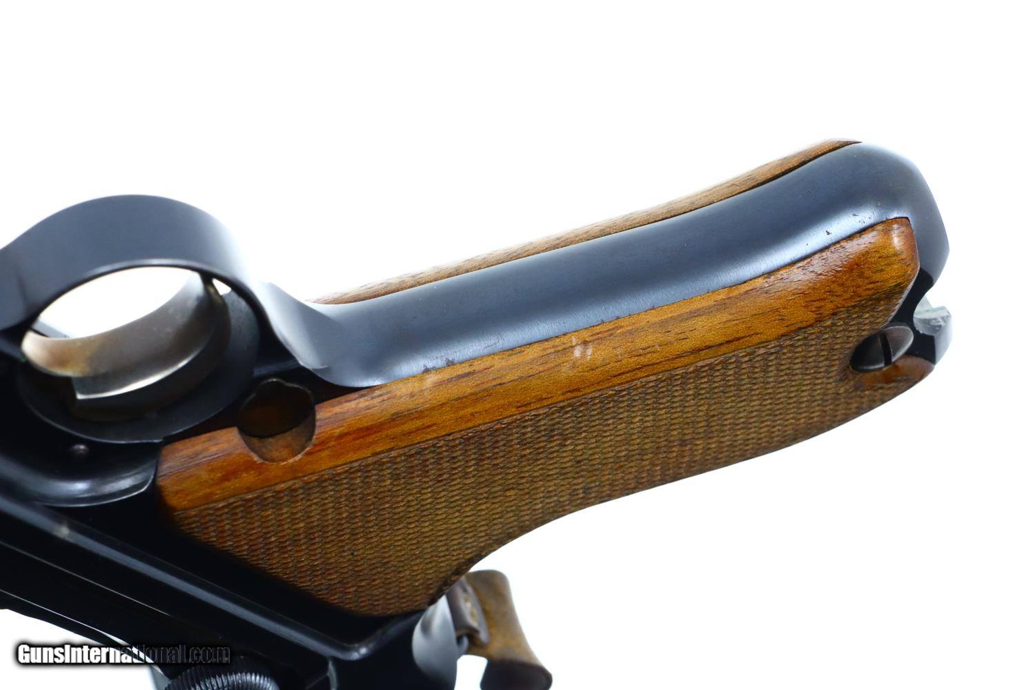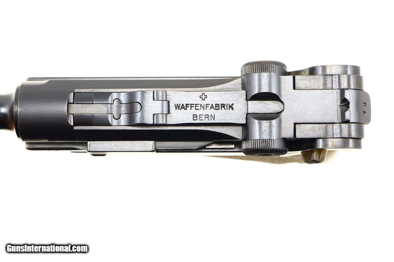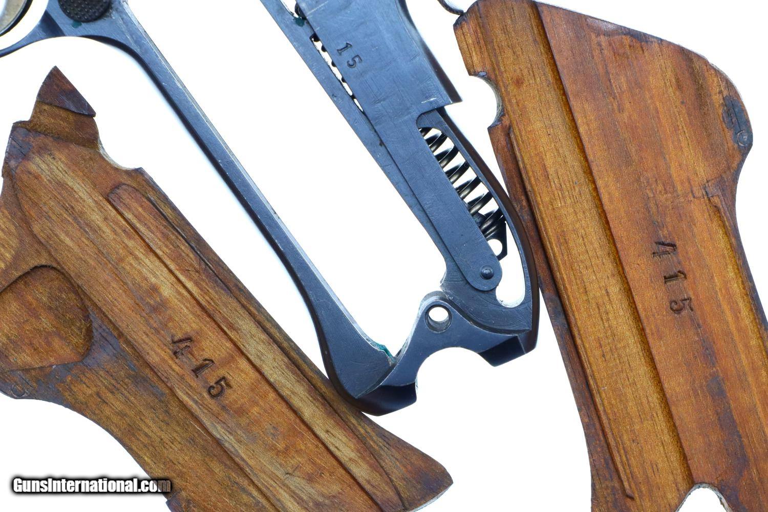 Description: Standard configuration Bern 1924, 7.65mm Luger, with 4.75” barrel having drift adjustable fire blued front sight and fixed rear sight. Blank chamber. Middle link with WAFFENFABRIK BERN. “P53” release on left rail. Full serial number under barrel and forward frame with the last few digits under the sideplate, trigger, barrel extension, and on all three components of the toggle, grip safety and each of the grips. Scattered Swiss crosses in usual locations. Strawed takedown lever, trigger, magazine release button, ejector and safety lever. Correct magazine with tinned body and walnut plug marked “15”. Complete with Lothar Walther conversion kit marked for 7.65 Para/4mm with eight inserts, no box. Synopsis: A very high, original condition Swiss 1924 Bern Military Luger with an unusual 4mm Lothar Walther conversion kit. Condition: Beautiful, bright rust blue, at least 98%, only minimal sharp edge wear as one might expect from a pistol that has not seen much service. Small parts with richly retempered strawing. Comparable condition front and backstraps. Near excellent grips and magazine. Mirror bore. Perfect manual mechanics. Excellent Lothar Walther conversion kit components. A very high, original condition Swiss 1924 Bern Military Luger with a 4mm Lothar Walther conversion kit. ~~Insured shipping fee of $65; most packages shipped using FedEx 2nd Day.~~ SOLD Curio/Relic: Yes Manufacturer: Bern Serial Number: 22415 Caliber Info: 7.65mm Luger |