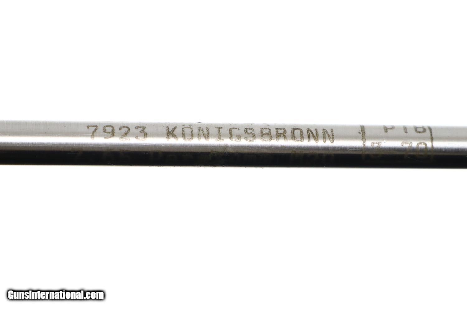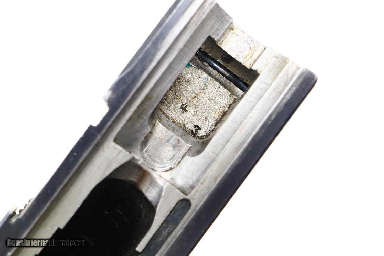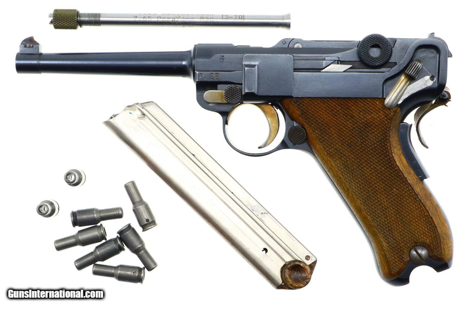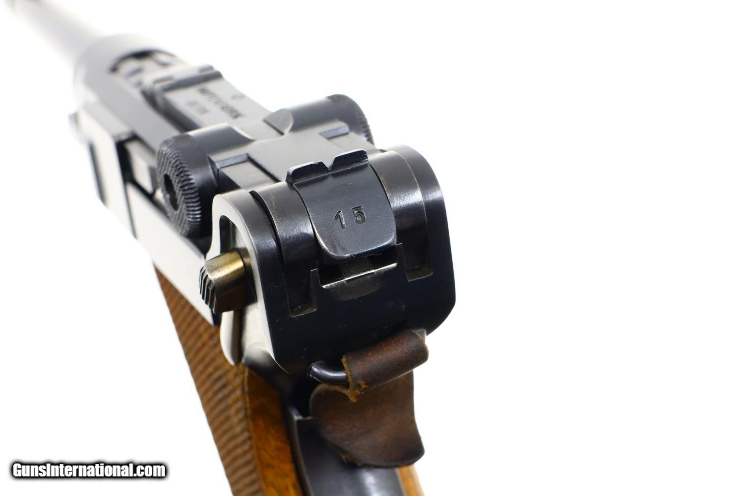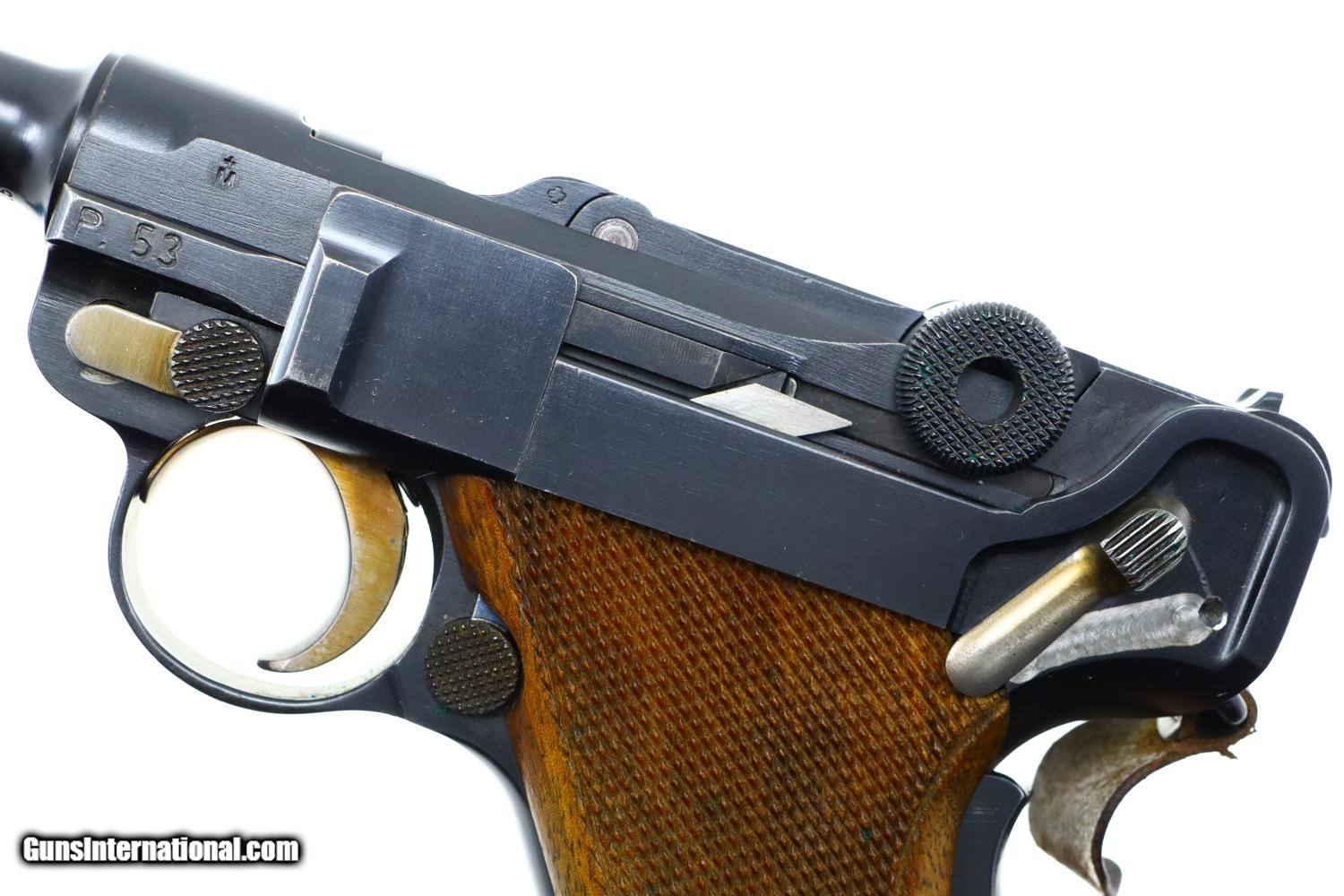 Description: Standard configuration Bern 1924, 7.65mm Luger, with 4.75” barrel having drift adjustable fire blued front sight and fixed rear sight. Blank chamber. Middle link with WAFFENFABRIK BERN. “P53” release on left rail. Full serial number under barrel and forward frame with the last few digits under the sideplate, trigger, barrel extension, and on all three components of the toggle, grip safety and each of the grips. Scattered Swiss crosses in usual locations. Strawed takedown lever, trigger, magazine release button, ejector and safety lever. Correct magazine with tinned body and walnut plug marked “15”. Complete with Lothar Walther conversion kit marked for 7.65 Para/4mm with eight inserts, no box. Synopsis: A very high, original condition Swiss 1924 Bern Military Luger with an unusual 4mm Lothar Walther conversion kit. Condition: Beautiful, bright rust blue, at least 98%, only minimal sharp edge wear as one might expect from a pistol that has not seen much service. Small parts with richly retempered strawing. Comparable condition front and backstraps. Near excellent grips and magazine. Mirror bore. Perfect manual mechanics. Excellent Lothar Walther conversion kit components. A very high, original condition Swiss 1924 Bern Military Luger with a 4mm Lothar Walther conversion kit. ~~Insured shipping fee of $65; most packages shipped using FedEx 2nd Day.~~ SOLD Curio/Relic: Yes Manufacturer: Bern Serial Number: 22415 Caliber Info: 7.65mm Luger |