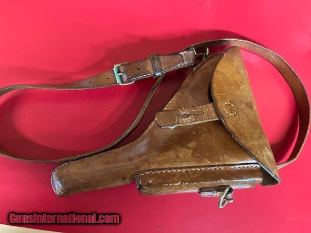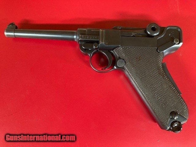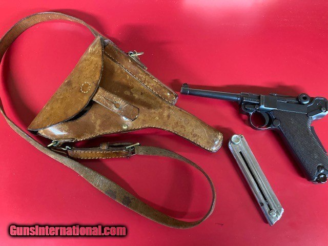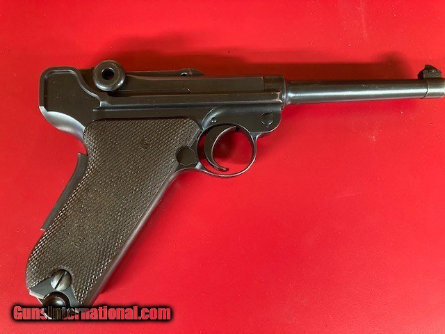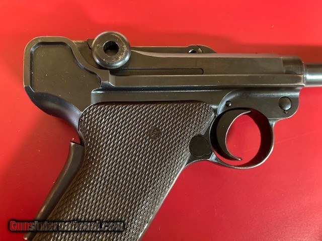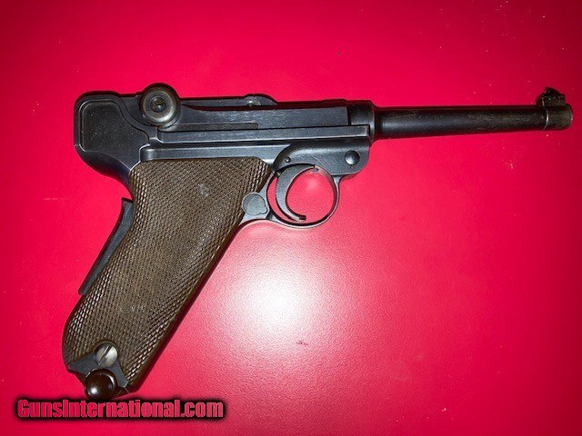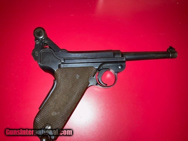 Description: This Swiss Luger model 1906/29 was made at Waffenfabrik Bern in April 1940. Gun is in .30 Luger with 4 ¾” barrel. Gun all original and correct with wide trigger, brown plastic checkered grips and brown plastic bottom magazine. All serial #’s match, all other markings are correct, grips are excellent and gun has mint bore. About 98% original finish with slight blue wear at end of barrel and high spot on receiver from holster wear. Original flap holster with a spare non-Swiss magazine. No Calf. or Hawaii sales. C & R eligible. SOLD Curio/Relic: Yes Handgun Caliber: 7.65x22mm Parabellum (7.65x22mm Luger, .30 Luger) |