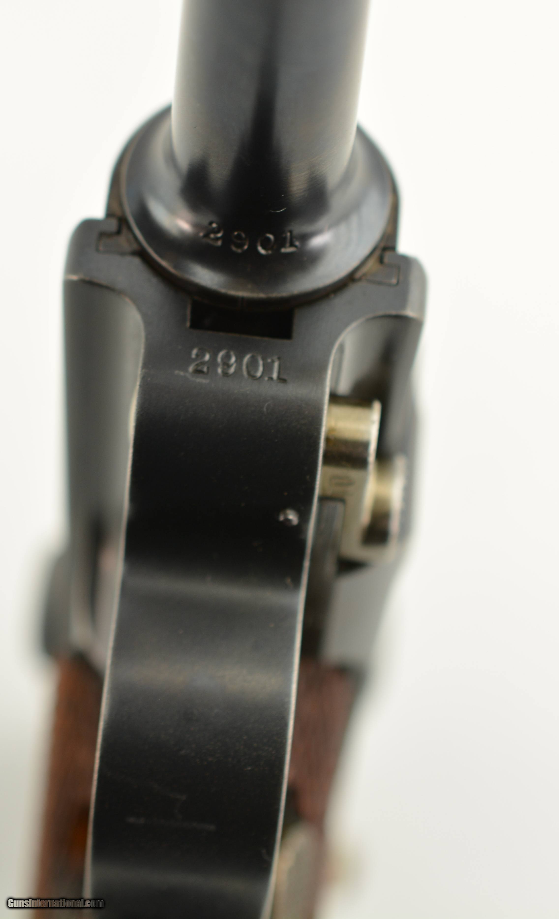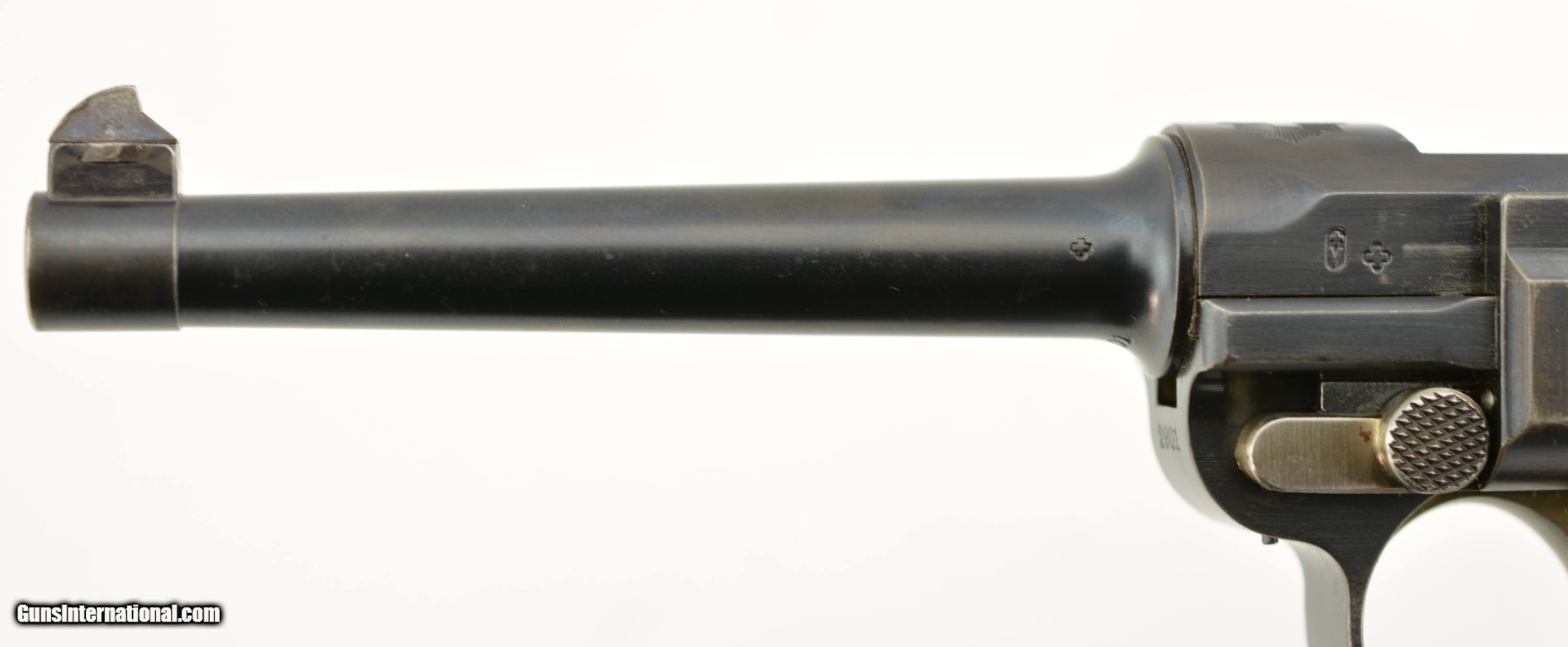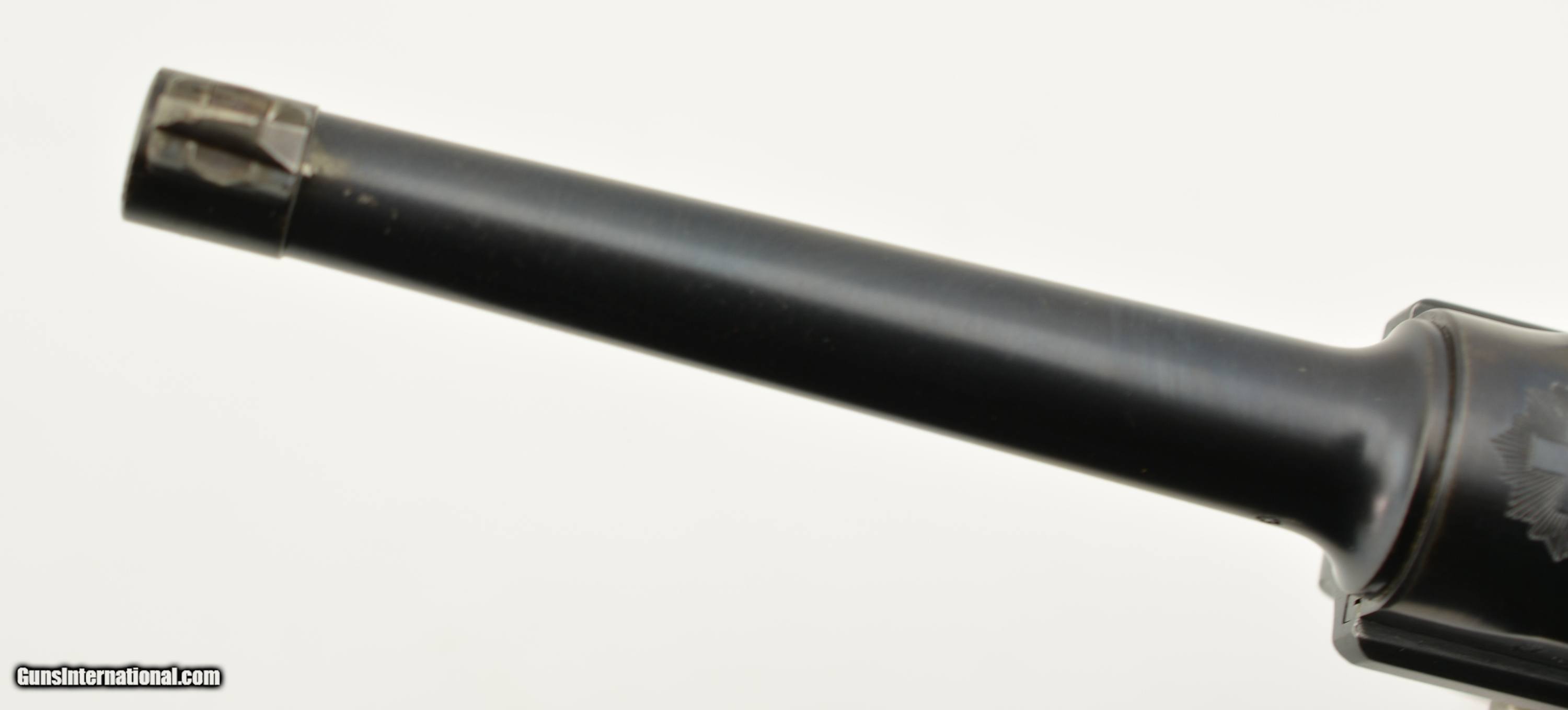 Description: Serial #2901, 7.65mm Para. (.30 Luger), 4 3/4" barrel with an excellent, bright bore. This is a very handsome, "Cross-in-Sunburst"-marked pistol that has all-matching numbers (including the grip panels), and retains 97-98% of the original blue on the metal. There is some mild silvering at the muzzle, and along a few of the high edges, projections, and bearing surfaces. The trigger, take-down lever, magazine release, safety, and ejector retain most of their original straw color, with the balance turned to a pale yellow-gray patina. The rear sight notch was never altered to a U-notch by Swiss armorers, and is still in the original V-notch configuration. The checkered walnut grips are in fine shape with some small handling marks here and there, some flattening of the points, and a single minuscule chip missing from the top of the left panel just above the magazine release. The pistol comes with a single, correct, wooden base magazine with metal inlays. This is a splendid Swiss-made Luger, in excellent condition, and would make a wonderful addition to any collection. FFL or C&R SOLD Curio/Relic: Yes Manufacturer: Swiss Model: Luger Serial Number: 2901 Caliber Info: .30 Gauge Info: .30 |