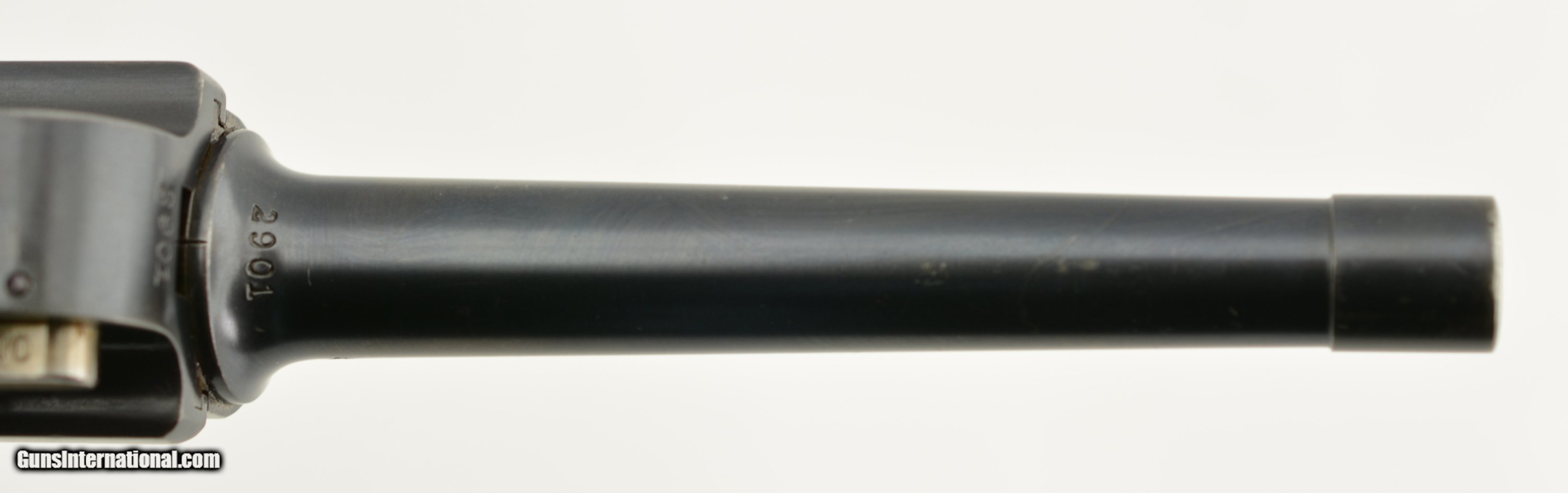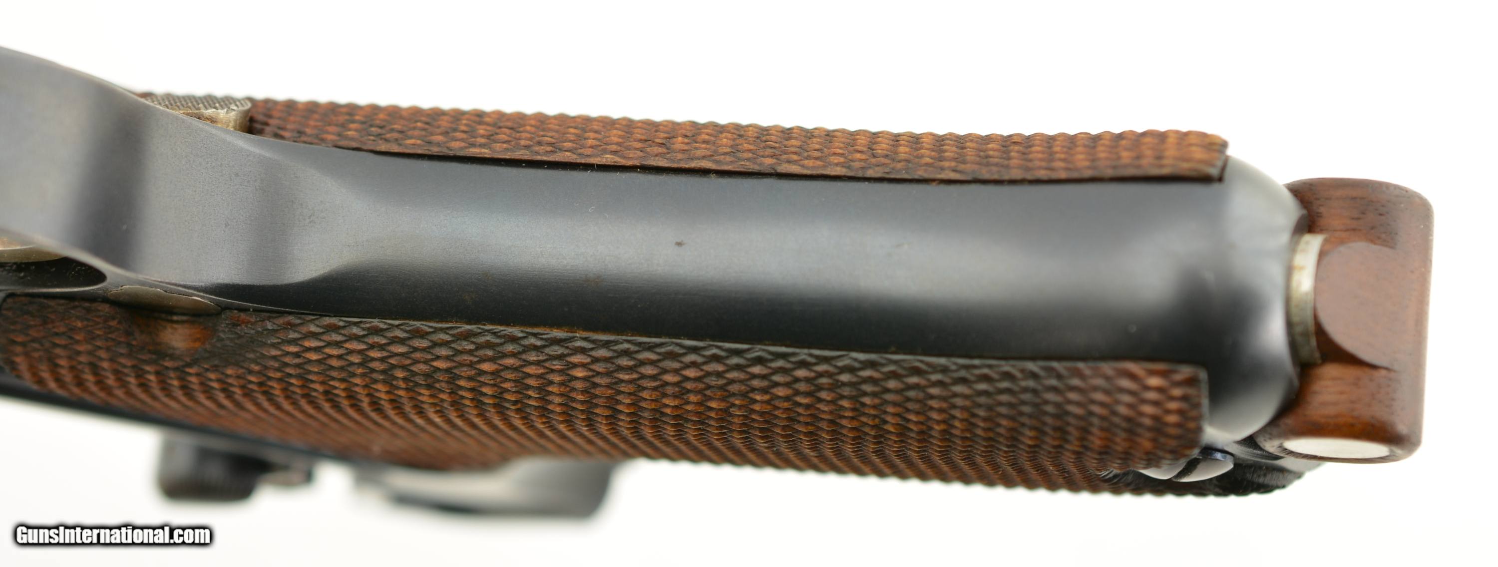 Description: Serial #2901, 7.65mm Para. (.30 Luger), 4 3/4" barrel with an excellent, bright bore. This is a very handsome, "Cross-in-Sunburst"-marked pistol that has all-matching numbers (including the grip panels), and retains 97-98% of the original blue on the metal. There is some mild silvering at the muzzle, and along a few of the high edges, projections, and bearing surfaces. The trigger, take-down lever, magazine release, safety, and ejector retain most of their original straw color, with the balance turned to a pale yellow-gray patina. The rear sight notch was never altered to a U-notch by Swiss armorers, and is still in the original V-notch configuration. The checkered walnut grips are in fine shape with some small handling marks here and there, some flattening of the points, and a single minuscule chip missing from the top of the left panel just above the magazine release. The pistol comes with a single, correct, wooden base magazine with metal inlays. This is a splendid Swiss-made Luger, in excellent condition, and would make a wonderful addition to any collection. FFL or C&R SOLD Curio/Relic: Yes Manufacturer: Swiss Model: Luger Serial Number: 2901 Caliber Info: .30 Gauge Info: .30 |