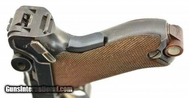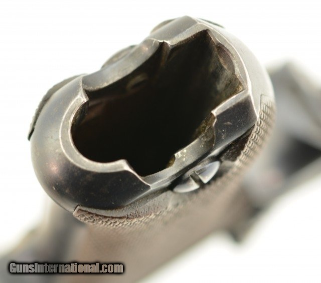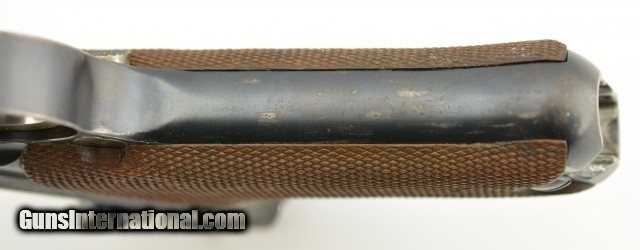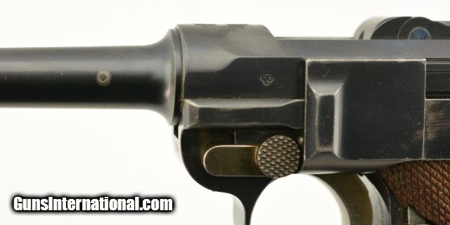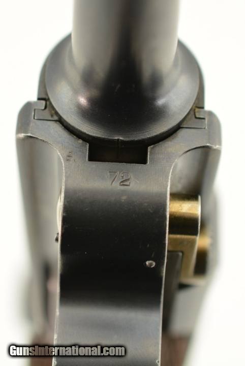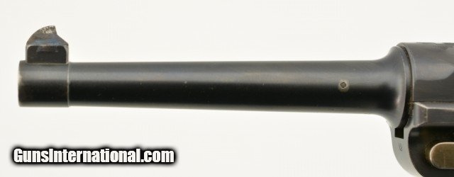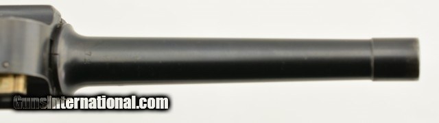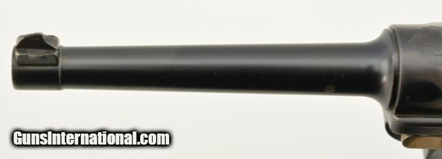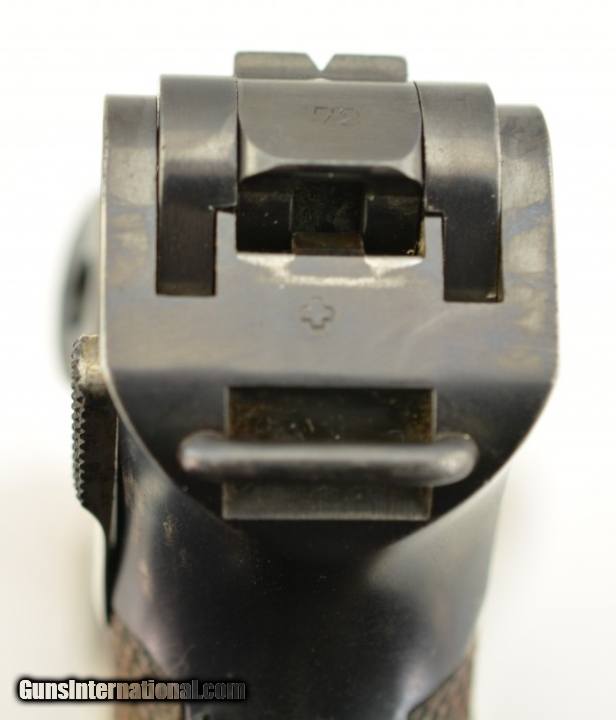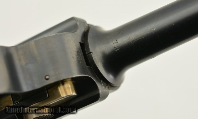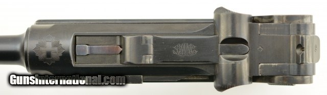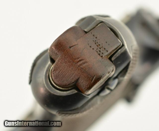 Description: Serial #72, 7.65mm Para. (.30 Luger), 4 3/4" barrel with an excellent, bright bore. This is an all-matching pistol that retains 97-98% of the original blue finish, with some trace silvering at the muzzle, along a few of the high and projecting edges, and on the bearing surfaces of the toggle. The Swiss Cross-in-Sunburst is crisp and clear, and most of the original straw color remains on the small parts. The checkered wooden grips are in fine shape with some mild wear and flattening of the points on either side. This pistol has had the relief cut added to the magazine well, but the original flat thumb-piece magazine is still present, and the original V-notch rear sight was never converted to U-notch. No import Marks on this gun. This is a very early Swiss Luger, in excellent condition, and would make a great addition to any collection. FFL or C&R SOLD Curio/Relic: Yes |