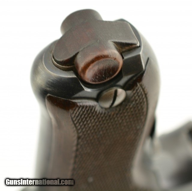 Description: Serial #29107, 7.65mm Para. (.30 Luger), 4 3/4" barrel with a fine, bright bore that has a small amount of mild freckling within the grooves. This is a handsome pistol that has all-matching numbers (including the grip panels), and retains 95-97% of the original blue on the metal. There is some mild silvering at the muzzle, along the high and exposed edges, as well as a few small spots of freckling scattered about. Additionally, there is a small area of discoloration on the right side of the receiver just ahead of the toggle disk. The trigger, take-down lever, magazine release, safety, and ejector retain most of their original straw color, with the balance turned to a mottled pewter gray patina. The checkered walnut grips are in fine shape with some small handling marks here and there, some flattening of the points, and no cracks or chips. The pistol comes with a single, correct, unmarked wooden base magazine, and a period leather lanyard on the rear of the frame. This is a splendid Swiss-made Luger, and is in excellent condition. It would make a wonderful addition to any collection. FFL or C&R SOLD Curio/Relic: Yes |