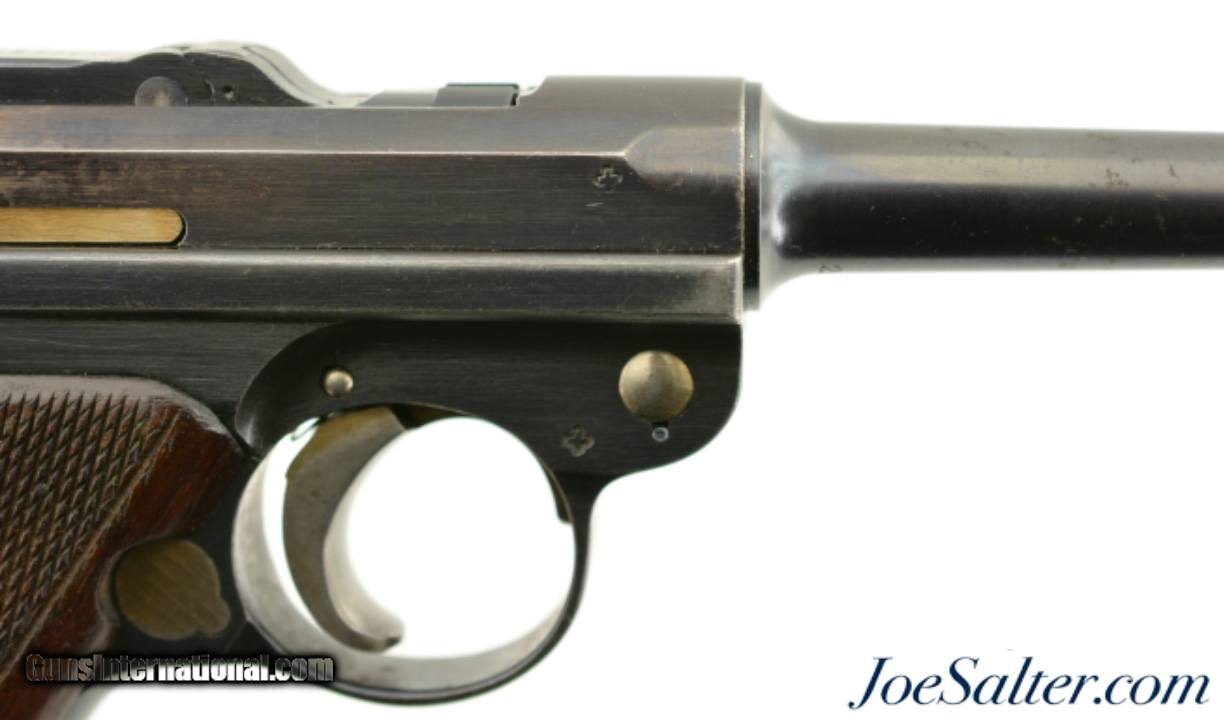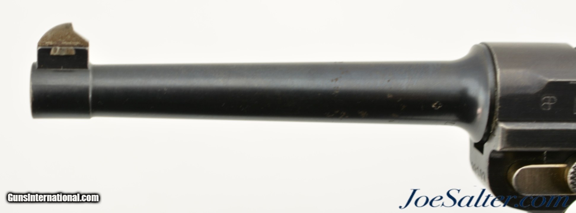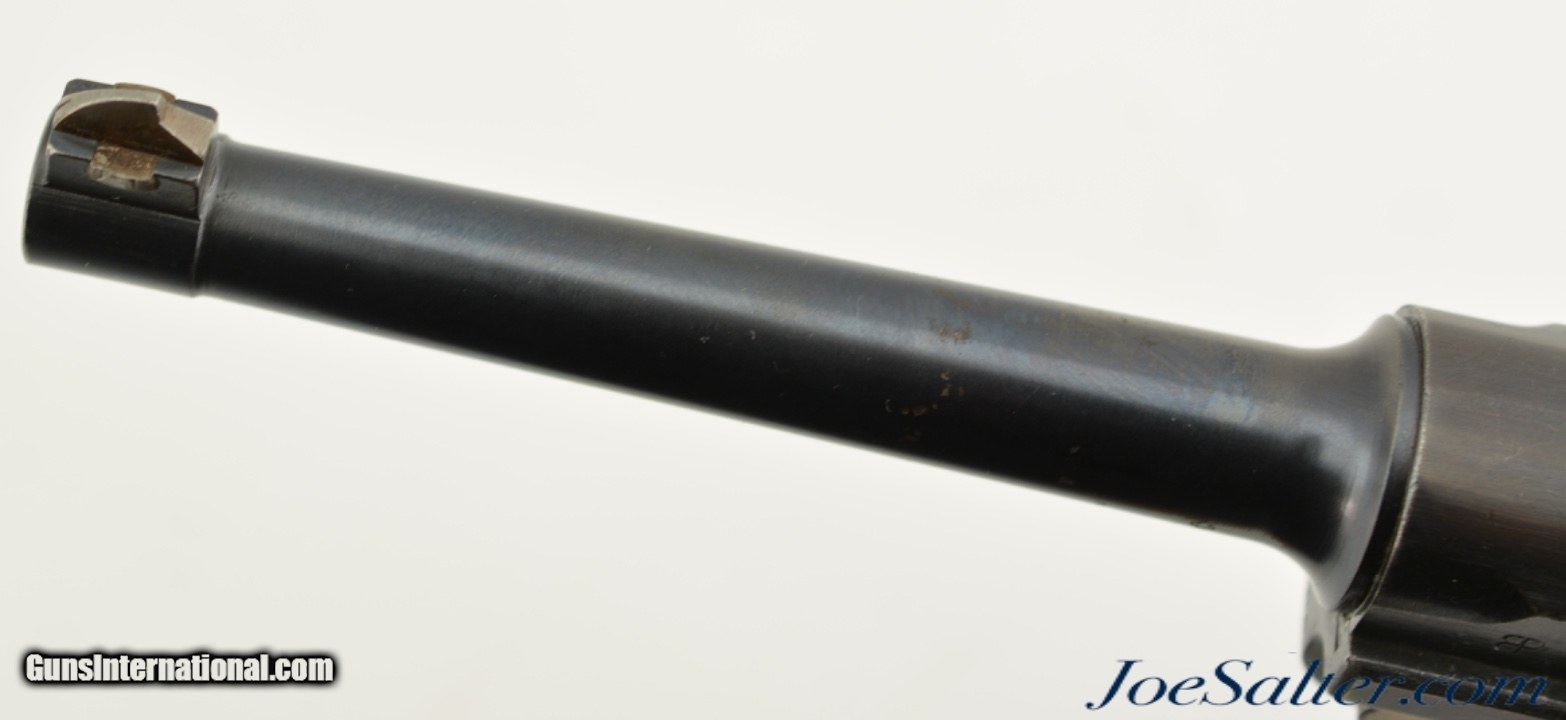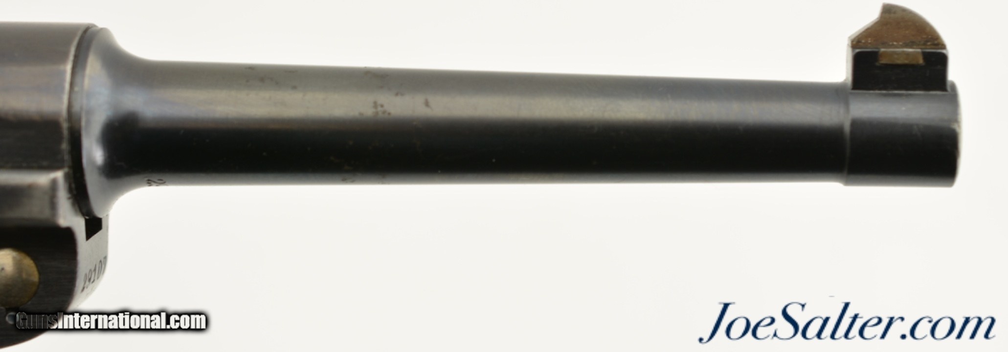 Description: Serial #29107, 7.65mm Para. (.30 Luger), 4 3/4" barrel with a fine, bright bore that has a small amount of mild freckling within the grooves. This is a handsome pistol that has all-matching numbers (including the grip panels), and retains 95-97% of the original blue on the metal. There is some mild silvering at the muzzle, along the high and exposed edges, as well as a few small spots of freckling scattered about. Additionally, there is a small area of discoloration on the right side of the receiver just ahead of the toggle disk. The trigger, take-down lever, magazine release, safety, and ejector retain most of their original straw color, with the balance turned to a mottled pewter gray patina. The checkered walnut grips are in fine shape with some small handling marks here and there, some flattening of the points, and no cracks or chips. The pistol comes with a single, correct, unmarked wooden base magazine, and a period leather lanyard on the rear of the frame. This is a splendid Swiss-made Luger, and is in excellent condition. It would make a wonderful addition to any collection. FFL or C&R SOLD Curio/Relic: Yes |