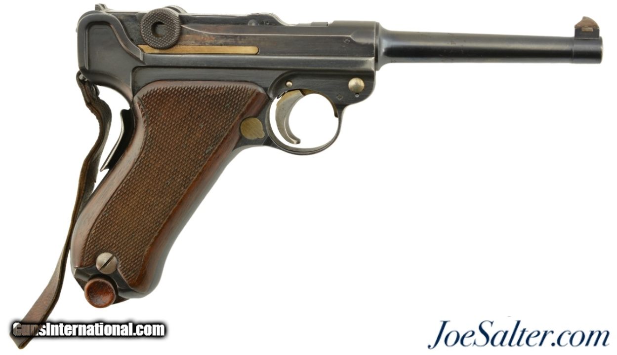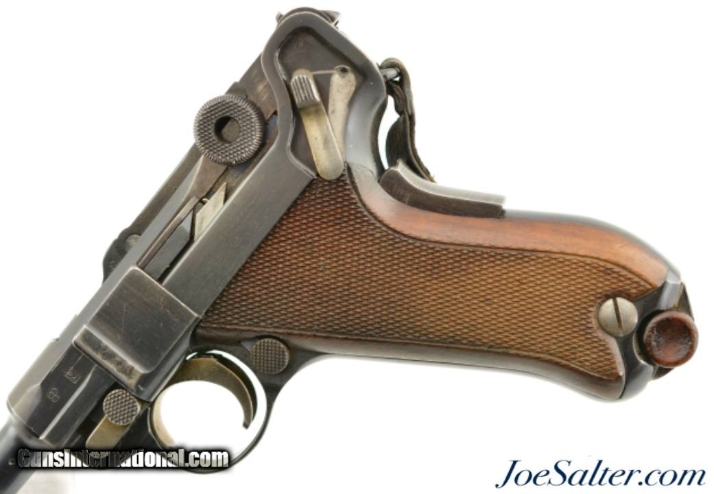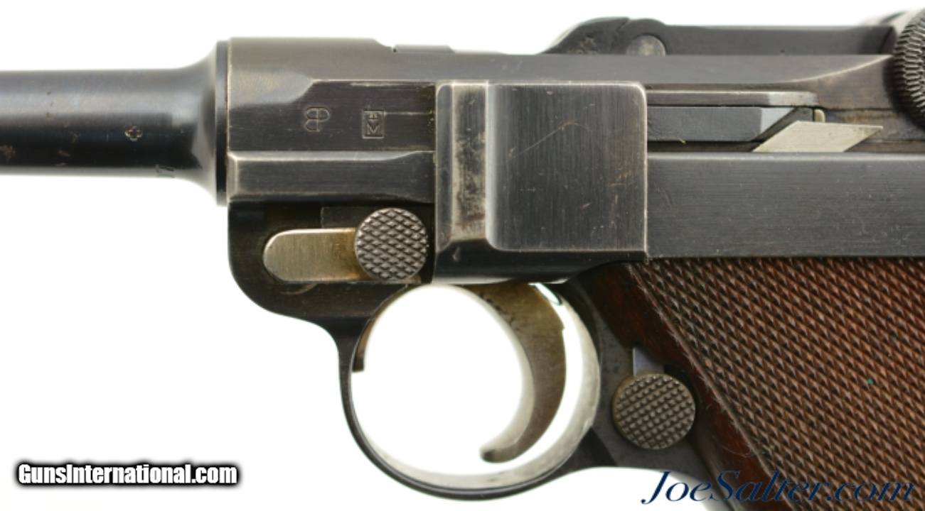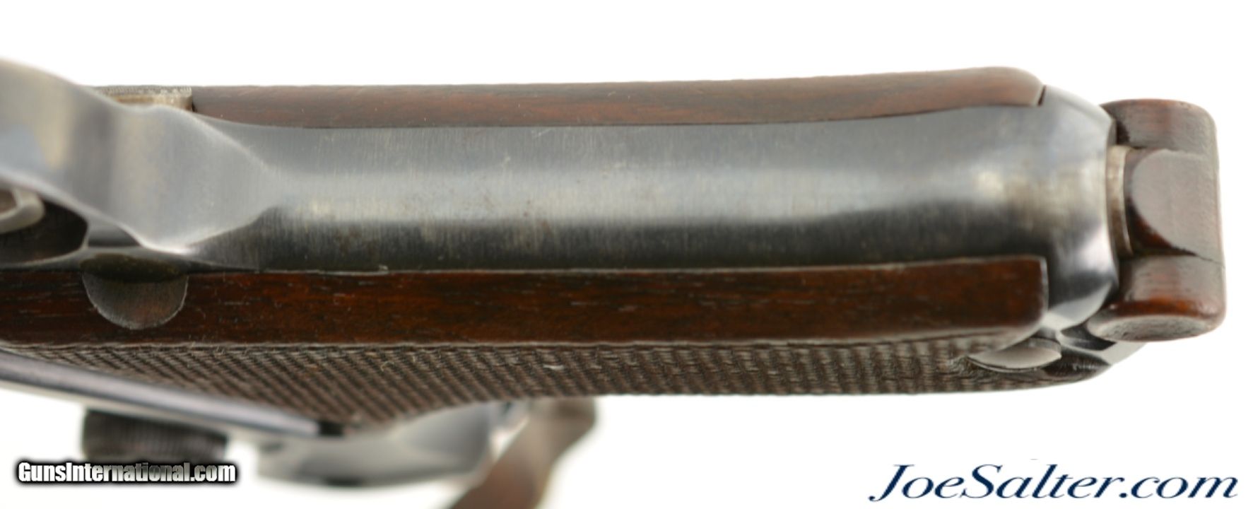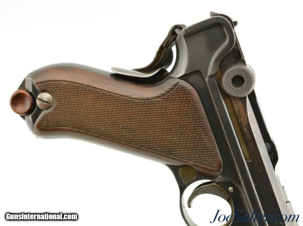 Description: Serial #29107, 7.65mm Para. (.30 Luger), 4 3/4" barrel with a fine, bright bore that has a small amount of mild freckling within the grooves. This is a handsome pistol that has all-matching numbers (including the grip panels), and retains 95-97% of the original blue on the metal. There is some mild silvering at the muzzle, along the high and exposed edges, as well as a few small spots of freckling scattered about. Additionally, there is a small area of discoloration on the right side of the receiver just ahead of the toggle disk. The trigger, take-down lever, magazine release, safety, and ejector retain most of their original straw color, with the balance turned to a mottled pewter gray patina. The checkered walnut grips are in fine shape with some small handling marks here and there, some flattening of the points, and no cracks or chips. The pistol comes with a single, correct, unmarked wooden base magazine, and a period leather lanyard on the rear of the frame. This is a splendid Swiss-made Luger, and is in excellent condition. It would make a wonderful addition to any collection. FFL or C&R SOLD Curio/Relic: Yes |