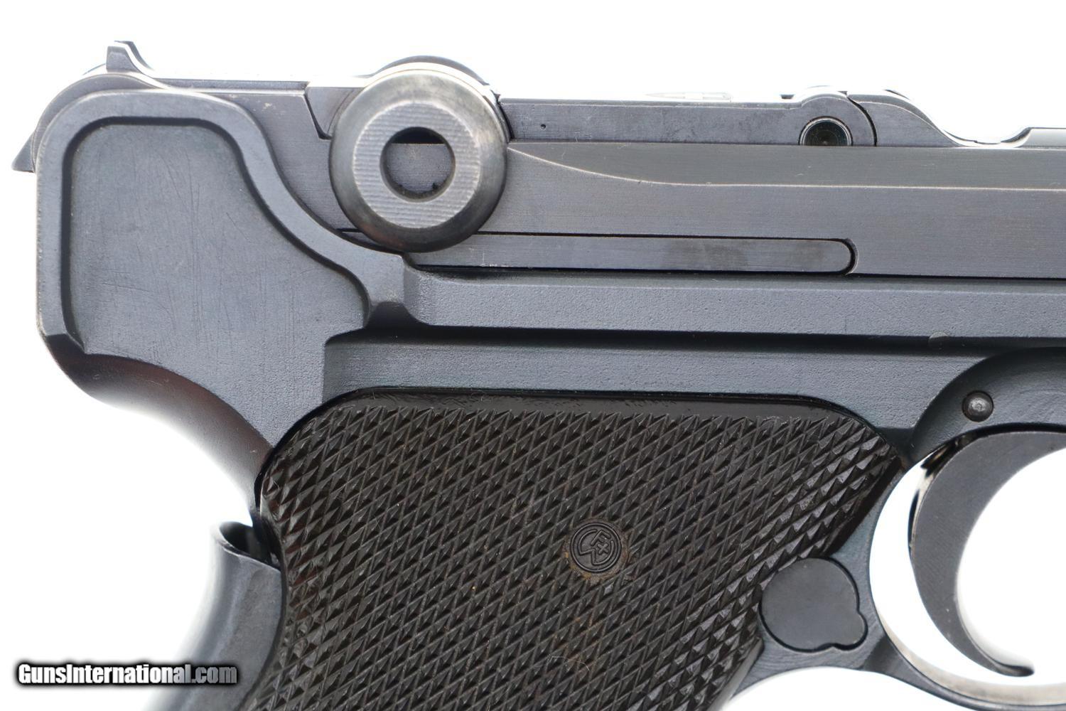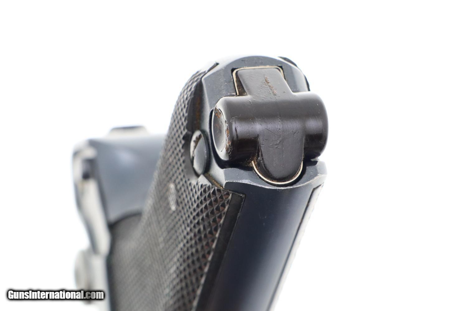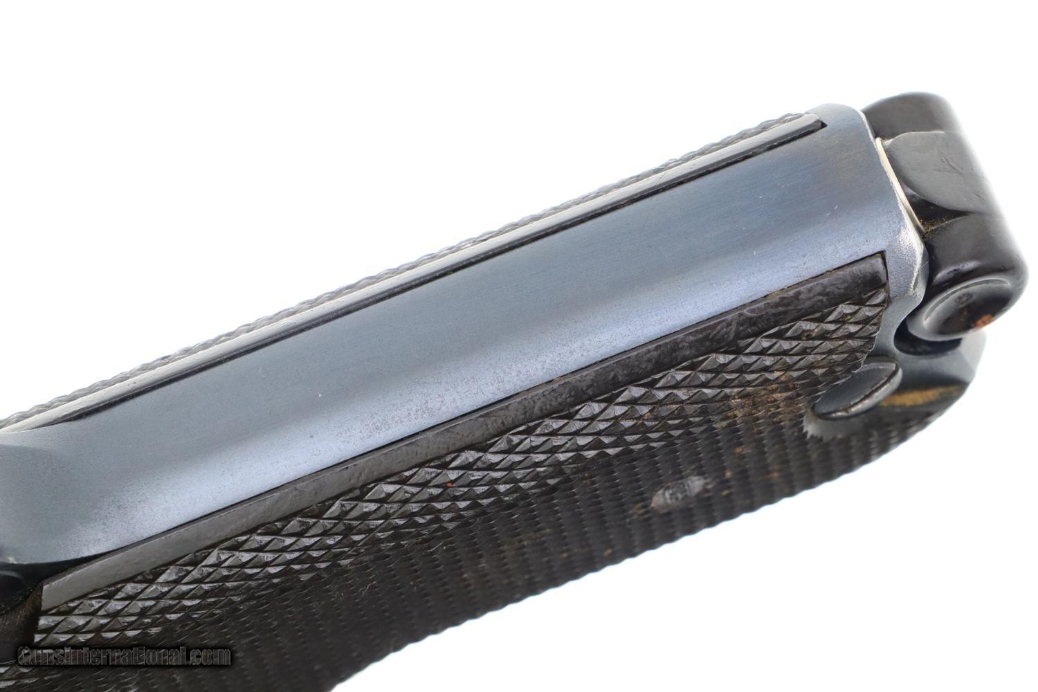 Description: Synopsis: Very Late Production Bern 1929 Luger, WWII Era, Swiss Military, Rig Description: Very, very late production Swiss military 1929 Luger, SN 75500, made 44 (1944) month not noted, WWII era, whose standard features include 4.75ā barrel with drift adjustable front sight and fixed āUā rear sight. Full matching serial number on barrel, left rail, and rear toggle link with last three digits repeated on sideplate and bottom of barrel extension. All small parts with usual inspector markings. W/F logo on back of frame. Uniformly checkered dark chocolate brown/black grips and dark brown magazine plug. Complete with original military holster dated "42" and spare magazine with matching colored plug. Condition: Near EXC factory blue. Mirror Bore with minimal etching. Perfect manual mechanics with both magazines. One of the more desirable of the 1929 Bern pistols, manufactured near the end of production in 1944. Especially nice with the closely dated military holster and spare magazine! Curio/Relic: Yes Manufacturer: W&F Bern Model: 1929 Serial Number: 75500 Caliber Info: 7.65mmP Condition: EXC Price: $1,895.00 Contact Seller |