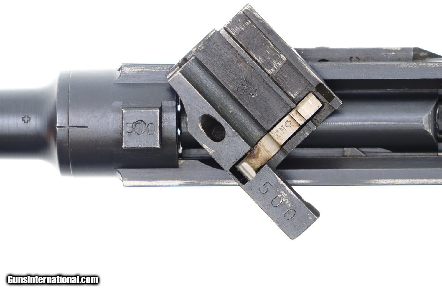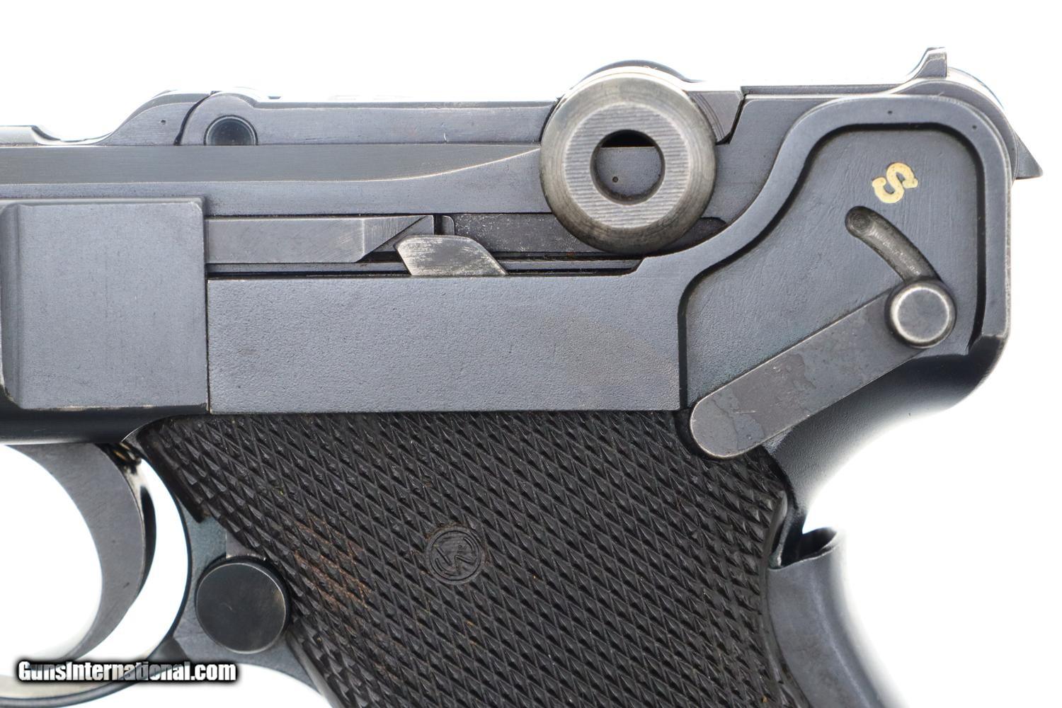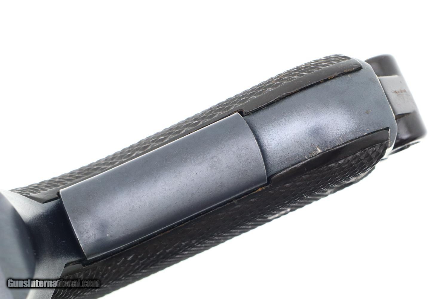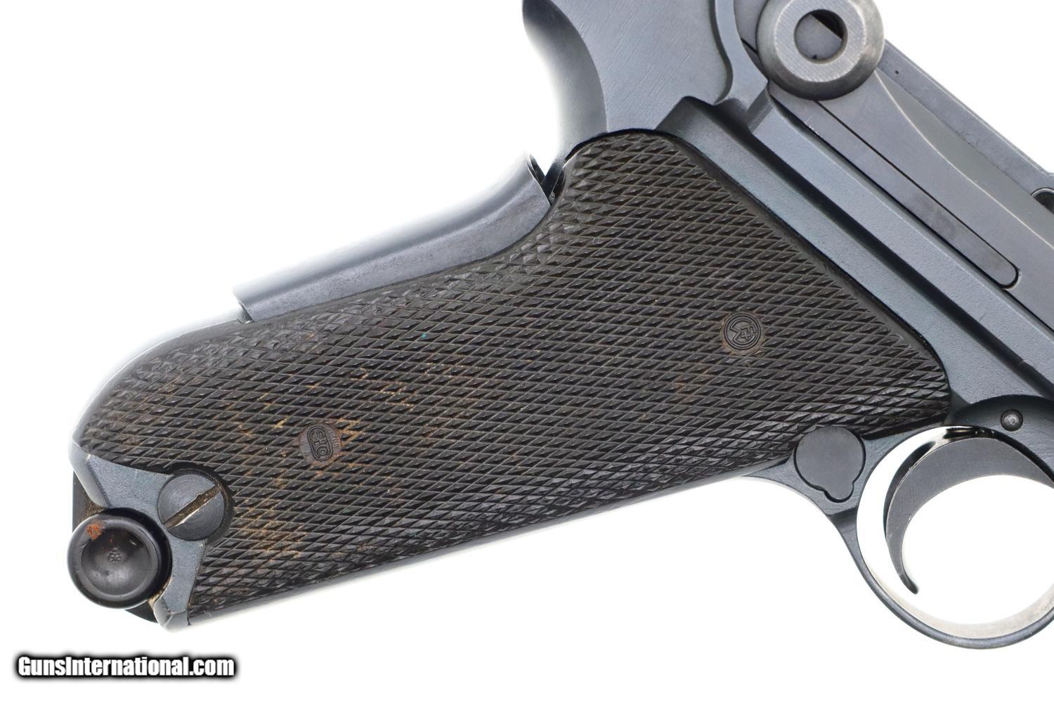 Description: Synopsis: Very Late Production Bern 1929 Luger, WWII Era, Swiss Military, Rig Description: Very, very late production Swiss military 1929 Luger, SN 75500, made 44 (1944) month not noted, WWII era, whose standard features include 4.75ā barrel with drift adjustable front sight and fixed āUā rear sight. Full matching serial number on barrel, left rail, and rear toggle link with last three digits repeated on sideplate and bottom of barrel extension. All small parts with usual inspector markings. W/F logo on back of frame. Uniformly checkered dark chocolate brown/black grips and dark brown magazine plug. Complete with original military holster dated "42" and spare magazine with matching colored plug. Condition: Near EXC factory blue. Mirror Bore with minimal etching. Perfect manual mechanics with both magazines. One of the more desirable of the 1929 Bern pistols, manufactured near the end of production in 1944. Especially nice with the closely dated military holster and spare magazine! Curio/Relic: Yes Manufacturer: W&F Bern Model: 1929 Serial Number: 75500 Caliber Info: 7.65mmP Condition: EXC Price: $1,895.00 Contact Seller |