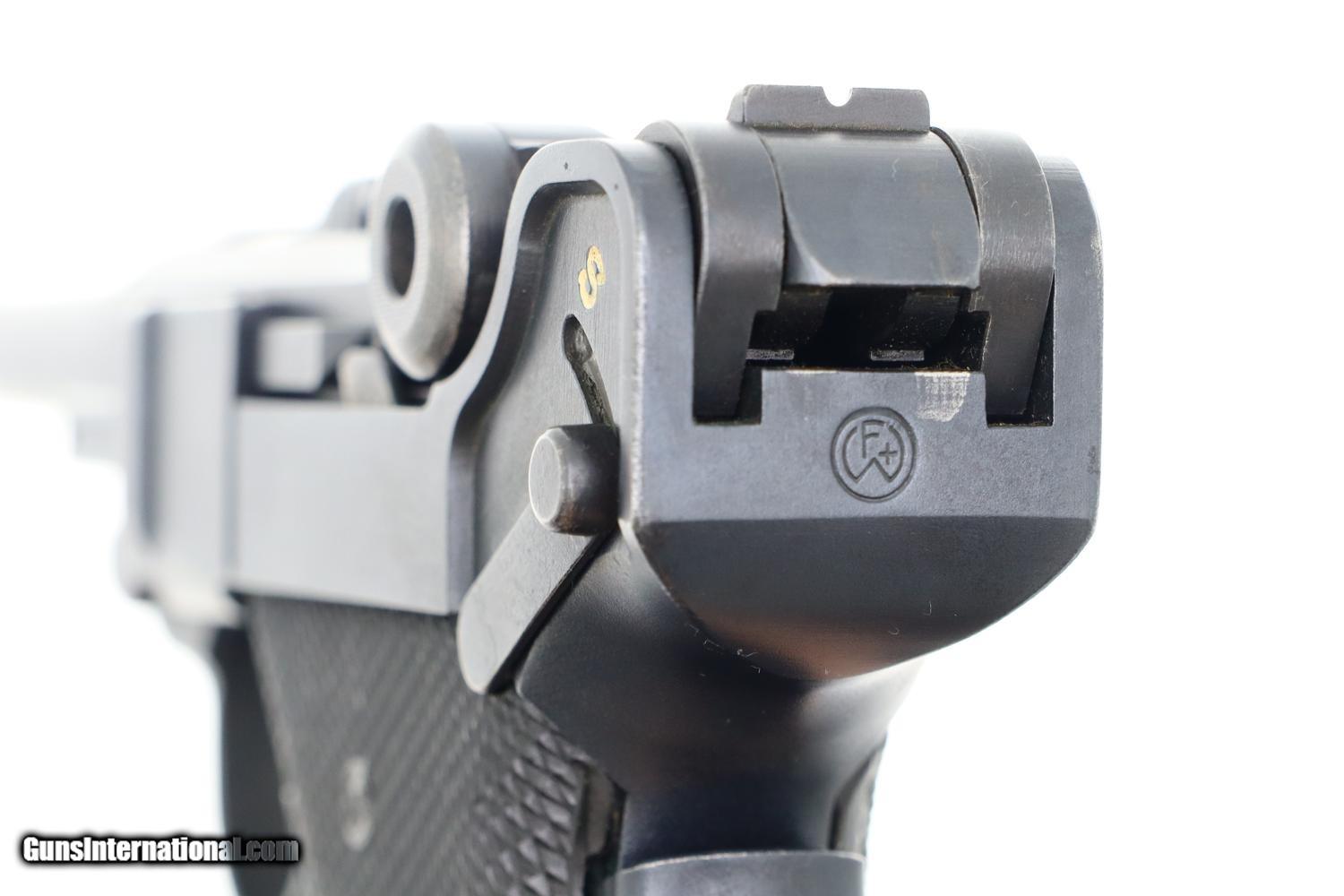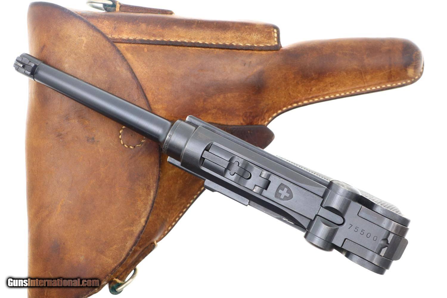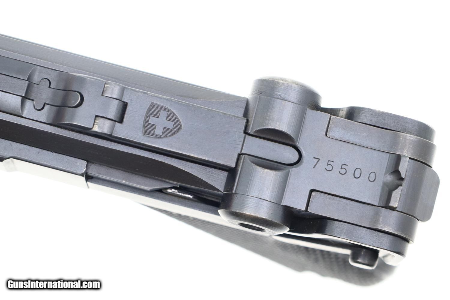 Very, very late production Swiss military 1929 Luger, SN 75500, made 44 (1944) month not noted, WWII era, whose standard features include 4.75ā barrel with drift adjustable front sight and fixed āUā rear sight. Full matching serial number on barrel, left rail, and rear toggle link with last three digits repeated on sideplate and bottom of barrel extension. All small parts with usual inspector markings. W/F logo on back of frame. Uniformly checkered dark chocolate brown/black grips and dark brown magazine plug. Complete with original military holster dated "42" and spare magazine with matching colored plug.
