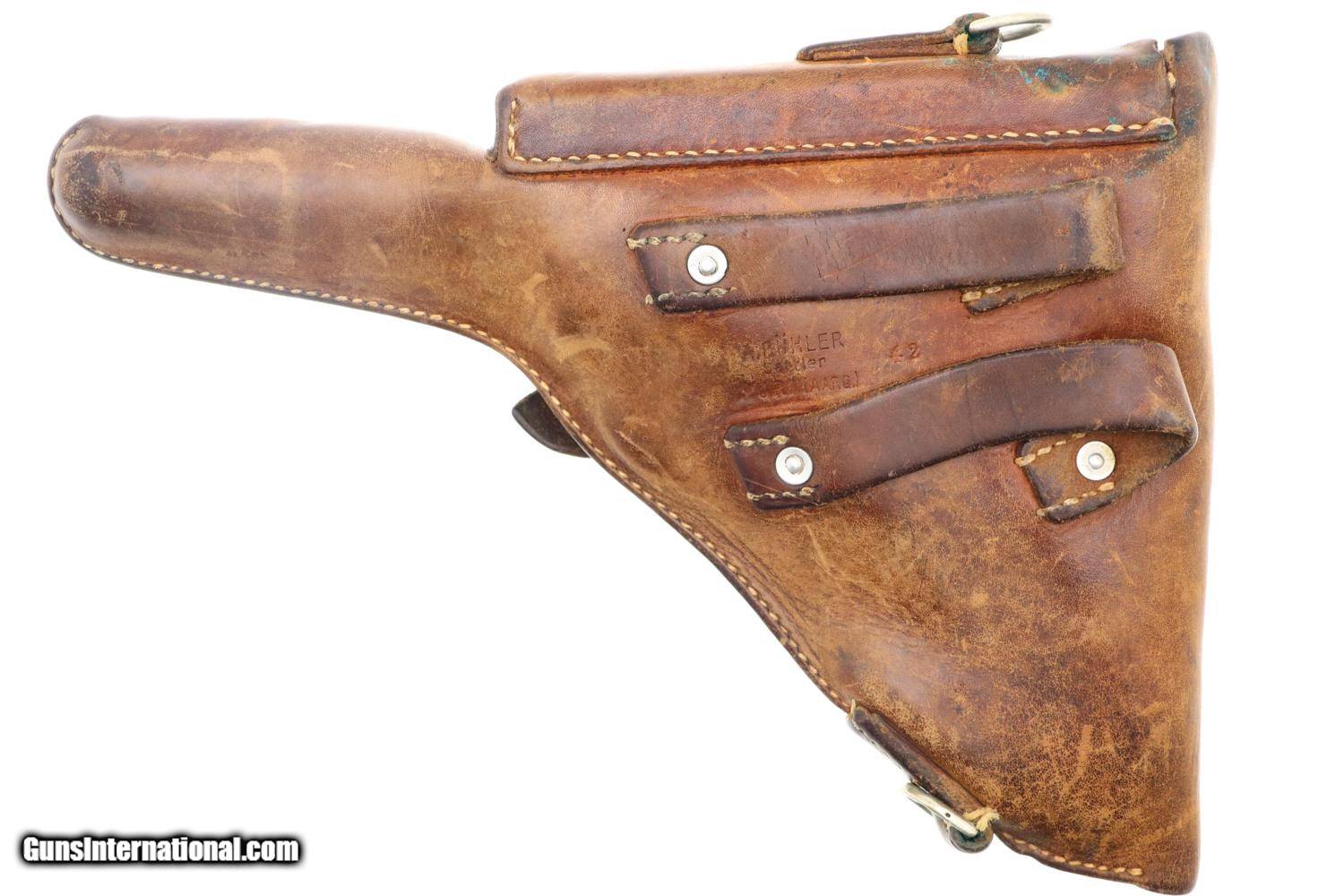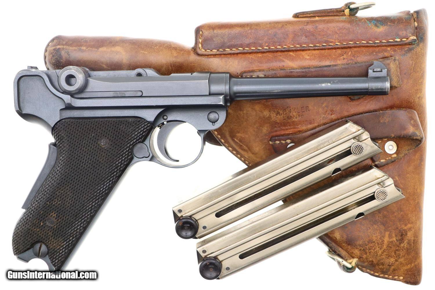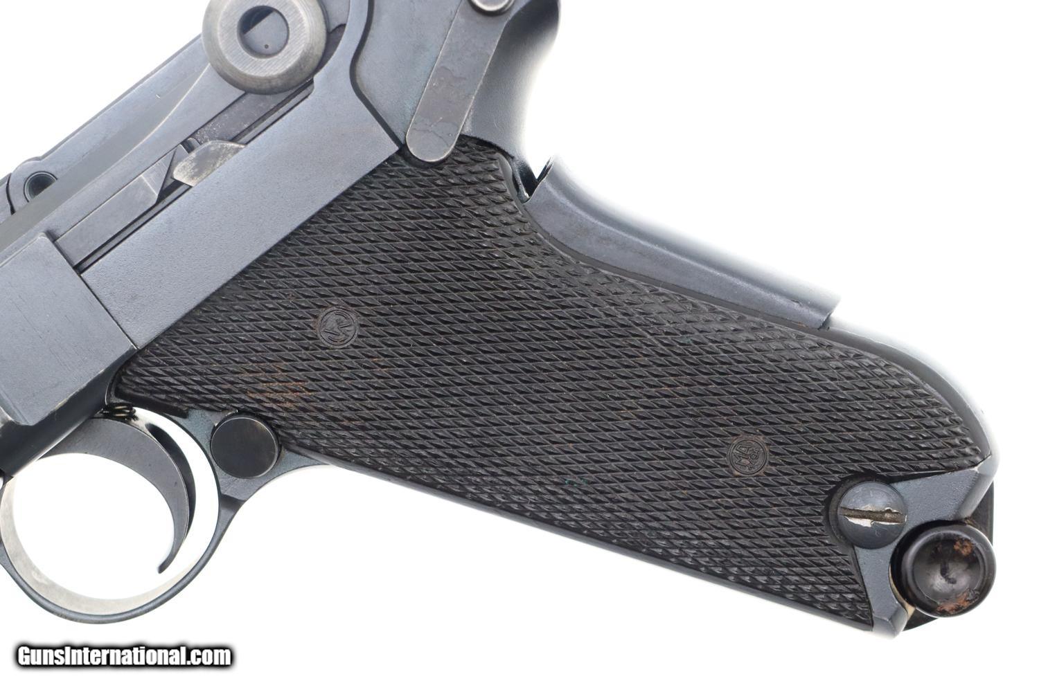 Very, very late production Swiss military 1929 Luger, SN 75500, made 44 (1944) month not noted, WWII era, whose standard features include 4.75ā barrel with drift adjustable front sight and fixed āUā rear sight. Full matching serial number on barrel, left rail, and rear toggle link with last three digits repeated on sideplate and bottom of barrel extension. All small parts with usual inspector markings. W/F logo on back of frame. Uniformly checkered dark chocolate brown/black grips and dark brown magazine plug. Complete with original military holster dated "42" and spare magazine with matching colored plug.