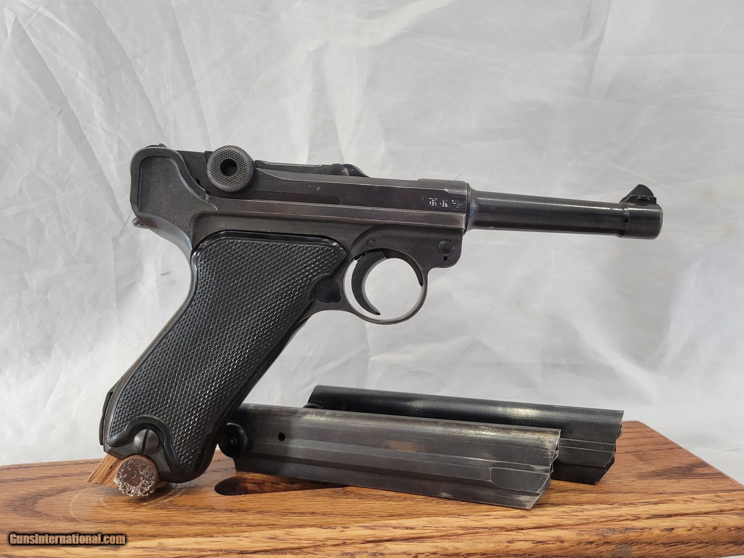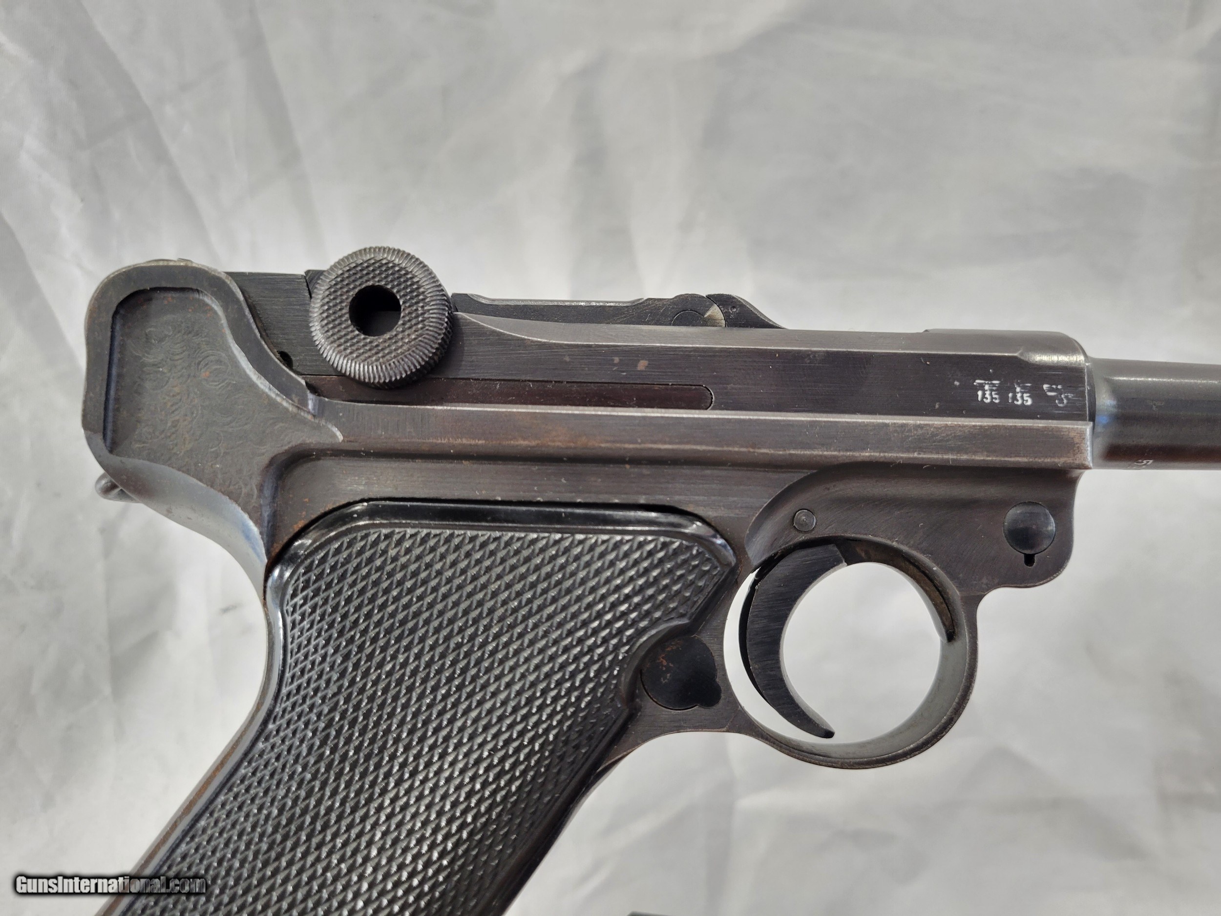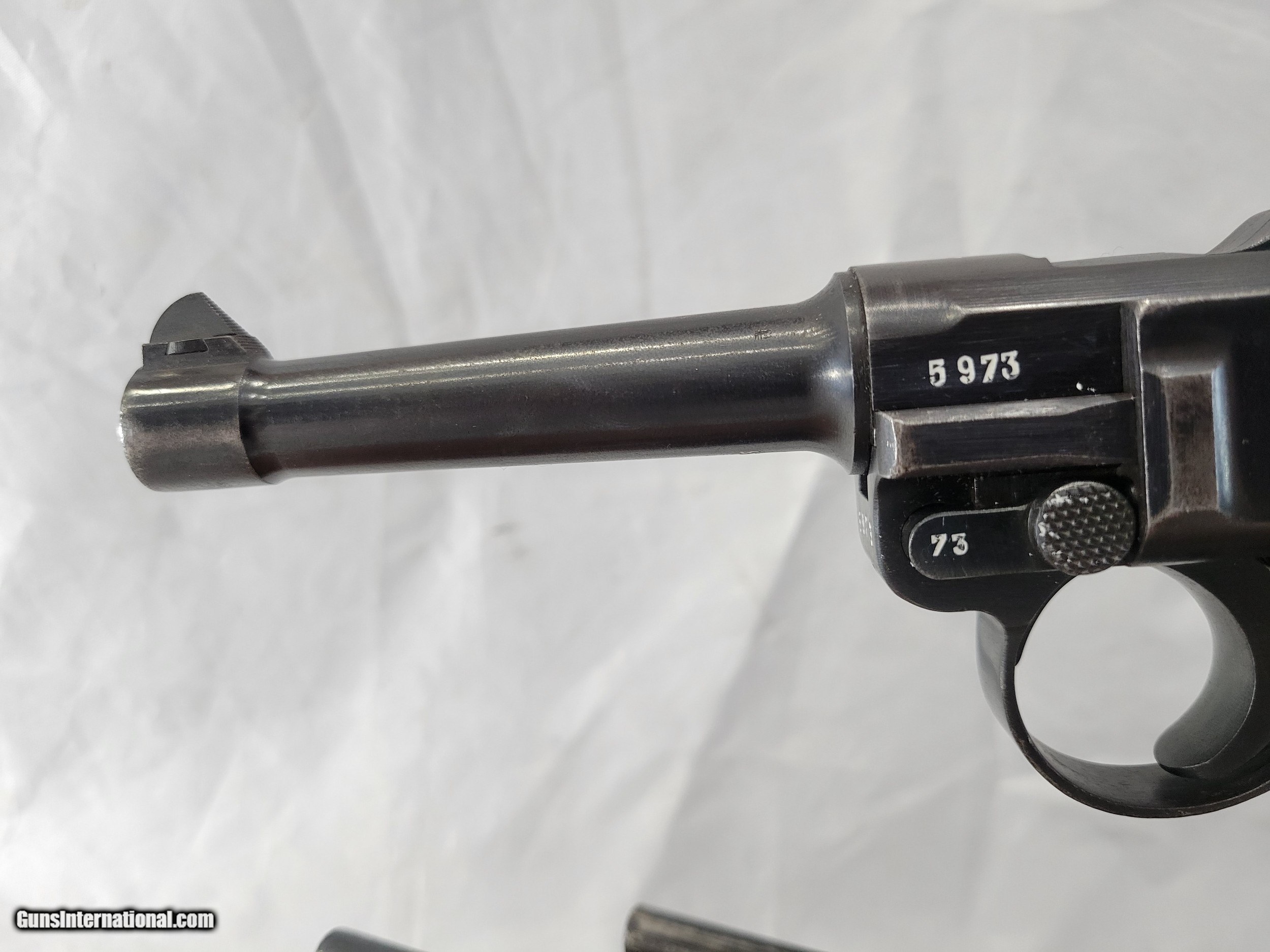 Description: INV. 11001 VERY RARE, MAUSER, "BLACK WIDOW" RIG, LUGER P.08, "BYF. 41", CAL. 9MM. SER. 5973L. IN TRULY AWESOME CONDITION. POSSIBLY THE FINEST EXAMPLE I HAVE EVER HAD. THIS "ATTIC BLACK WIDOW" HAS RETAINED 98-99% OF THE ORIGINAL BLUE. THE LITTLE LOSS THERE IS, IS FROM THE USUAL SHARP EDGE SILVERING, SOME VERY SMALL SCATTERED PIN PRICKS AND ONE SMALL BLEMISH., TYPICALLY FROM HOSTER WEAR, PLUS THE ALWAYS PRESENT SAFETY LEVER SCRATCH. THE GRIPS STRAPS SHOW NO SIGN OF GRAYING. THERE ARE NO OTHER BLEMISHES OF ANY KIND. ALL PARTS MATCH AND HAVE THE CORRECT NAZI WAFFENAMTS**. THE ORIGINAL "BLACK WIDOW" GRIPS AND GRIP SCREWS ARE ALSO FLAWLESS. THE SLIDE RAILS, BOLT FACE AND FEED RAMP SHOW LITTLE USE IF ANY USE. THE BORE, LIKE THE REST OF THE GUN IS SUPER, MIRROR BRIGHT WITH RAZOR SHARP RIFLING NOT A WHISP OF FROST ANYWHERE.. IT COMES WITH TWO ORIGINAL 'TDK" BLACK WIDOW MAGAZINES STAMPED, "FXO EAGLE/33A 194". A FINE BLACK LEATHER HOLSTER STAMPED, "KARL BOCKER, WALBROL, EAGLE /WaA727/SWASTIKA DATED 1940" AND A TAKEDOWN TOOL STAMPED EAGLE/555.THIS "ATTIC BLACK WIDOW RIG" IS AN AWESOME COLLECTION CENTER PIECE FOR EVEN THE MOST PICKY INVESTOR/COLLECTOR. MODESTLY PRICED AT....$6495.***. **THE WHITE WAX CRAYON IS TO SHOW THE MARKINGS ARE PROPER.. IT IS EASILY REMOVED WITH LIGHTER FLUID AND A BRUSH. WE WILL DO IT ON REQUEST ***100% OF THE GUNS PRICE IS SATISFACTION GUARANTEED To purchase this firearm or if you want to request more information contact us at: Email ckguns[at]ymail[dot]com Phone 201-512-0002 Cell 201-575-6838 FAX 201-215-4759 We accept most major credit cards. Prices shown are Discounted 3% for Cash or Check. The buyer must be familiar with all the laws governing the purchase and the ownership of firearms in their own city and state. The Yankee Armorer, Inc is not responsible for any failure to comply with or observe these laws. The Yankee Armorer, Inc will only ship after full payment and receipt of all required documents. Shipping: Add $35.00 for handguns, $45.00 for long guns. New Jersey buyers are subject to a 7% sales tax. The Yankee Armorer, Inc offers a 3 day inspection period with full refund upon return of intact firearm and in the original condition. The Yankee Armorer, Inc offers a no interest lay away program - 25% down; 25% in 30 days; 25% in 60 days; and full payment in 90 days. Any violation of this policy is subject to restocking and forfeiture of all payments. Any variation from this policy must be agreed to in advance. Unshipped Cancelled sales are subject to a 20% restocking fee. Be advised that all firearms sold by The Yankee Armorer, Inc. or the Gun Exchange, LLC (SELLER) are sold as collector’s items. They have not been fired or tested for safety and must be examined by a license gunsmith prior to use. By purchasing any item from the (SELLER), you are agreeing to hold the (SELLER) free from any damages or lawsuits of any nature. Any item left for transfer or storage will be charged to $25.00 per month, per item from the day of its receipt. Any variation from this policy must be agreed to in advance. Store hours 10:00 am to 5:00 pm Tuesday -Saturday. It's always best to call for appointment. Store 201-512-0002, cell 201-575-6838. SOLD |