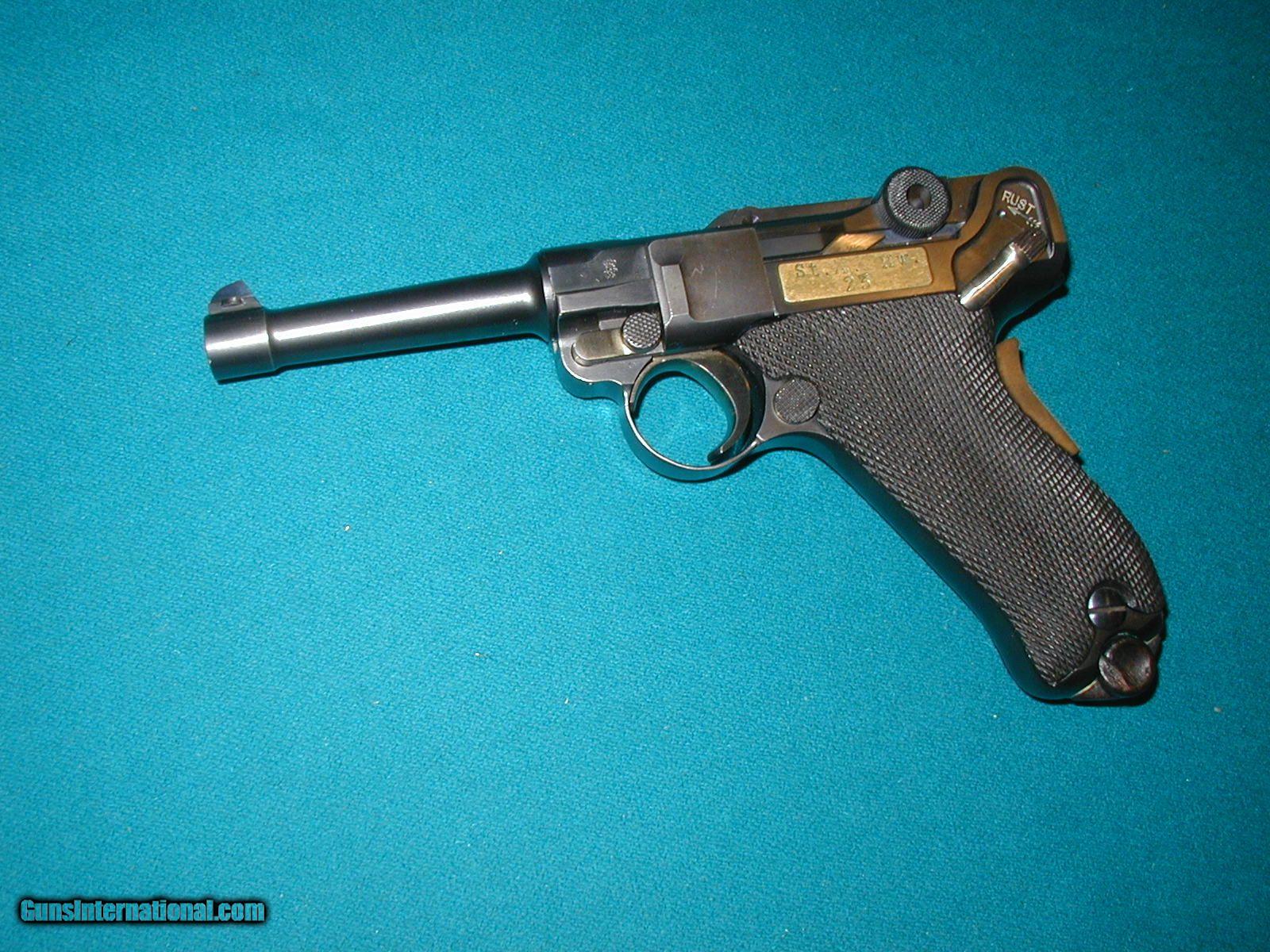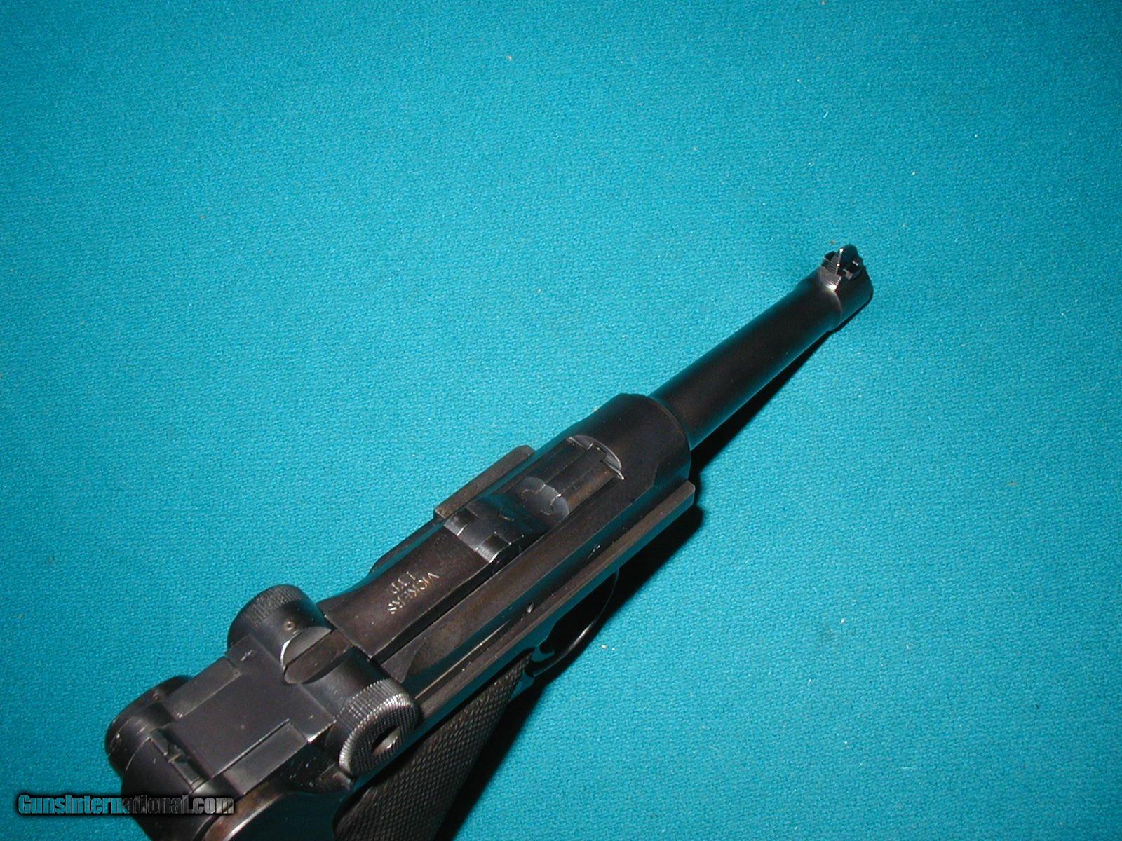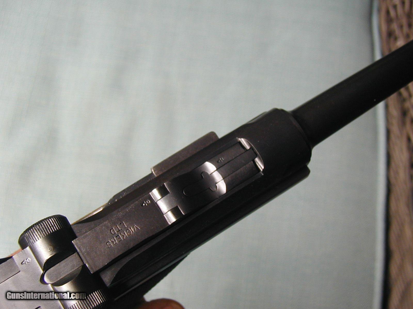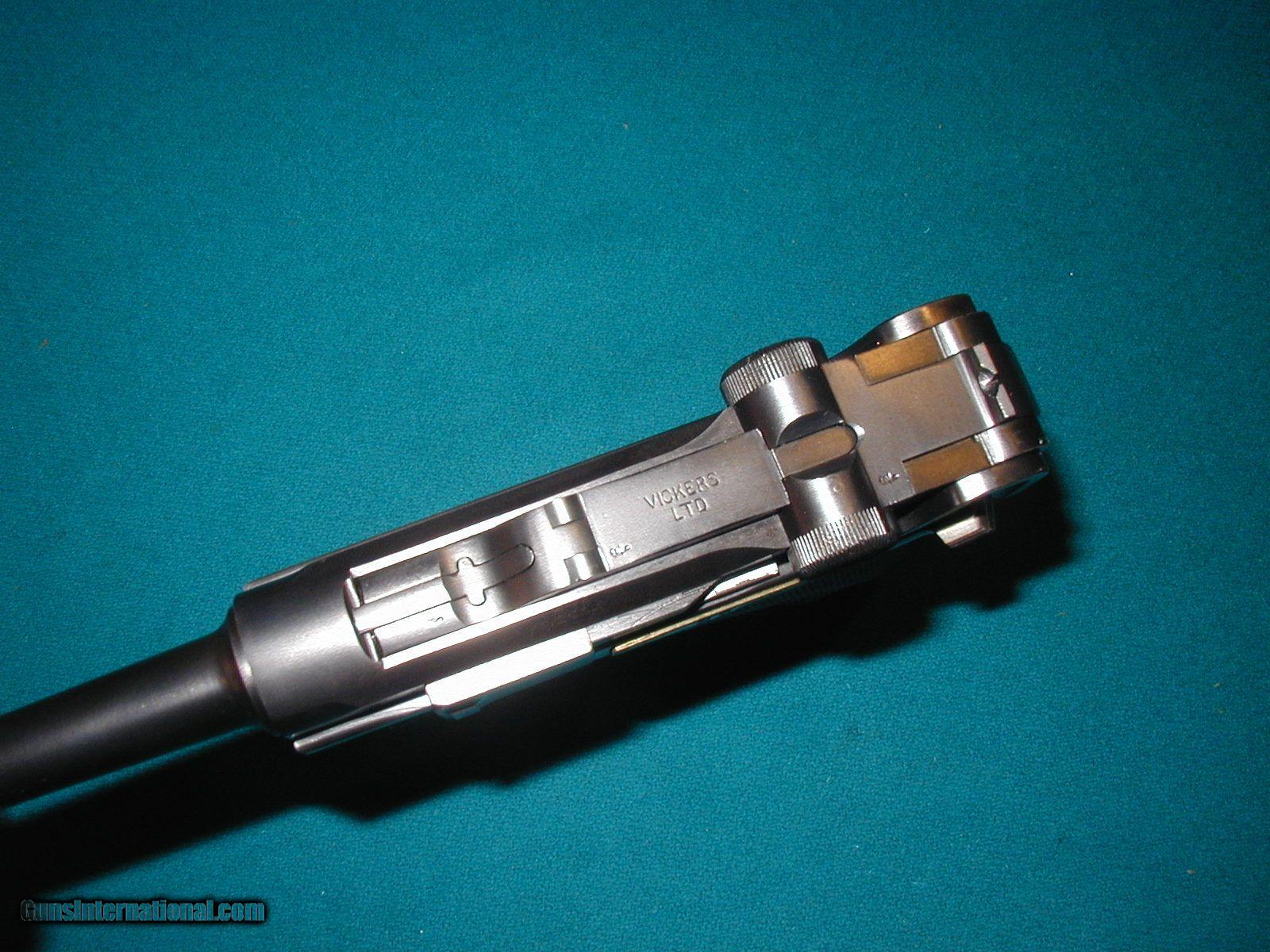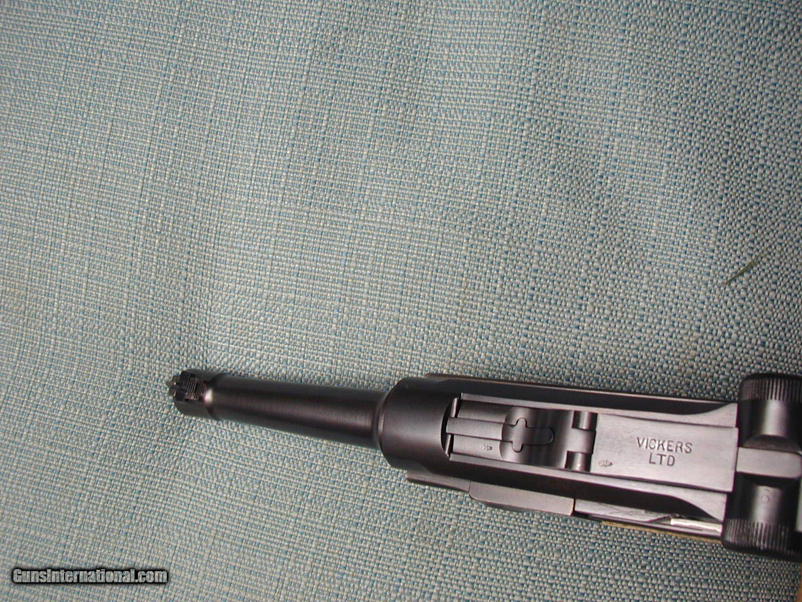Description: THIS IS A SUPER NICE ALL ORIGINAL VICKERS DUTCH CONTRACT LUGER IN 9MM....STILL RETAINS IT'S ORIGINAL PLAQUE....ALL MATCHING WITH THE EXCEPTION OF THE MAGAZINE....NICE BORE, MOSTLY BRIGHT WITH LIGHT FROSTING...GREAT GRIPS...STILL RETAINS VIRTUALLY ALL OF IT'S ORIGINAL BLUE FINISH WITH FIRE BLUE ON FRONT SIGHT, GRIPS SCREWS AND OTHER VARIOUS PARTS...MOST ALL OF IT'S STRAW....WAY ABOVE AVERAGE BRITISH MADE VICKERS..C&R OK SOLD Curio/Relic: Yes |