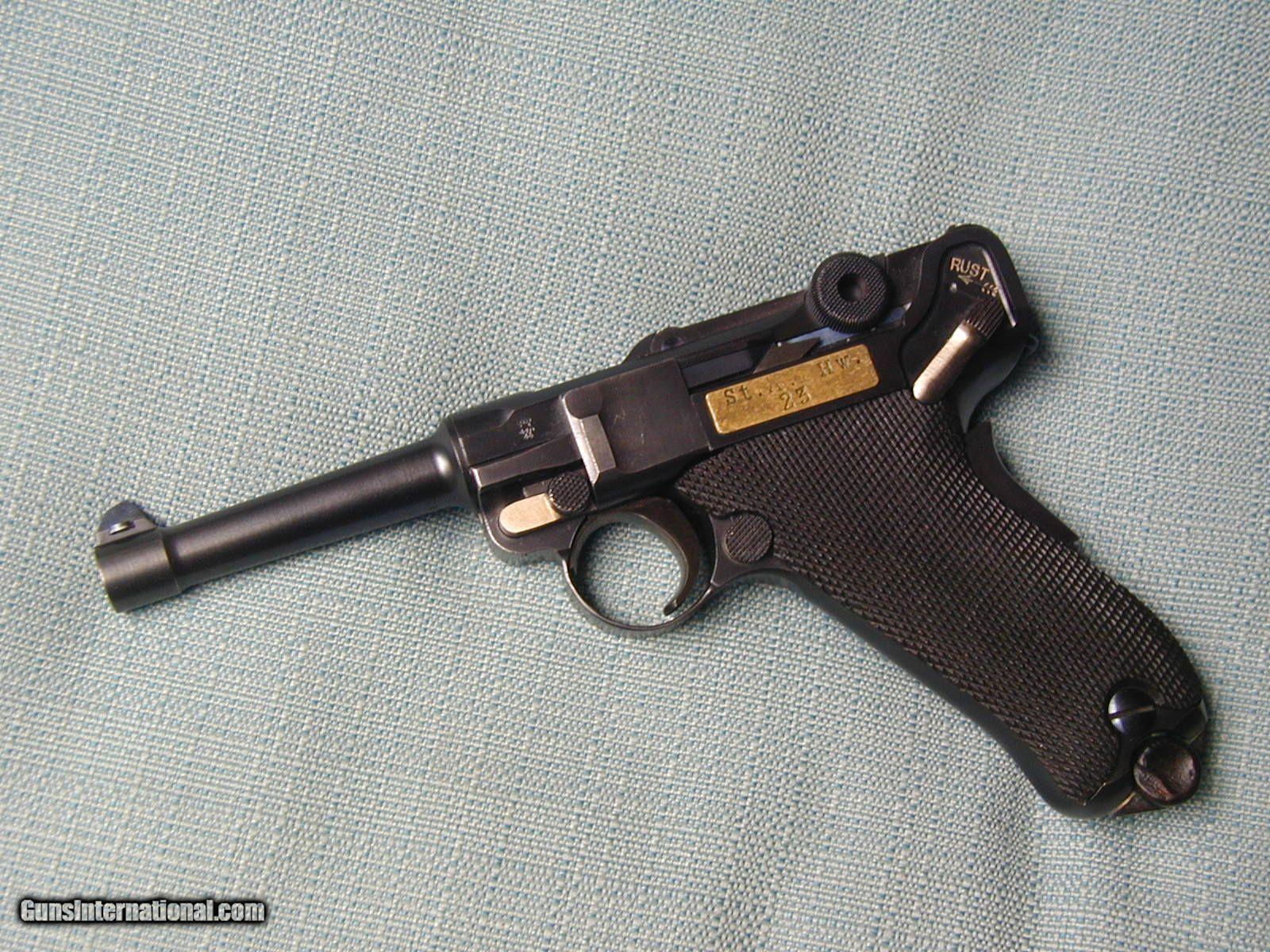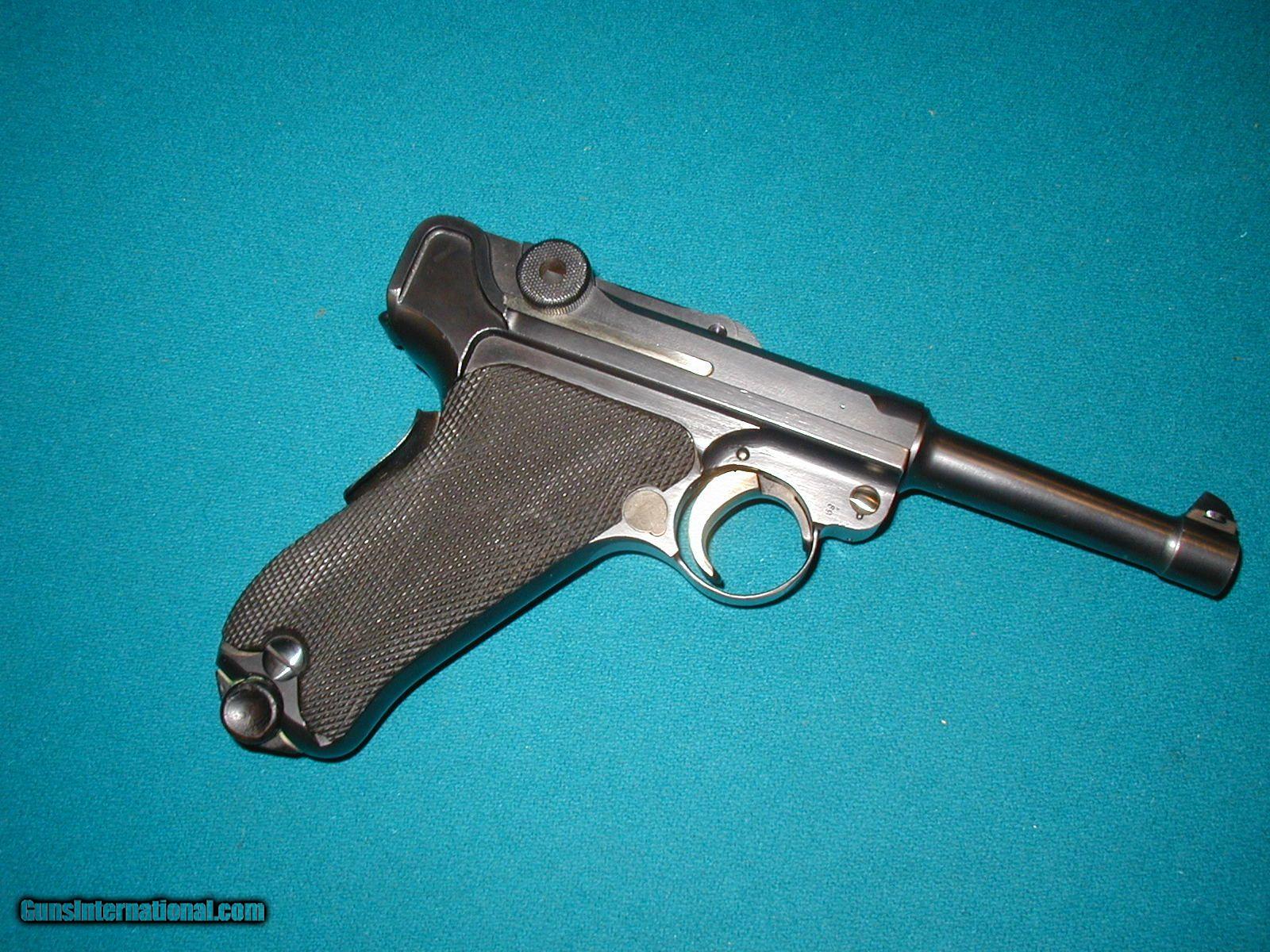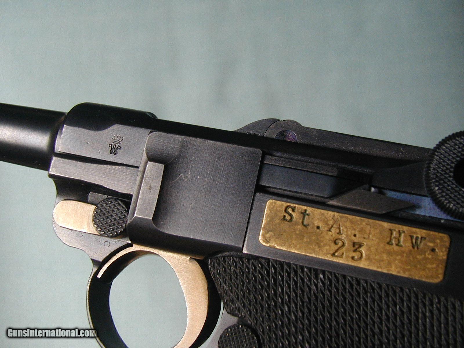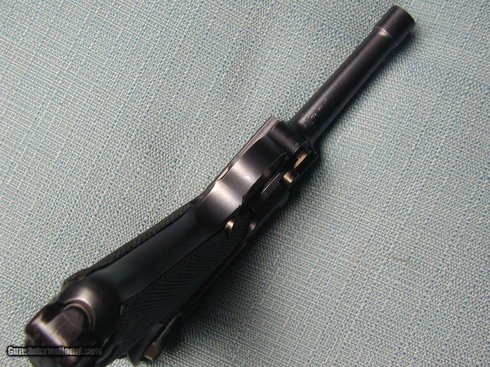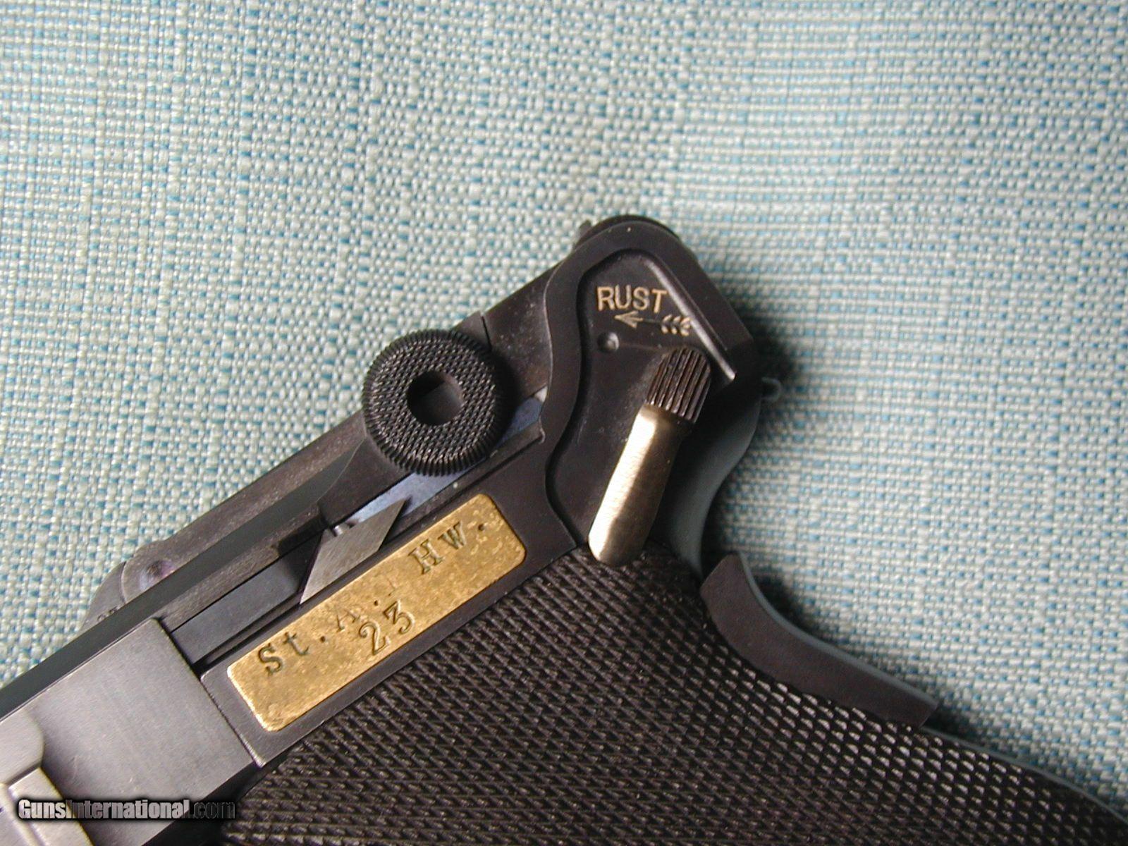 Description: THIS IS A SUPER NICE ALL ORIGINAL VICKERS DUTCH CONTRACT LUGER IN 9MM....STILL RETAINS IT'S ORIGINAL PLAQUE....ALL MATCHING WITH THE EXCEPTION OF THE MAGAZINE....NICE BORE, MOSTLY BRIGHT WITH LIGHT FROSTING...GREAT GRIPS...STILL RETAINS VIRTUALLY ALL OF IT'S ORIGINAL BLUE FINISH WITH FIRE BLUE ON FRONT SIGHT, GRIPS SCREWS AND OTHER VARIOUS PARTS...MOST ALL OF IT'S STRAW....WAY ABOVE AVERAGE BRITISH MADE VICKERS..C&R OK SOLD Curio/Relic: Yes |
