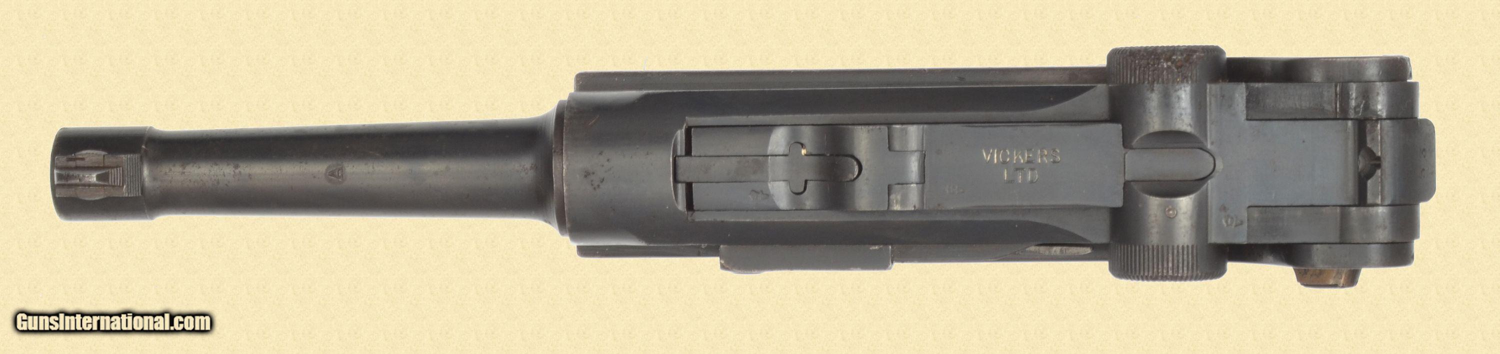 Description: 9mm; 80% blue, 80% straw, fair bore, fair grips, 4'' barrel, Made by Vickers and delivered to the Dutch East Indies Armyin 1922. Early style brass plate (rare) on front of trigger guard is marked KK over 1 (Officers School Pistol #1) Capital A mark on top of narrel is middle is unknown? Marking grip safety is mismached but period replacement grips are matching numbers. Marked East Indies Arsenal Manufacture. Replacement magazine is plain wood bottom of the period, but not Dutch style. Very rare historic Luger. SOLD Serial Number: 7053 |