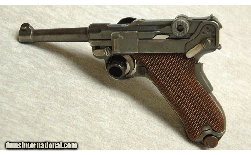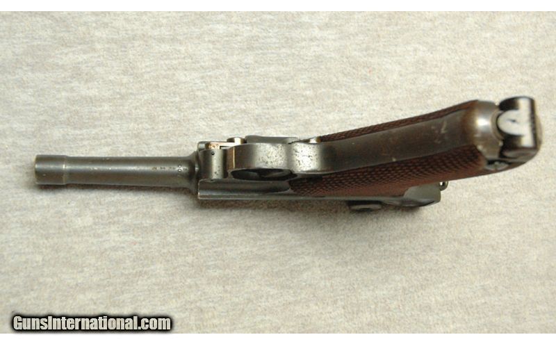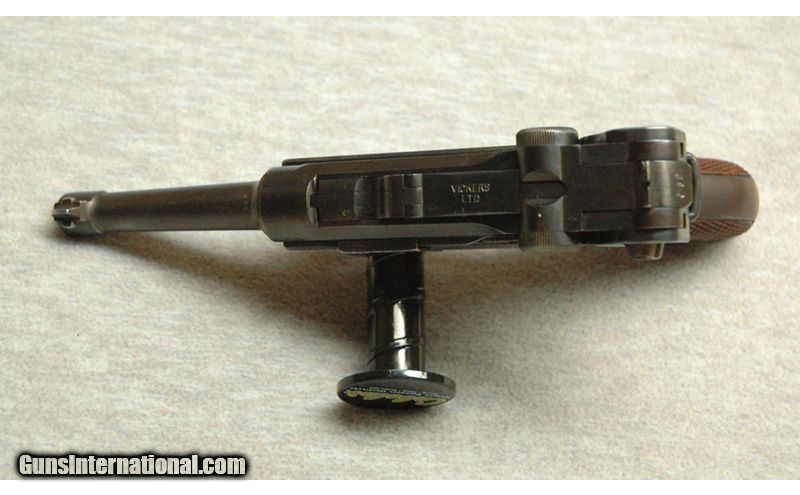 Description: Fair condition, finish wear, nicks and scratches, few areas of light corrosion. All visible numbers match. Vickers Lugers are basically similar to the Dutch East Indies Lugers delivered by DWM before 1914. The only difference lies in the markings and finish. The front toggle link carries the words "VICKERS LTD" instead of the DWM scroll. Most guns have the coarse checkered grips with the "GS" (weapons maker school, the fabricator of parts in Java). The finish is not as well done as the DWM pistols. The Vickers pistols carry the crown "W" on the left side of the receiver (initially on the right side). All are marked "RUST" (Dutch for SAFE) in the safety area. 9mm Luger SOLD Chambers: Semi auto Metal Condition: Fair Wood Condition: Grips are in good condition Barrels: 4 Triggers: Toggle link action Butt Pad: Wood grips Sights: Fixed sights Item Location: La Vista, NE |