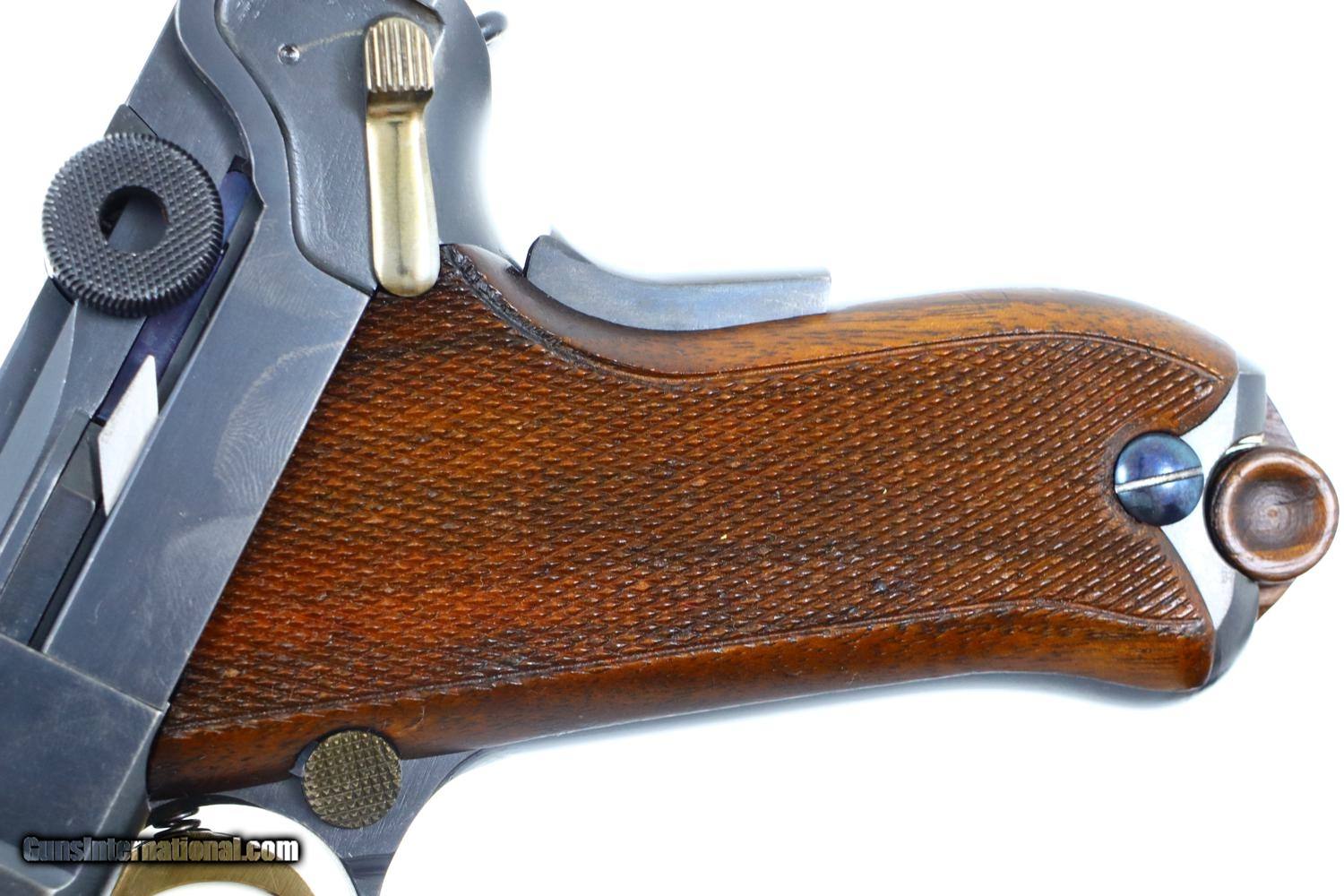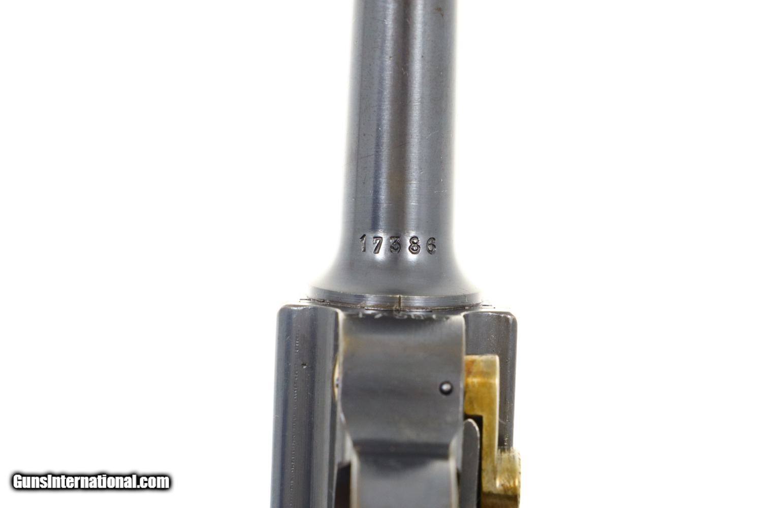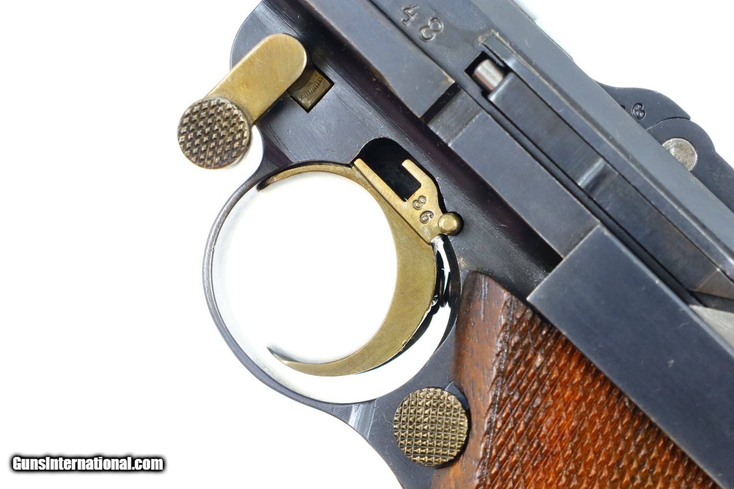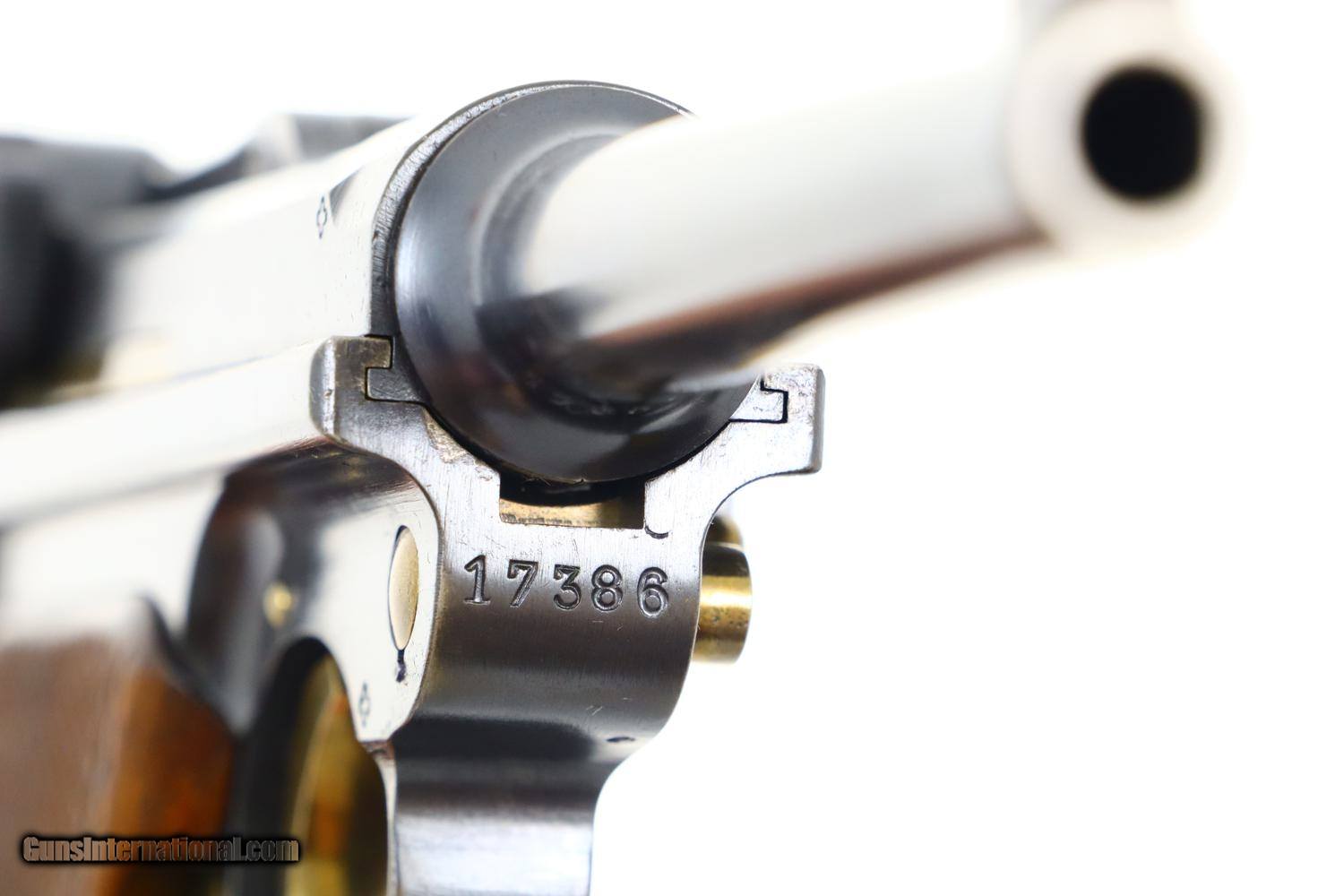 Description: Synopsis: Beautiful Swiss Luger, 1906/24, 1924, Bern Military Pistol, 17386, FB00801 Description: Standard configuration Bern 1906/24, .30 Luger, with 4.75” barrel having drift adjustable front sight and fixed rear sight. Blank chamber. Middle link with WAFFENFABRIK BERN. “P 48" on left side of barrel extention, reflecting deaccession in 1948. Full serial number under barrel and forward frame with the last few digits under the sideplate, trigger, barrel extension, and on all three components of the toggle, grip safety and both grips. Scattered Swiss crosses in usual locations. Strawed takedown lever, trigger, magazine release button, ejector and safety lever. Import markings. Correct magazine with tinned body and unmarked walnut plug. Condition: Beautiful, bright rust blue, at least 98% arsenal blue, only minimal sharp edge wear as one might expect from a pistol that has not seen much service. Comparable condition front and backstraps. Polished rear toggle pin. Small parts with vivid straw colors. Excellent grips and magazine. Mirror bore. Perfect manual mechanics. A gorgeous 1924 Swiss Military Luger whose only suggestion of reworking lies in the enhanced straw and fire bluing of the small parts. ~~Insured shipping fee of $55; most packages shipped using FedEx 2nd Day.~~ SOLD Manufacturer: W&F Bern Serial Number: 17386 Caliber Info: 0.3 |