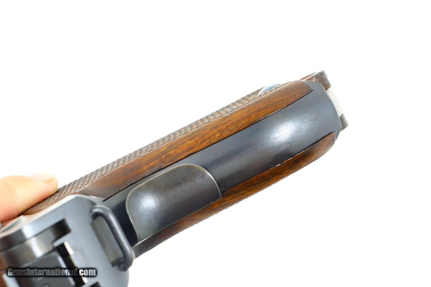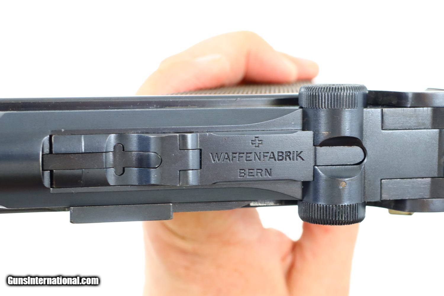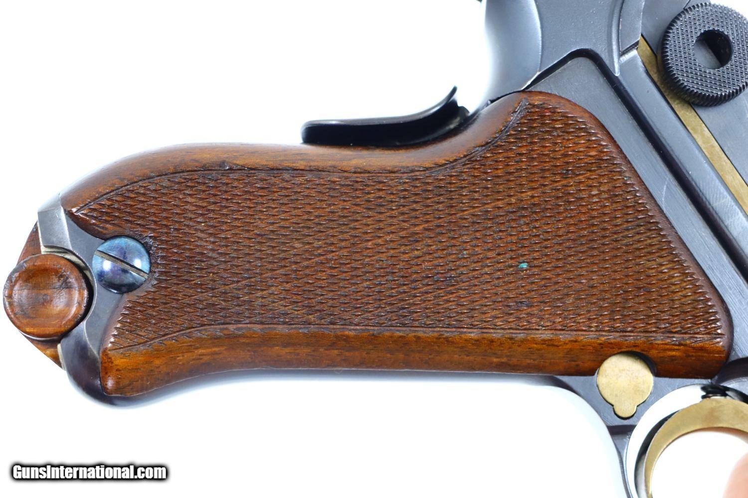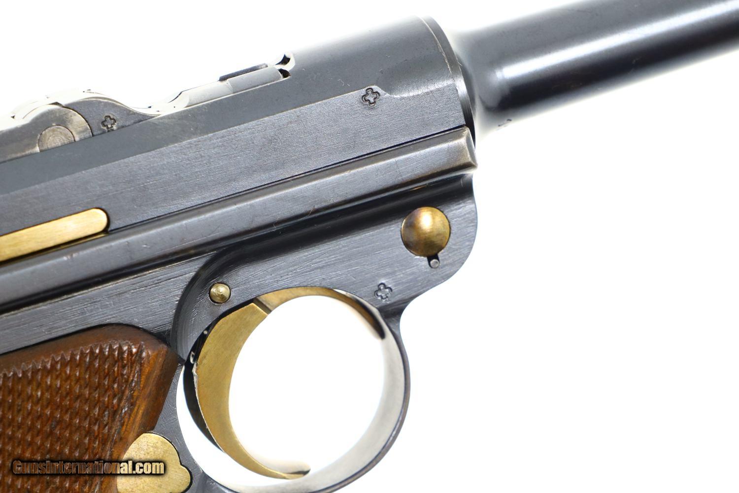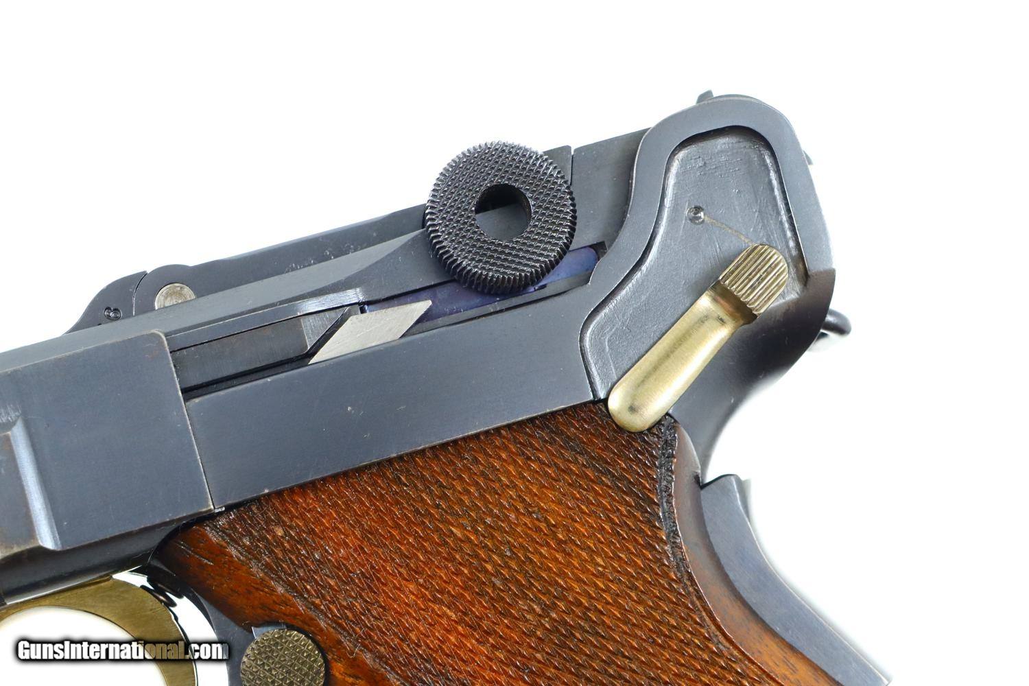 Description: Synopsis: Beautiful Swiss Luger, 1906/24, 1924, Bern Military Pistol, 17386, FB00801 Description: Standard configuration Bern 1906/24, .30 Luger, with 4.75” barrel having drift adjustable front sight and fixed rear sight. Blank chamber. Middle link with WAFFENFABRIK BERN. “P 48" on left side of barrel extention, reflecting deaccession in 1948. Full serial number under barrel and forward frame with the last few digits under the sideplate, trigger, barrel extension, and on all three components of the toggle, grip safety and both grips. Scattered Swiss crosses in usual locations. Strawed takedown lever, trigger, magazine release button, ejector and safety lever. Import markings. Correct magazine with tinned body and unmarked walnut plug. Condition: Beautiful, bright rust blue, at least 98% arsenal blue, only minimal sharp edge wear as one might expect from a pistol that has not seen much service. Comparable condition front and backstraps. Polished rear toggle pin. Small parts with vivid straw colors. Excellent grips and magazine. Mirror bore. Perfect manual mechanics. A gorgeous 1924 Swiss Military Luger whose only suggestion of reworking lies in the enhanced straw and fire bluing of the small parts. ~~Insured shipping fee of $55; most packages shipped using FedEx 2nd Day.~~ SOLD Manufacturer: W&F Bern Serial Number: 17386 Caliber Info: 0.3 |