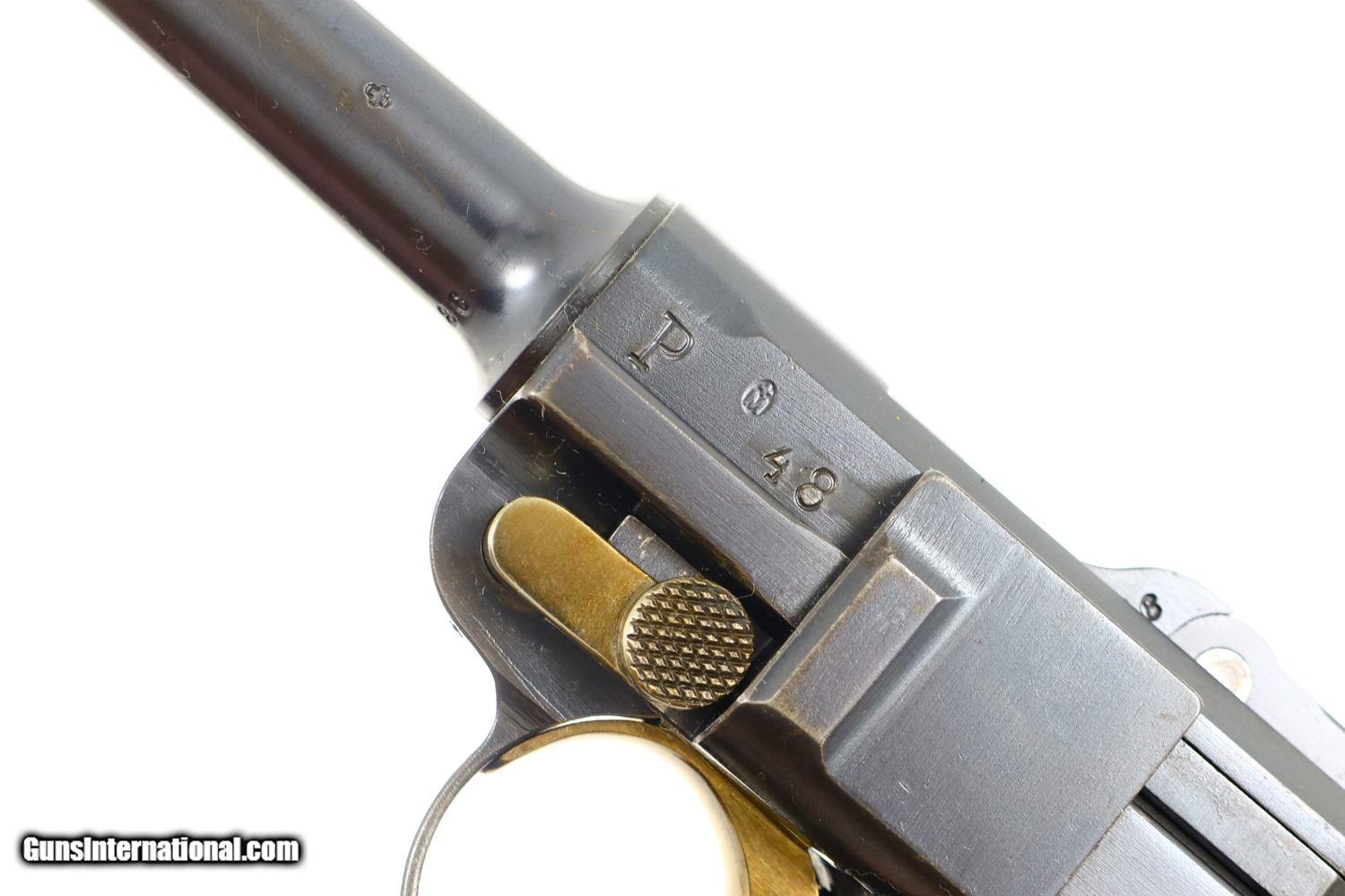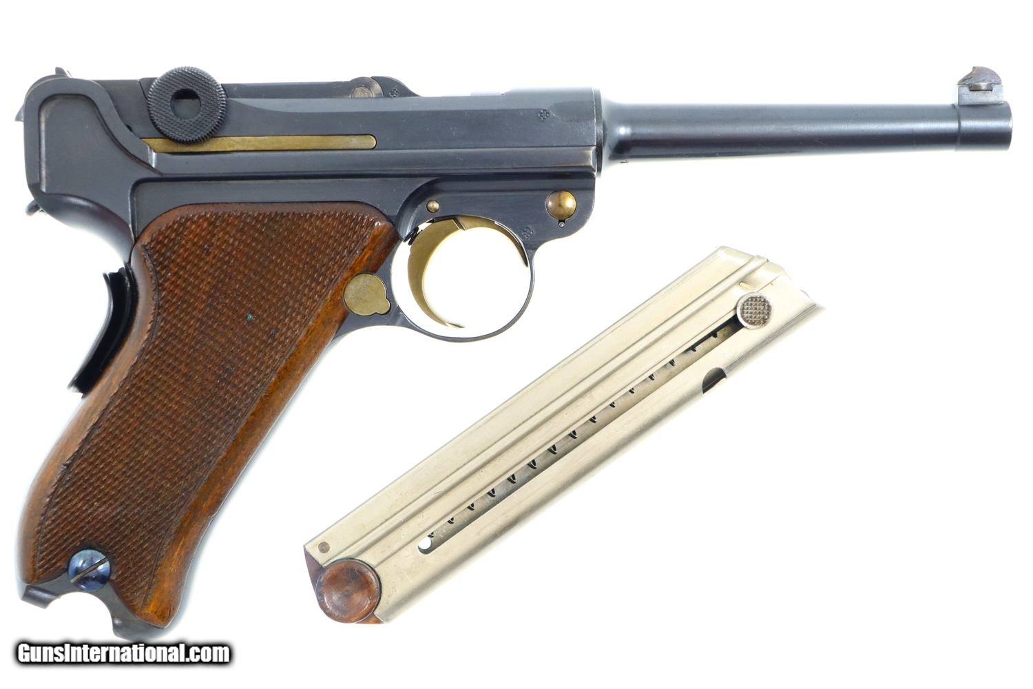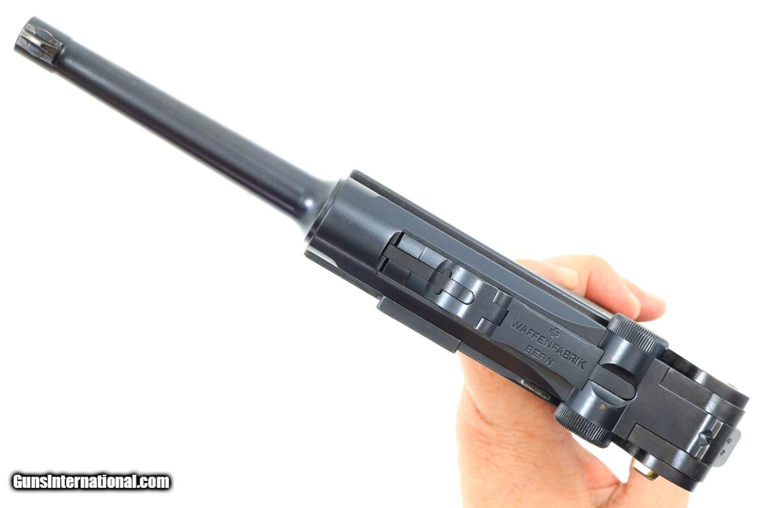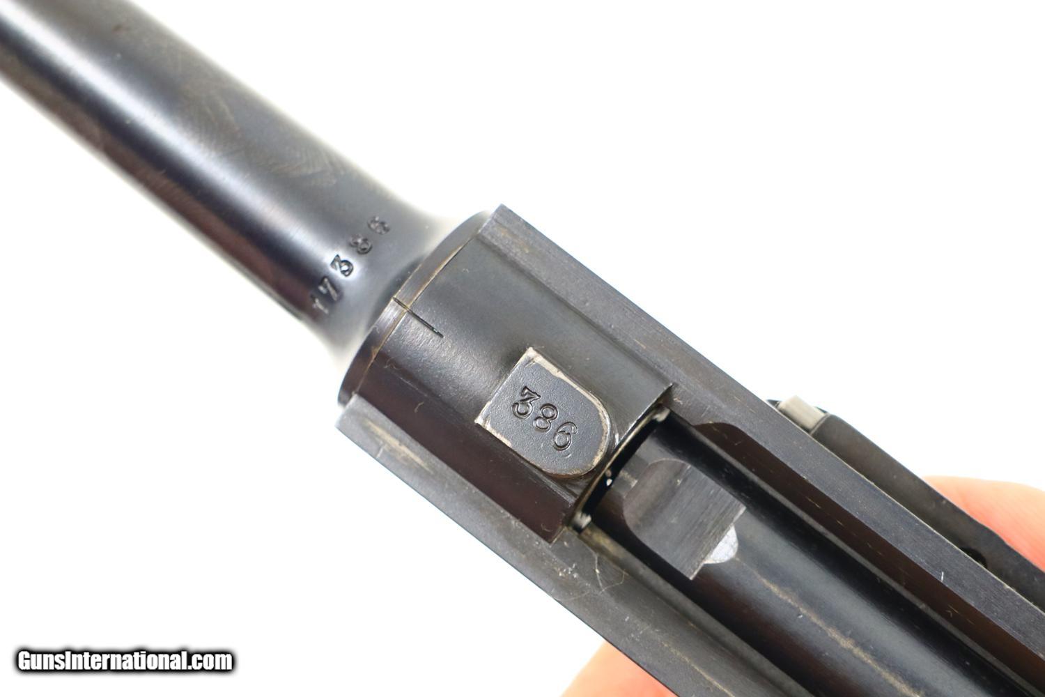 Description: Synopsis: Beautiful Swiss Luger, 1906/24, 1924, Bern Military Pistol, 17386, FB00801 Description: Standard configuration Bern 1906/24, .30 Luger, with 4.75” barrel having drift adjustable front sight and fixed rear sight. Blank chamber. Middle link with WAFFENFABRIK BERN. “P 48" on left side of barrel extention, reflecting deaccession in 1948. Full serial number under barrel and forward frame with the last few digits under the sideplate, trigger, barrel extension, and on all three components of the toggle, grip safety and both grips. Scattered Swiss crosses in usual locations. Strawed takedown lever, trigger, magazine release button, ejector and safety lever. Import markings. Correct magazine with tinned body and unmarked walnut plug. Condition: Beautiful, bright rust blue, at least 98% arsenal blue, only minimal sharp edge wear as one might expect from a pistol that has not seen much service. Comparable condition front and backstraps. Polished rear toggle pin. Small parts with vivid straw colors. Excellent grips and magazine. Mirror bore. Perfect manual mechanics. A gorgeous 1924 Swiss Military Luger whose only suggestion of reworking lies in the enhanced straw and fire bluing of the small parts. ~~Insured shipping fee of $55; most packages shipped using FedEx 2nd Day.~~ SOLD Manufacturer: W&F Bern Serial Number: 17386 Caliber Info: 0.3 |