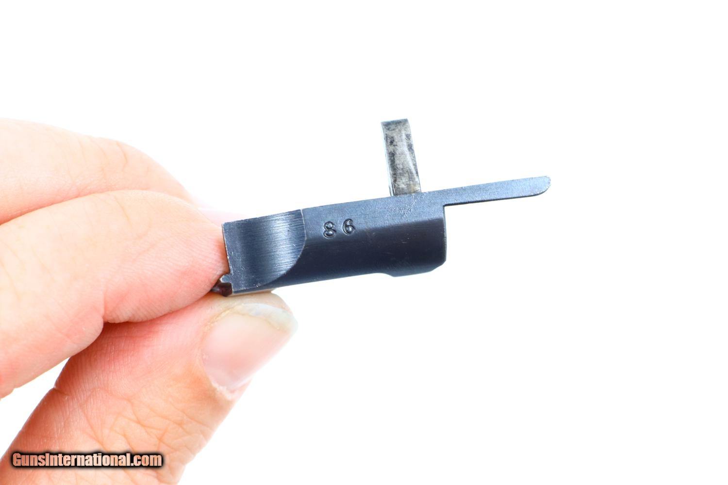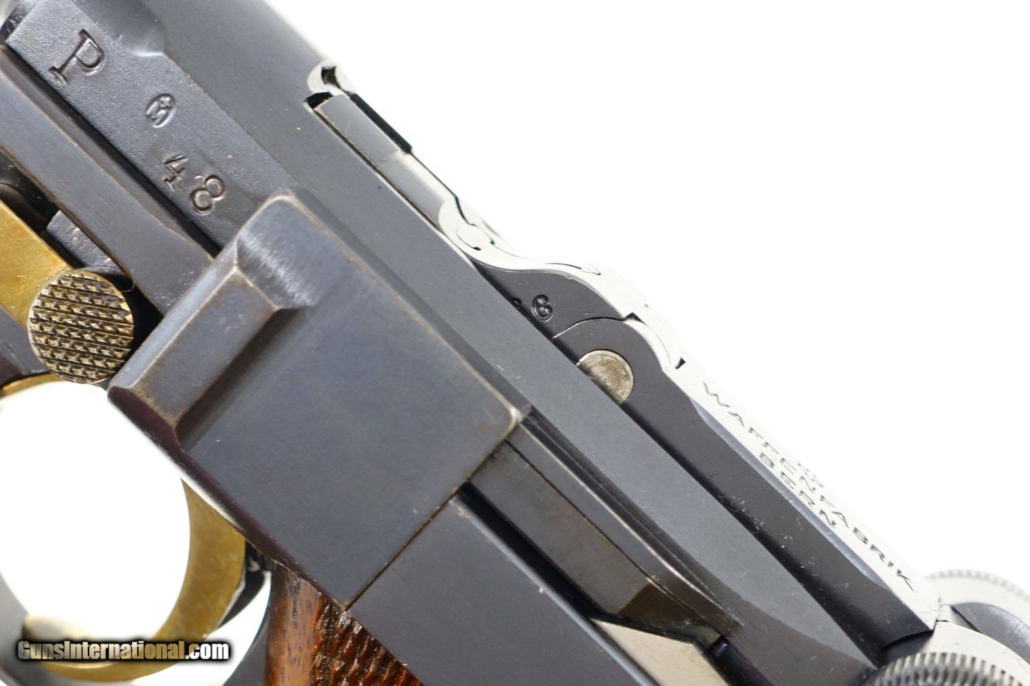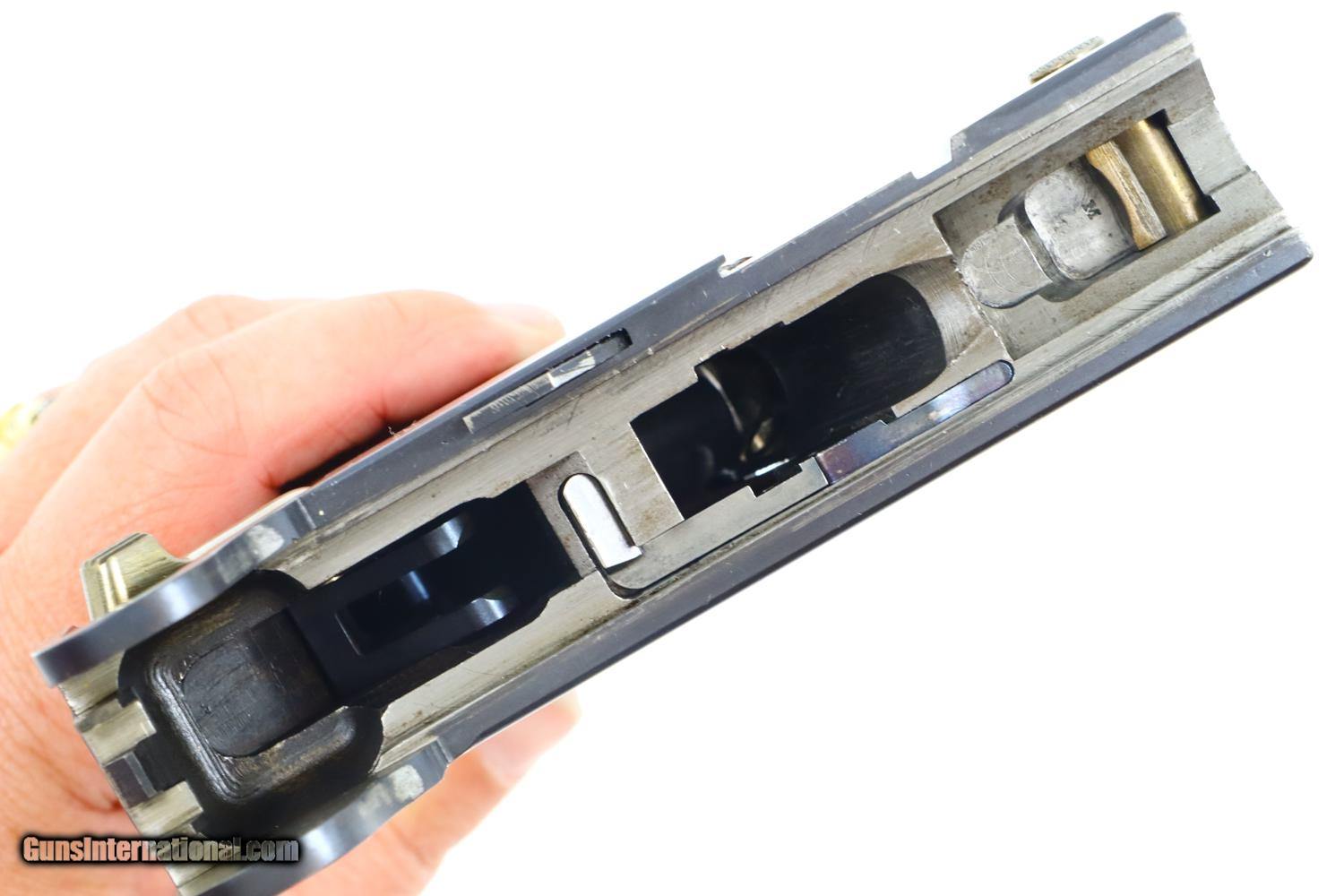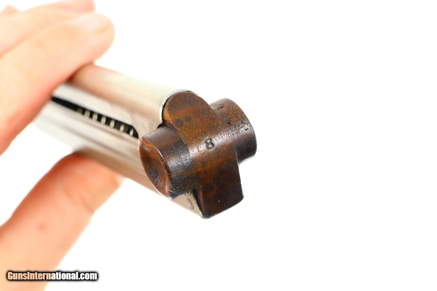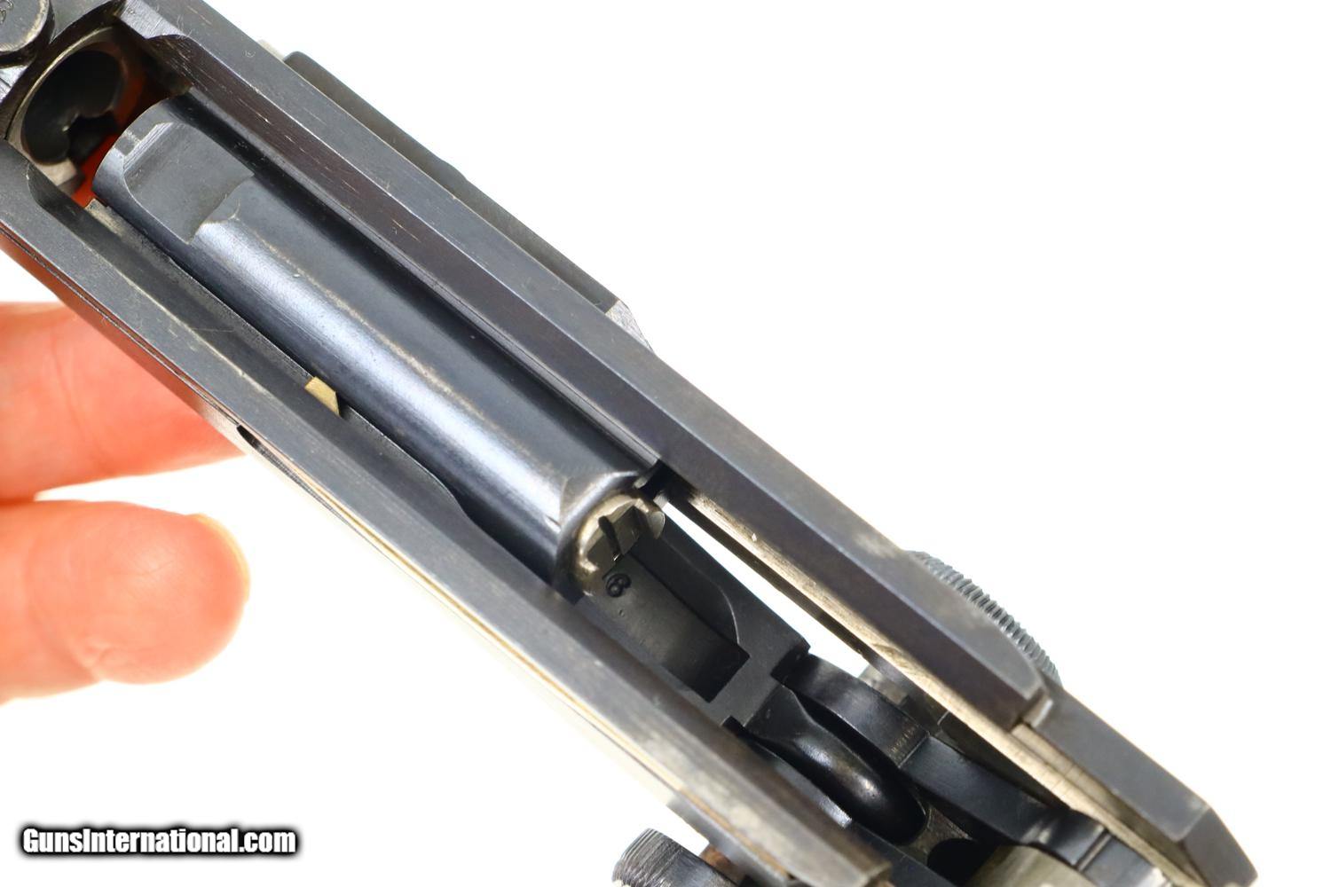 Description: Synopsis: Beautiful Swiss Luger, 1906/24, 1924, Bern Military Pistol, 17386, FB00801 Description: Standard configuration Bern 1906/24, .30 Luger, with 4.75” barrel having drift adjustable front sight and fixed rear sight. Blank chamber. Middle link with WAFFENFABRIK BERN. “P 48" on left side of barrel extention, reflecting deaccession in 1948. Full serial number under barrel and forward frame with the last few digits under the sideplate, trigger, barrel extension, and on all three components of the toggle, grip safety and both grips. Scattered Swiss crosses in usual locations. Strawed takedown lever, trigger, magazine release button, ejector and safety lever. Import markings. Correct magazine with tinned body and unmarked walnut plug. Condition: Beautiful, bright rust blue, at least 98% arsenal blue, only minimal sharp edge wear as one might expect from a pistol that has not seen much service. Comparable condition front and backstraps. Polished rear toggle pin. Small parts with vivid straw colors. Excellent grips and magazine. Mirror bore. Perfect manual mechanics. A gorgeous 1924 Swiss Military Luger whose only suggestion of reworking lies in the enhanced straw and fire bluing of the small parts. ~~Insured shipping fee of $55; most packages shipped using FedEx 2nd Day.~~ SOLD Manufacturer: W&F Bern Serial Number: 17386 Caliber Info: 0.3 |