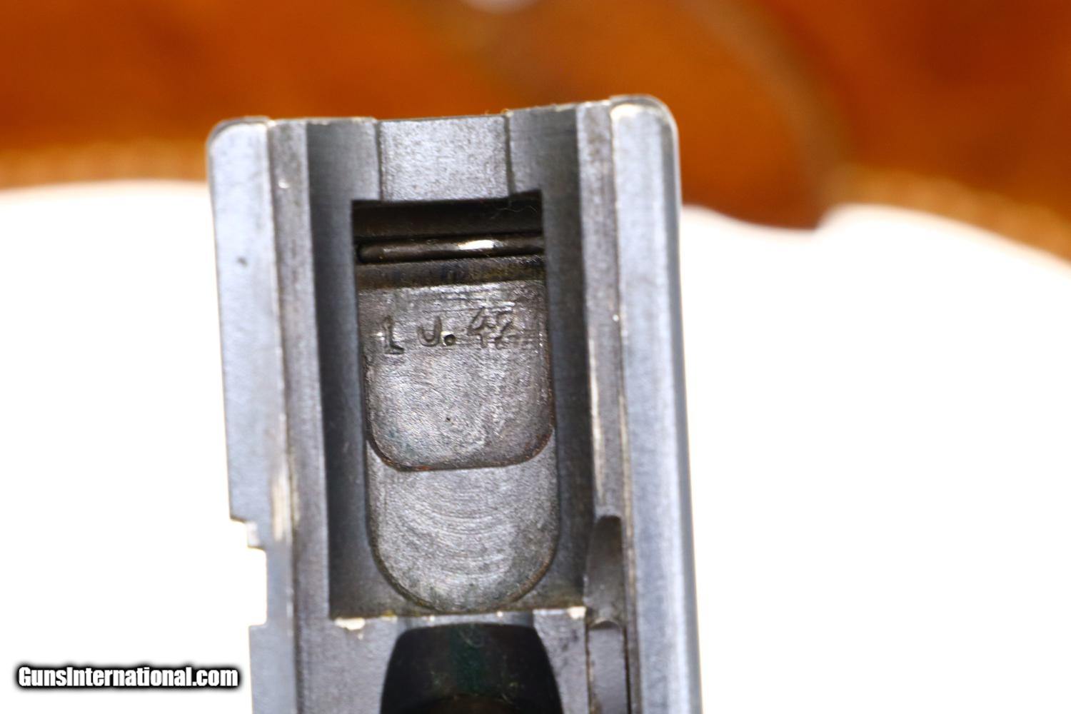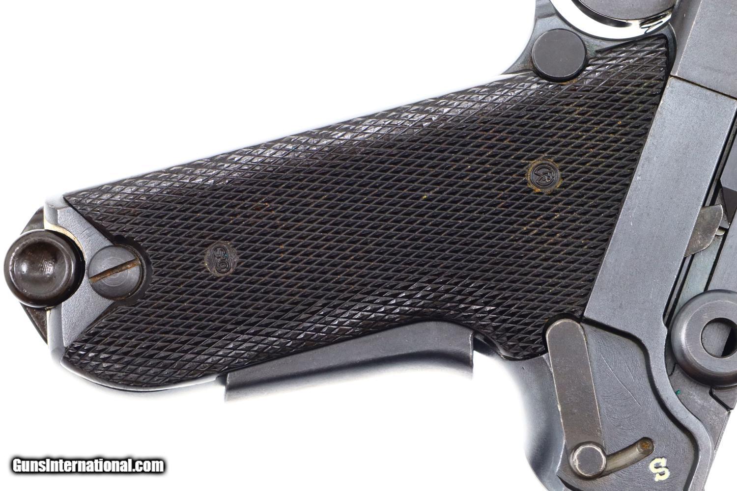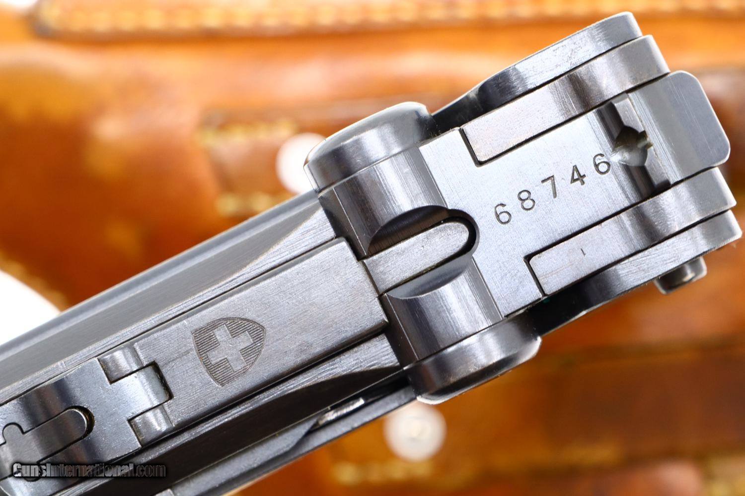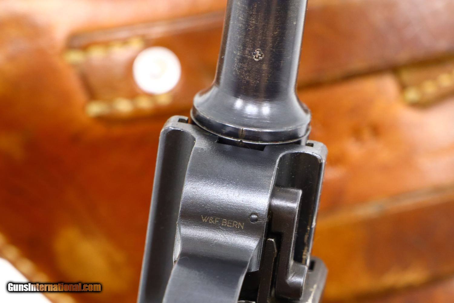 Description: Synopsis: W&F Bern, 1929, Swiss Military, Complete Rig, 68746, FB01041 Description: Standard mid-production Swiss Military 1929 Luger, this example made “10.42” (October 1942) complete with spare magazine closely dated holster and shoulder strap. Standard features include 4.75” barrel with drift adjustable front sight and fixed “U” rear sight. Full matching serial number on barrel, left rail, and rear toggle link with last three digits repeated on side plate and bottom of barrel extension. All small parts with usual inspector markings. “P” release marking on right rail. Forward frame recess marked “10.42” (October 1942). W/F logo on back of frame. Uniformly checkered chocolate brown grips with both magazines having brown plugs. Complete with correct Military holster dated “41” and an unmarked strap. Condition: VG/EXC arsenal reapplied blue, the front sight appearing as a traditional luger blade, light holster wear as one might expect from a pistol that has seen minimal use. Bright bore with sharp rifling. Perfect manual mechanics with both magazines. VG/EXC holster with VG strap. ~~Insured shipping fee of $55; most packages shipped using FedEx 2nd Day.~~ SOLD Curio/Relic: Yes Manufacturer: W&F Bern Serial Number: 68746 Caliber Info: 7.65mm |
