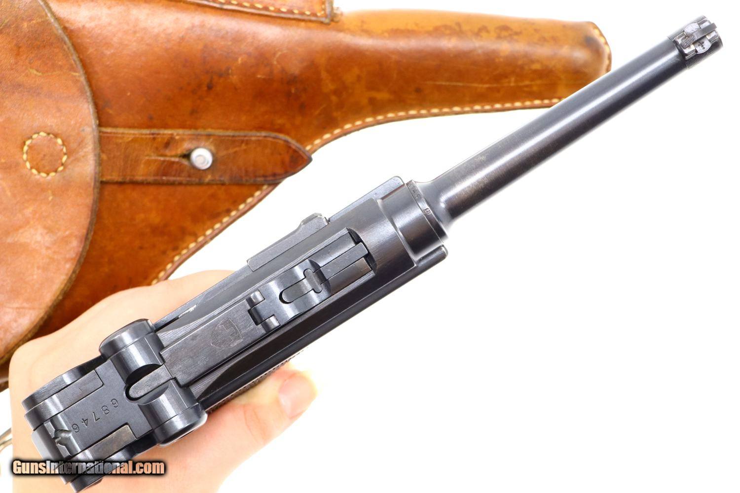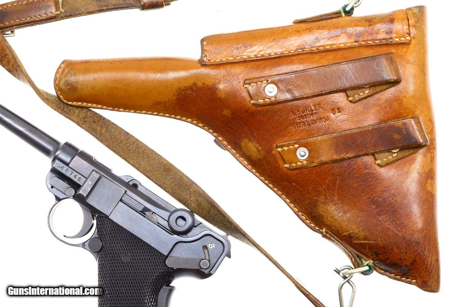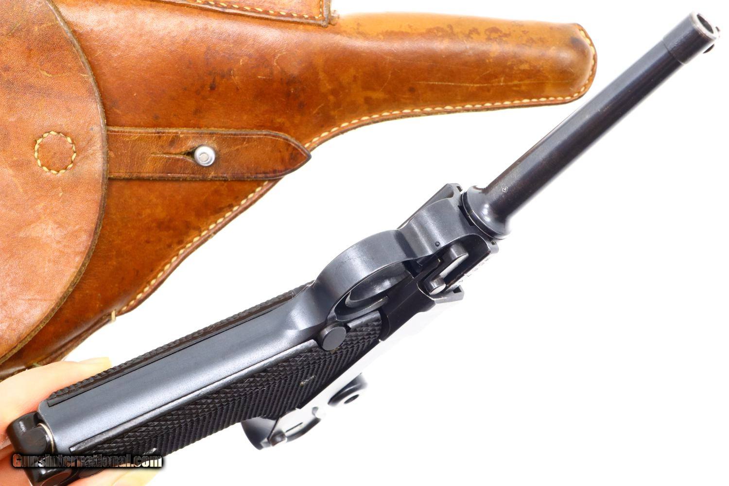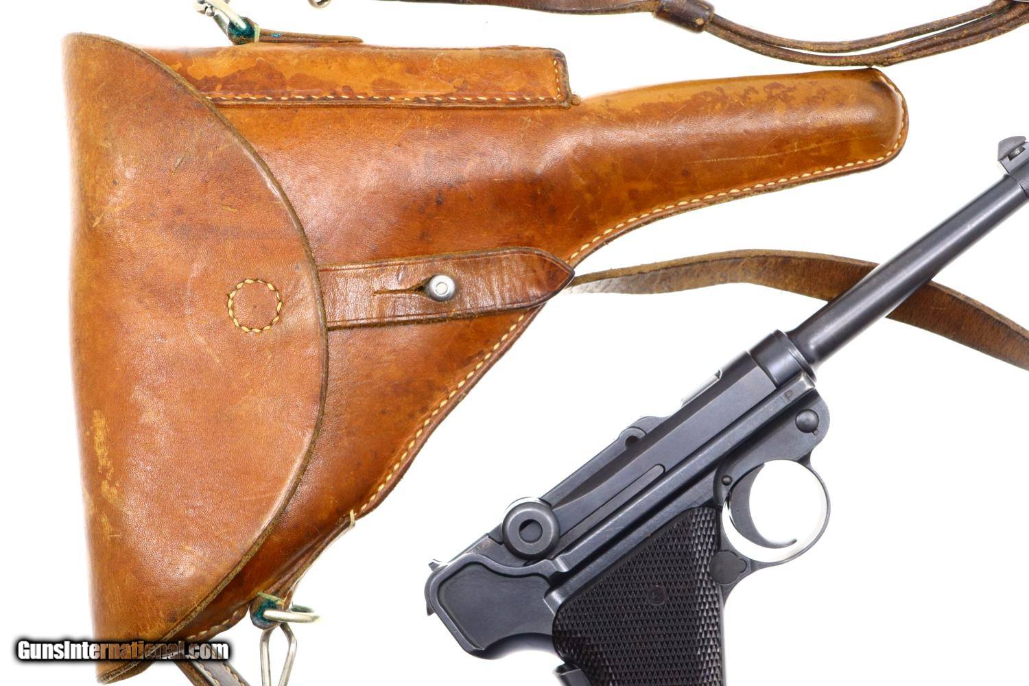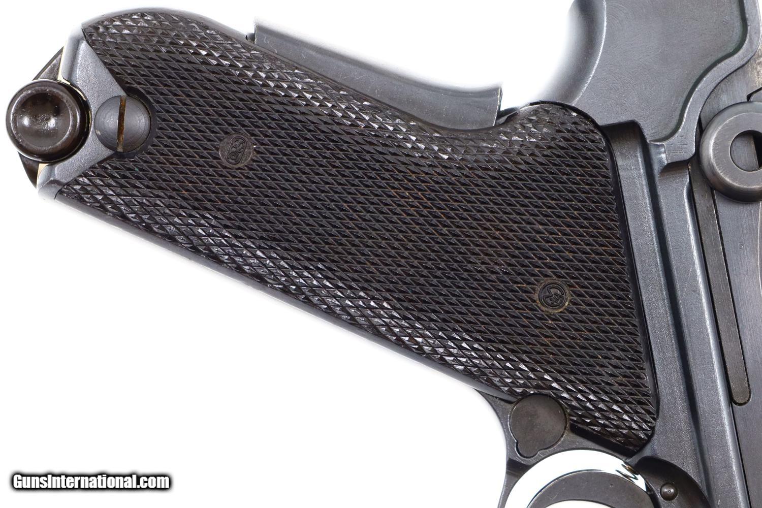 Description: Synopsis: W&F Bern, 1929, Swiss Military, Complete Rig, 68746, FB01041 Description: Standard mid-production Swiss Military 1929 Luger, this example made “10.42” (October 1942) complete with spare magazine closely dated holster and shoulder strap. Standard features include 4.75” barrel with drift adjustable front sight and fixed “U” rear sight. Full matching serial number on barrel, left rail, and rear toggle link with last three digits repeated on side plate and bottom of barrel extension. All small parts with usual inspector markings. “P” release marking on right rail. Forward frame recess marked “10.42” (October 1942). W/F logo on back of frame. Uniformly checkered chocolate brown grips with both magazines having brown plugs. Complete with correct Military holster dated “41” and an unmarked strap. Condition: VG/EXC arsenal reapplied blue, the front sight appearing as a traditional luger blade, light holster wear as one might expect from a pistol that has seen minimal use. Bright bore with sharp rifling. Perfect manual mechanics with both magazines. VG/EXC holster with VG strap. ~~Insured shipping fee of $55; most packages shipped using FedEx 2nd Day.~~ SOLD Curio/Relic: Yes Manufacturer: W&F Bern Serial Number: 68746 Caliber Info: 7.65mm |