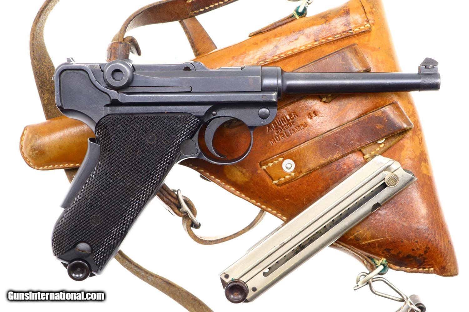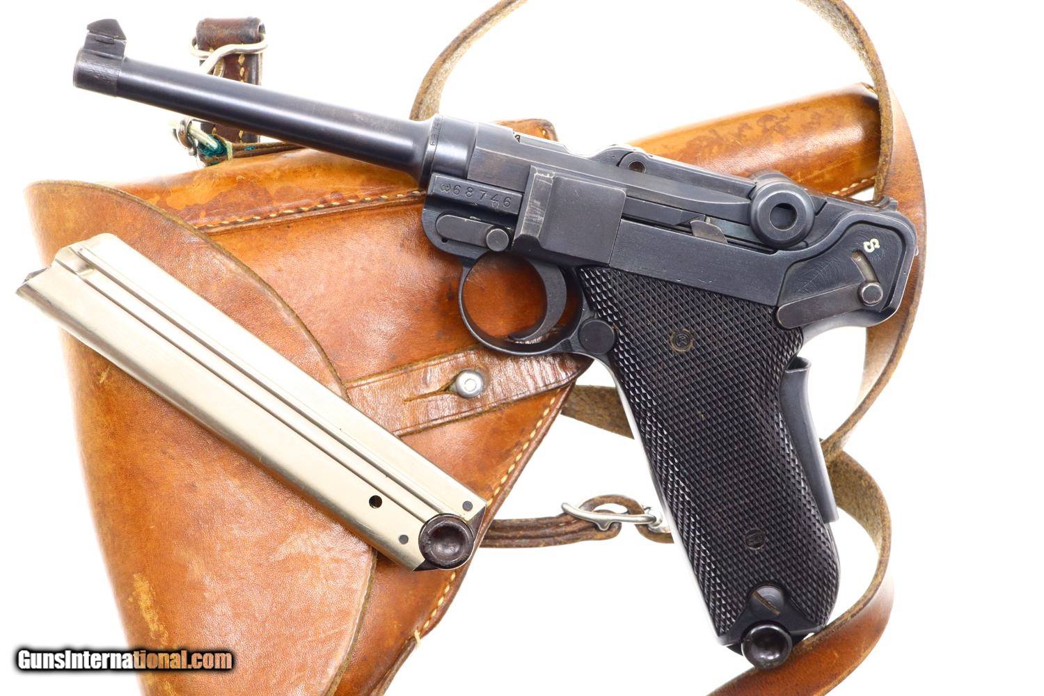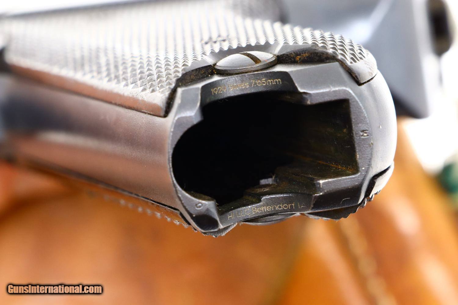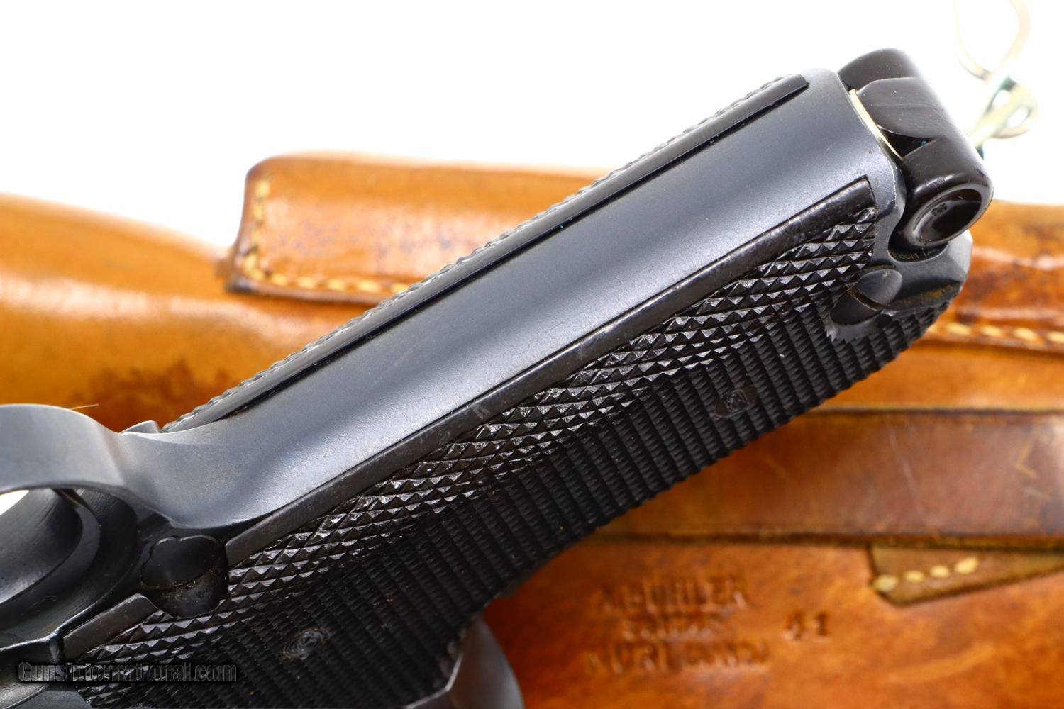 Description: Synopsis: W&F Bern, 1929, Swiss Military, Complete Rig, 68746, FB01041 Description: Standard mid-production Swiss Military 1929 Luger, this example made “10.42” (October 1942) complete with spare magazine closely dated holster and shoulder strap. Standard features include 4.75” barrel with drift adjustable front sight and fixed “U” rear sight. Full matching serial number on barrel, left rail, and rear toggle link with last three digits repeated on side plate and bottom of barrel extension. All small parts with usual inspector markings. “P” release marking on right rail. Forward frame recess marked “10.42” (October 1942). W/F logo on back of frame. Uniformly checkered chocolate brown grips with both magazines having brown plugs. Complete with correct Military holster dated “41” and an unmarked strap. Condition: VG/EXC arsenal reapplied blue, the front sight appearing as a traditional luger blade, light holster wear as one might expect from a pistol that has seen minimal use. Bright bore with sharp rifling. Perfect manual mechanics with both magazines. VG/EXC holster with VG strap. ~~Insured shipping fee of $55; most packages shipped using FedEx 2nd Day.~~ SOLD Curio/Relic: Yes Manufacturer: W&F Bern Serial Number: 68746 Caliber Info: 7.65mm |