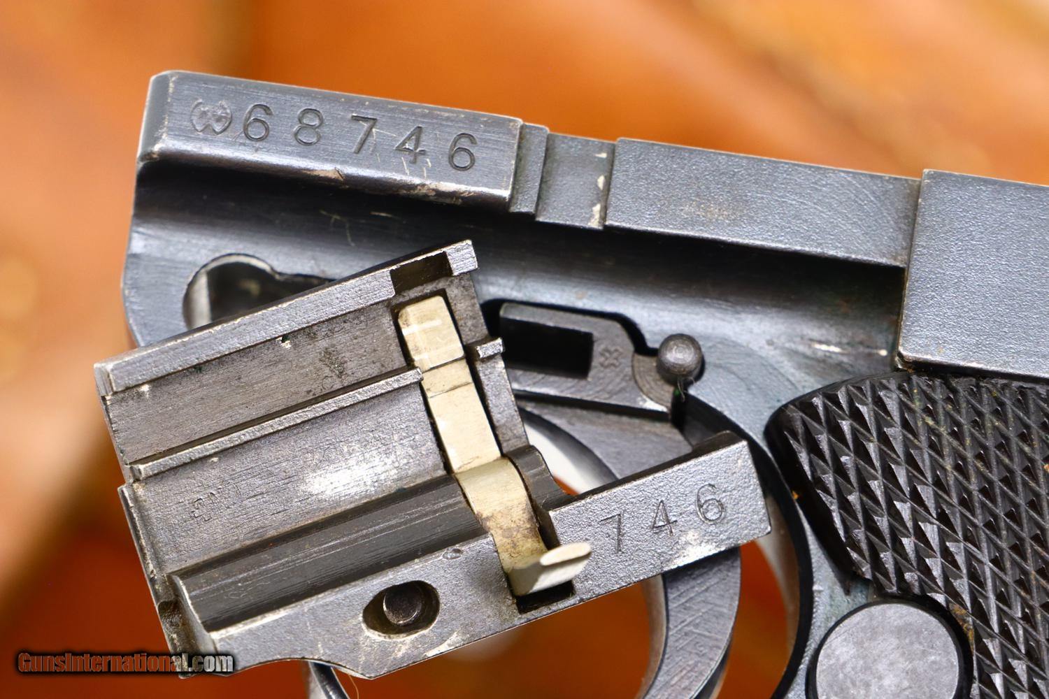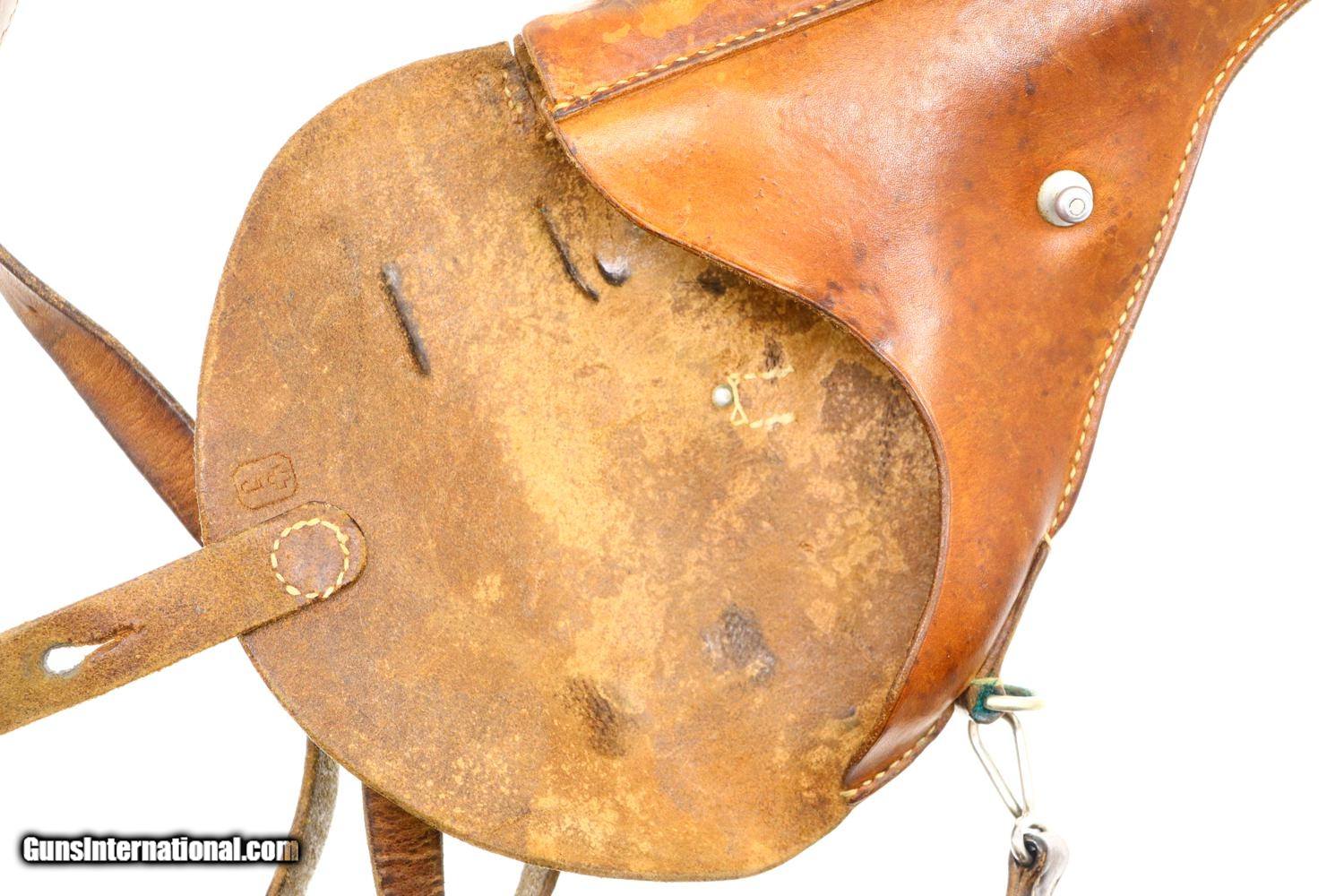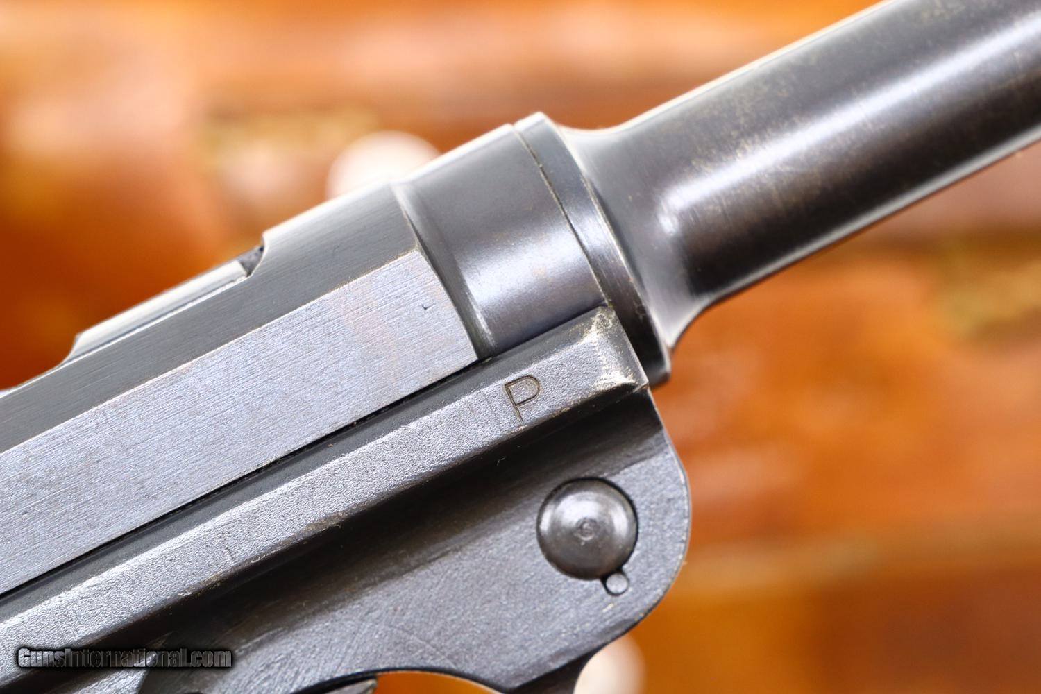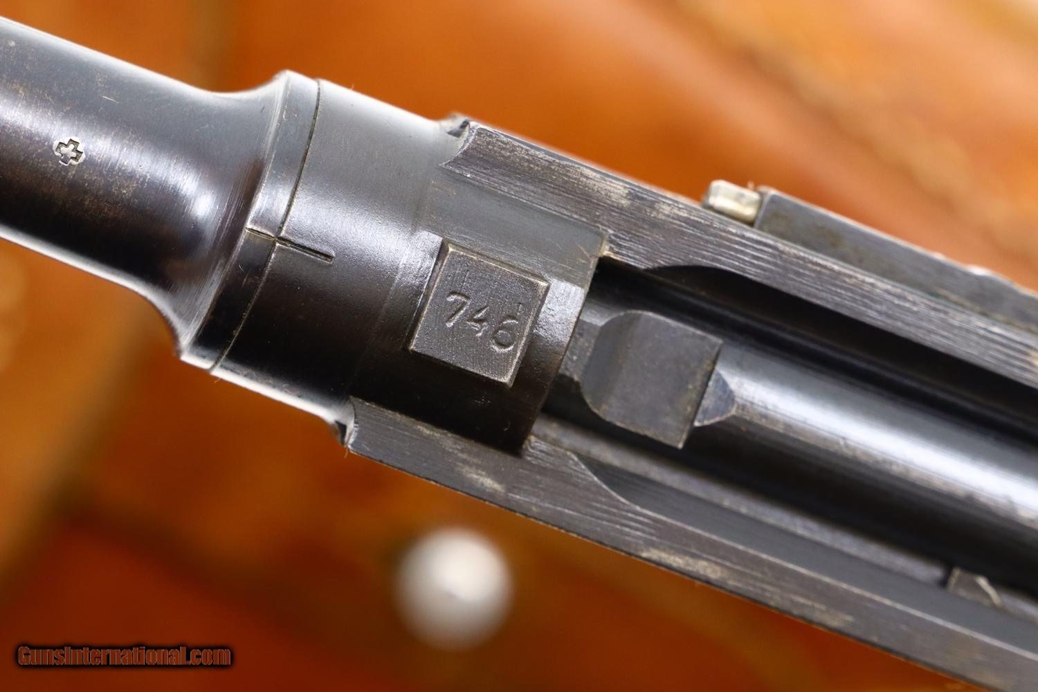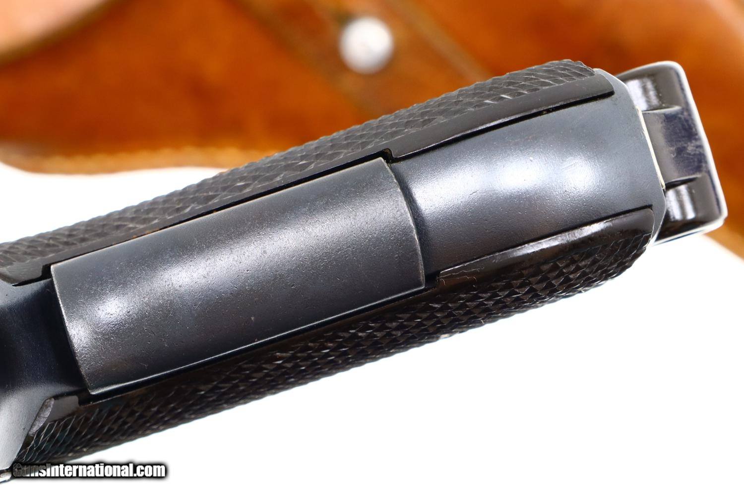 Description: Synopsis: W&F Bern, 1929, Swiss Military, Complete Rig, 68746, FB01041 Description: Standard mid-production Swiss Military 1929 Luger, this example made “10.42” (October 1942) complete with spare magazine closely dated holster and shoulder strap. Standard features include 4.75” barrel with drift adjustable front sight and fixed “U” rear sight. Full matching serial number on barrel, left rail, and rear toggle link with last three digits repeated on side plate and bottom of barrel extension. All small parts with usual inspector markings. “P” release marking on right rail. Forward frame recess marked “10.42” (October 1942). W/F logo on back of frame. Uniformly checkered chocolate brown grips with both magazines having brown plugs. Complete with correct Military holster dated “41” and an unmarked strap. Condition: VG/EXC arsenal reapplied blue, the front sight appearing as a traditional luger blade, light holster wear as one might expect from a pistol that has seen minimal use. Bright bore with sharp rifling. Perfect manual mechanics with both magazines. VG/EXC holster with VG strap. ~~Insured shipping fee of $55; most packages shipped using FedEx 2nd Day.~~ SOLD Curio/Relic: Yes Manufacturer: W&F Bern Serial Number: 68746 Caliber Info: 7.65mm |