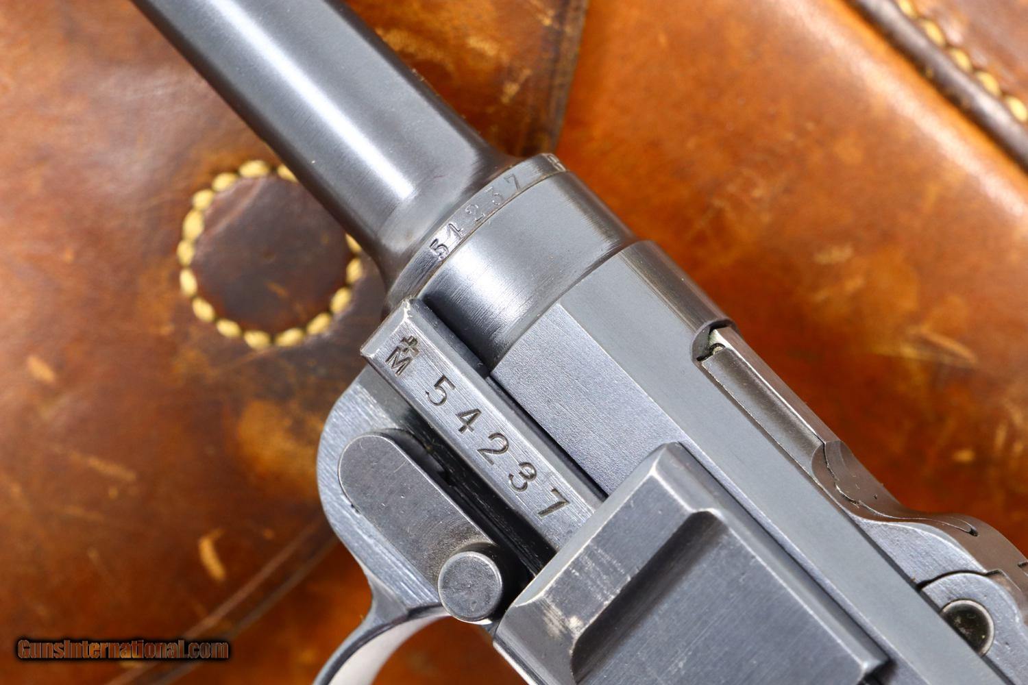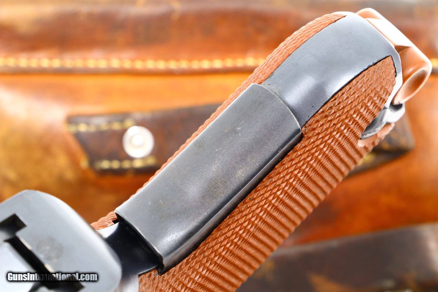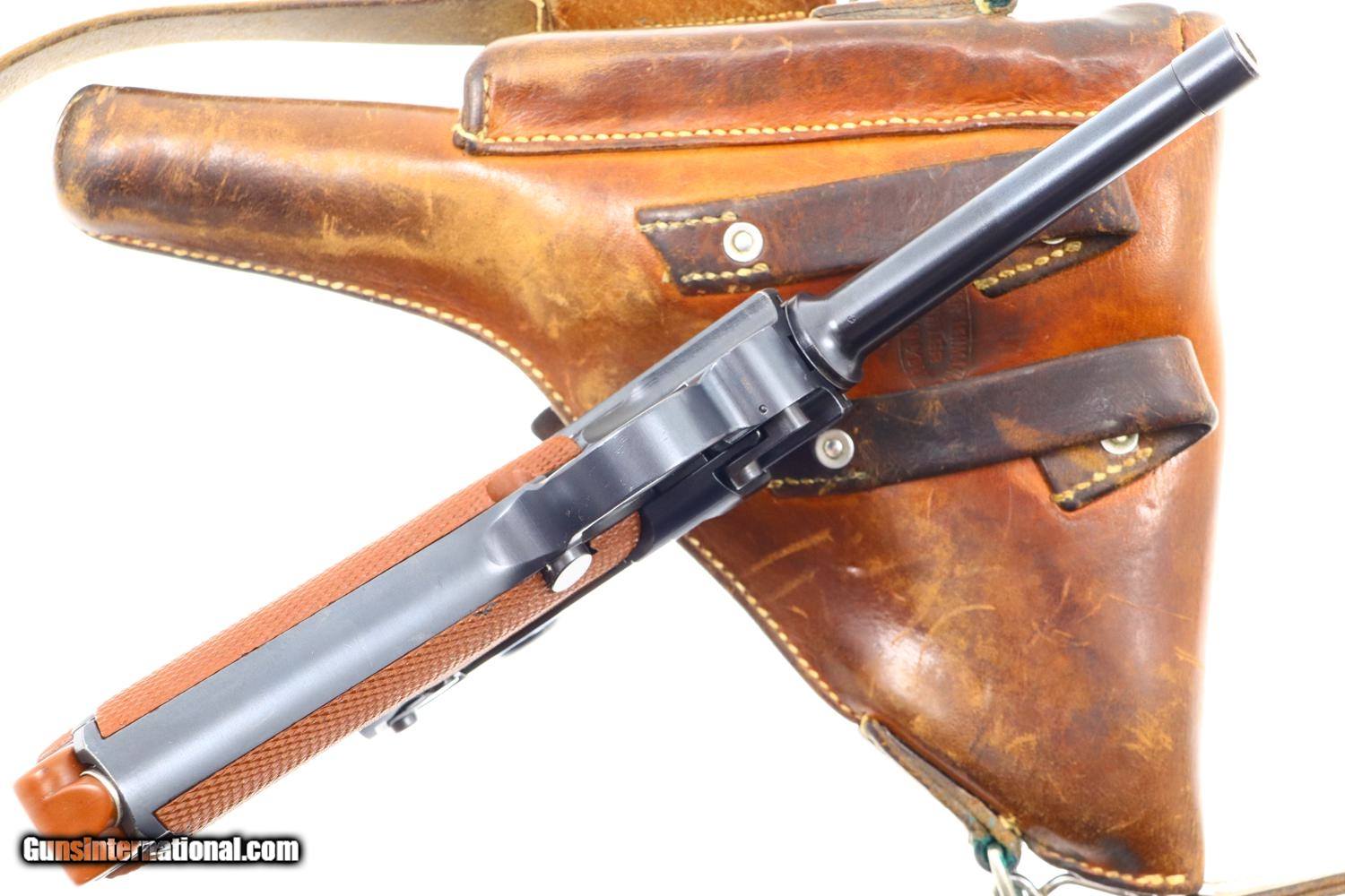 Description: Synopsis: High Condition Bern 1929 Red Grip Luger, used by the Swiss Military, with Holster. Description: Early Red Grip Bern Luger, Swiss Military, caliber 7.65mm Para, made April 1937, with 4.75 inch barrel, drift adjustable front sight, fixed U rear sight, and full matching serial number on barrel, left rail and rear toggle with the last three digits repeated on sideplate and bottom of barrel extension. All small parts with usual inspection markings. No discernible “P” release. Forward frame recess marked “4.37” (April 1937). W/F logo on back of frame, uniformly checkered red hard rubber grips with original red plug magazine. Original and closely dated leather holster “36” with shoulder strap. Condition: EXC Original Finish with minimal high point wear in usual locations, typical of a lightly/carefully carried service pistol. Comparable condition grips and magazine. Mirror bore, Perfect manual mechanics. VG+ Holster dated “60” with unmarked shoulder strap. ~~Insured shipping fee of $65; most packages shipped using FedEx 2nd Day.~~ SOLD Curio/Relic: Yes Manufacturer: Bern Serial Number: 54237 Caliber Info: 7.65mm Para. |