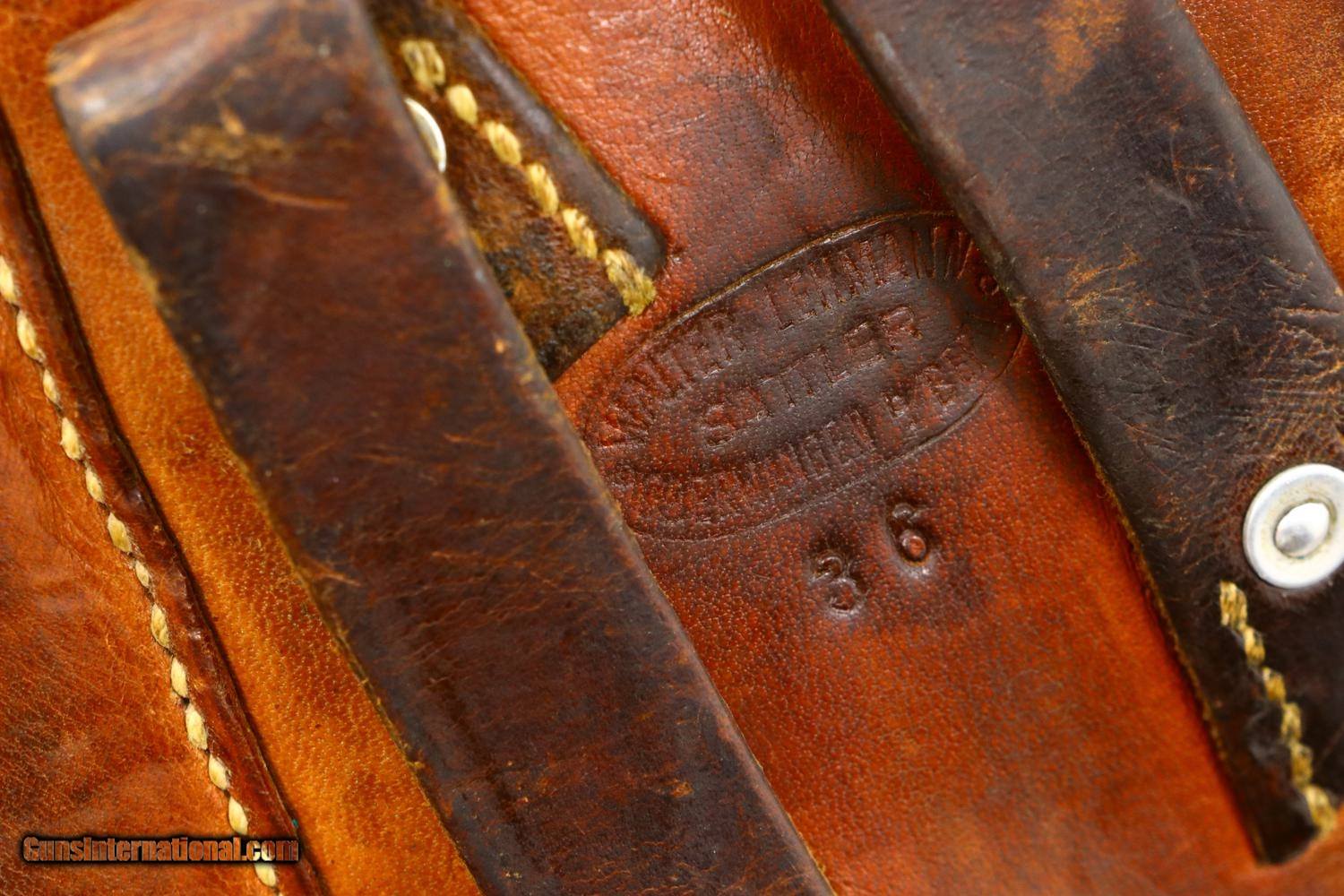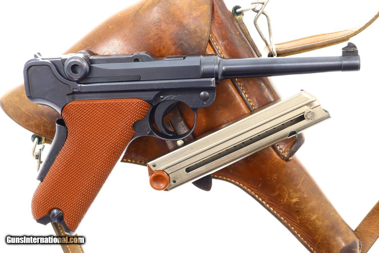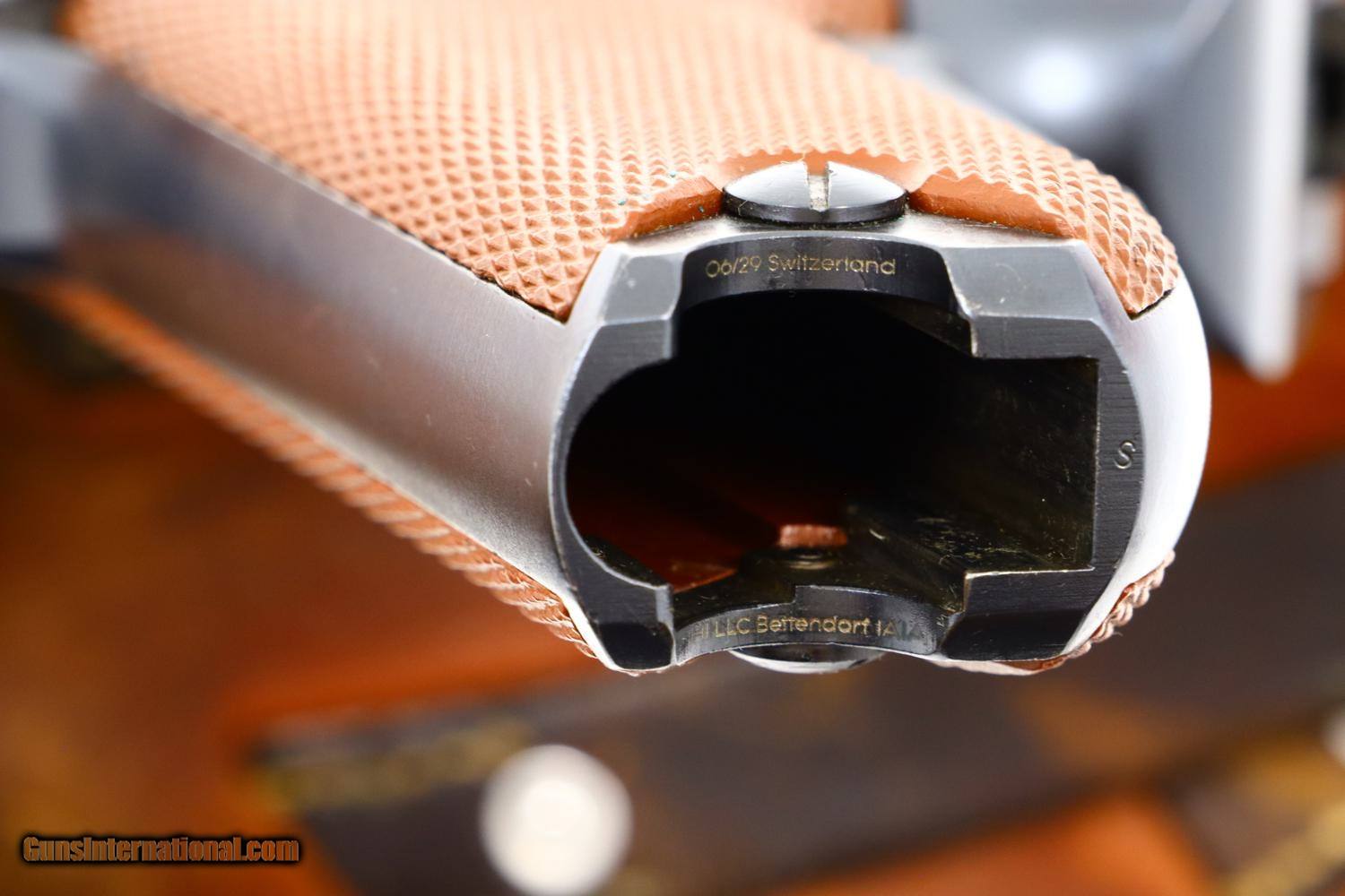 Description: Synopsis: High Condition Bern 1929 Red Grip Luger, used by the Swiss Military, with Holster. Description: Early Red Grip Bern Luger, Swiss Military, caliber 7.65mm Para, made April 1937, with 4.75 inch barrel, drift adjustable front sight, fixed U rear sight, and full matching serial number on barrel, left rail and rear toggle with the last three digits repeated on sideplate and bottom of barrel extension. All small parts with usual inspection markings. No discernible “P” release. Forward frame recess marked “4.37” (April 1937). W/F logo on back of frame, uniformly checkered red hard rubber grips with original red plug magazine. Original and closely dated leather holster “36” with shoulder strap. Condition: EXC Original Finish with minimal high point wear in usual locations, typical of a lightly/carefully carried service pistol. Comparable condition grips and magazine. Mirror bore, Perfect manual mechanics. VG+ Holster dated “60” with unmarked shoulder strap. ~~Insured shipping fee of $65; most packages shipped using FedEx 2nd Day.~~ SOLD Curio/Relic: Yes Manufacturer: Bern Serial Number: 54237 Caliber Info: 7.65mm Para. |