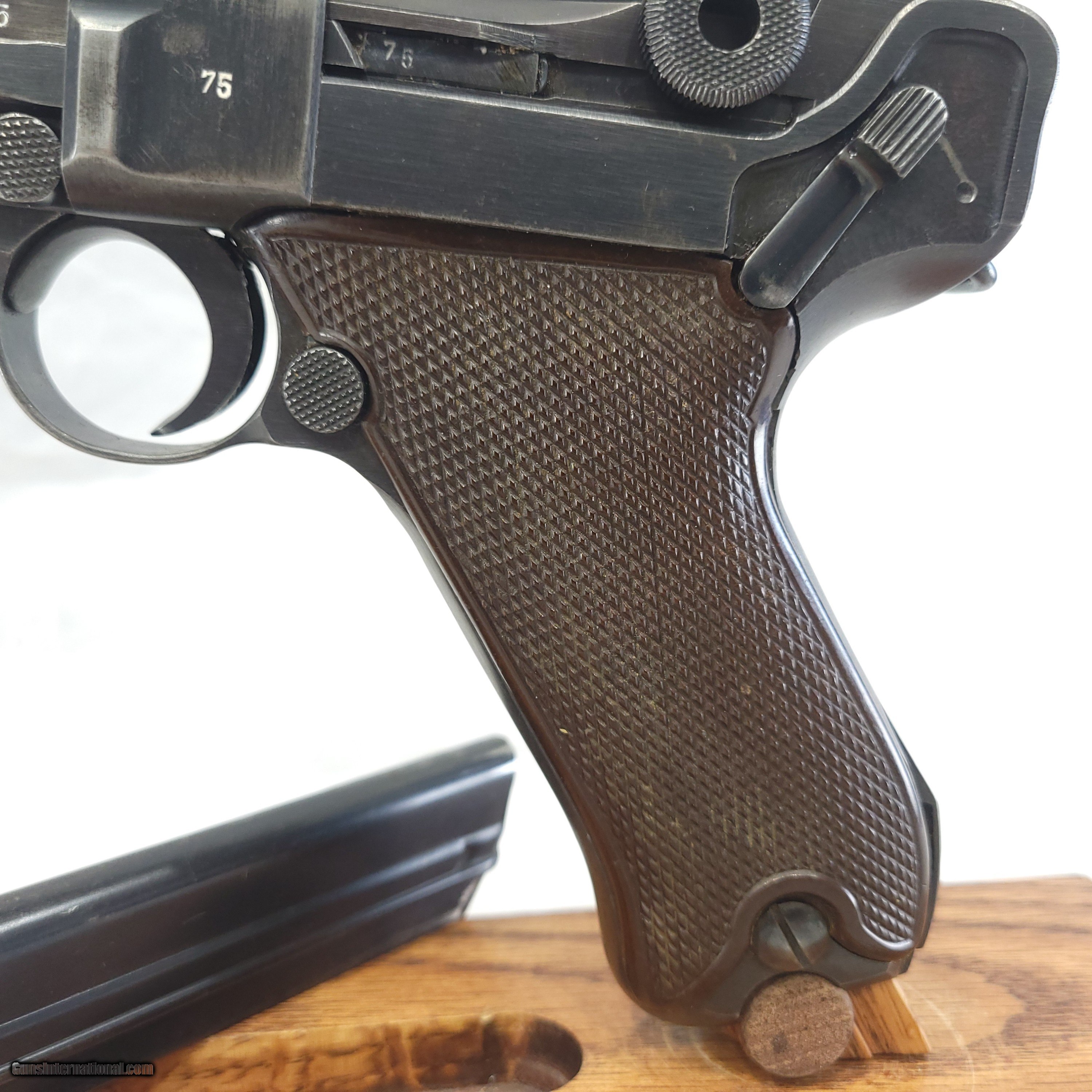 Description: INV. 11472 WOW, MAUSER/KREIGHOF P-08 LUGER, (CODE 42) , CAL. 9MM, SER. 675d, DATED 1940, THIS VERY EARLY "42 HOLSTER QUEEN" IS FITTED WITH THE VERY RARE KREIGHOFF PLASTIC GRIPS. IN 1940 MAUSER WAS UNABLE TO GET WOOD GRIPS. THE NAZIS THEN ORDERED THE MAKER OF PLASTIC GRIPS FOR KREIGHOFF TO SEND BROWN PLASTIC GRIPS TO MAUSER. IT IS REPORTED THAT LESS 2% OF THE 1940 MAUSERS HAD KRIEGHOFF GRIPS. (REF. JAN STILLS BOOK, AXIS LUGERS, PAGE 61). THIS BEAUTY DOES INDEED HAVE AN ORIGINAL PAIR. THE GUN HAS RETAINED ABOUT 97-98% OF THE ORIGINAL FACTORY FINISH. THE LITTLE LOSS IT HAS IS FROM SLIGHT SHARP EDGE SILVERING AND SOME VERY MINOR PIN PRICKS MOSTLY FROM HOLSTER WEAR. THE GRIP STRAPS SHOW NO SIGN OF GRAYING. THERE ARE NO RUST SPOTS, RUB MARKS OR SCRATCHES. ALL PARTS MATCH INCUDING THE MAGAZINE AND HAVE THE PROPER WAFFENAMTS**. THE SLIDE RAILS, BOLT FACE AND FEED RAMP SHOW SLIGHT IF ANY USE. THE BARREL, LIKE THE REST OF THE GUN IS PRISTINE, SUNSHINE BRIGHT WITH RAZOR SHARP RIFLING. IT COMES WITH ONE MAGAZINE SER. # 675d. THIS RARE VARIATION "HOLSTER QUEEN" IS A GREAT FIND FOR EVEN THE MOST CRICTICAL COLLECTOR AND CERTAINLY A COLLECTION CENTERPIECE. INVESTMENT PRICED AT...... $3695 **. **THE HARMLESS WAX CRAYON IS TO SHOW THE MARKINGS ARE CORRECT. IT IS EASILY REMOVED WITH LIGHTER FLUID AND A BRUSH. WE WILL DO IT ON REQUEST. ***100% OF THE GUN'S PRICE IS SATISFACTION GUARANTEED. To purchase this firearm or if you want to request more information contact us at: Email ckguns[at]ymail[dot]com Phone 201-512-0002 Cell 201-575-6838 FAX 201-215-4759 We accept most major credit cards. Prices shown are Discounted 3% for Cash or Check. The buyer must be familiar with all the laws governing the purchase and the ownership of firearms in their own city and state. The Yankee Armorer, Inc is not responsible for any failure to comply with or observe these laws. The Yankee Armorer, Inc will only ship after full payment and receipt of all required documents. Shipping: Add $35.00 for handguns, $45.00 for long guns. New Jersey buyers are subject to a 7% sales tax. The Yankee Armorer, Inc offers a 3 day inspection period with full refund upon return of intact firearm and in the original condition. The Yankee Armorer, Inc offers a no interest lay away program - 25% down; 25% in 30 days; 25% in 60 days; and full payment in 90 days. Any violation of this policy is subject to restocking and forfeiture of all payments. Any variation from this policy must be agreed to in advance. Unshipped Cancelled sales are subject to a 20% restocking fee. Be advised that all firearms sold by The Yankee Armorer, Inc. or the Gun Exchange, LLC (SELLER) are sold as collector’s items. They have not been fired or tested for safety and must be examined by a license gunsmith prior to use. By purchasing any item from the (SELLER), you are agreeing to hold the (SELLER) free from any damages or lawsuits of any nature. Any item left for transfer or storage will be charged to $25.00 per month, per item from the day of its receipt. Any variation from this policy must be agreed to in advance. Store hours 10:00 am to 5:00 pm Tuesday -Saturday. It's always best to call for appointment. Store 201-512-0002, cell 201-575-6838. SOLD |