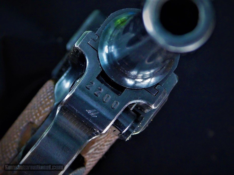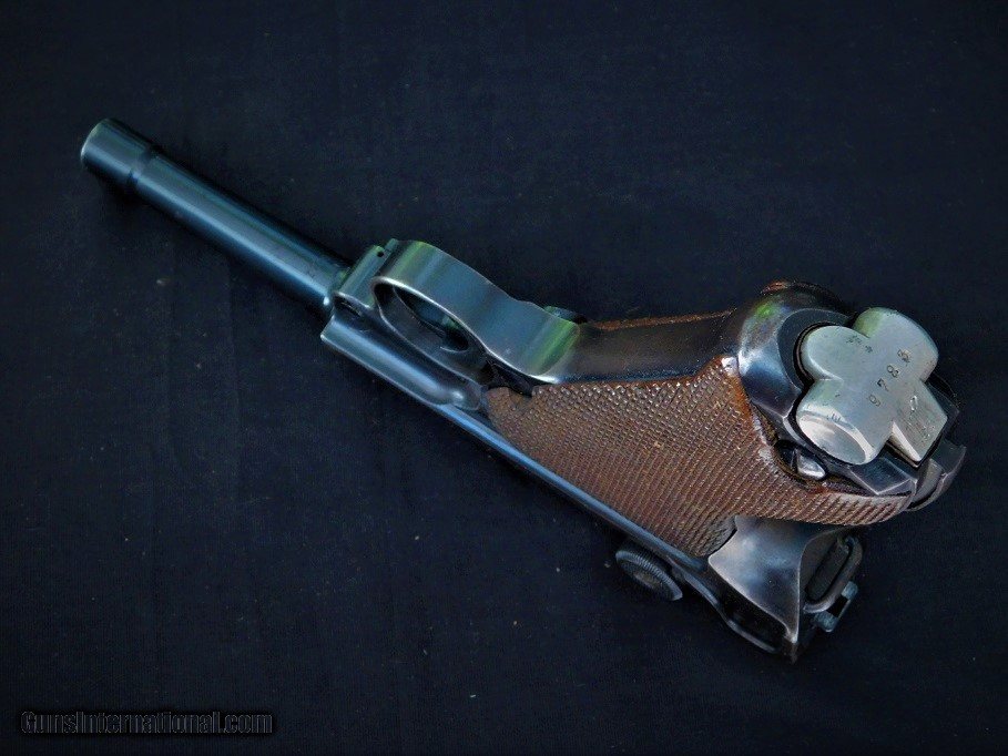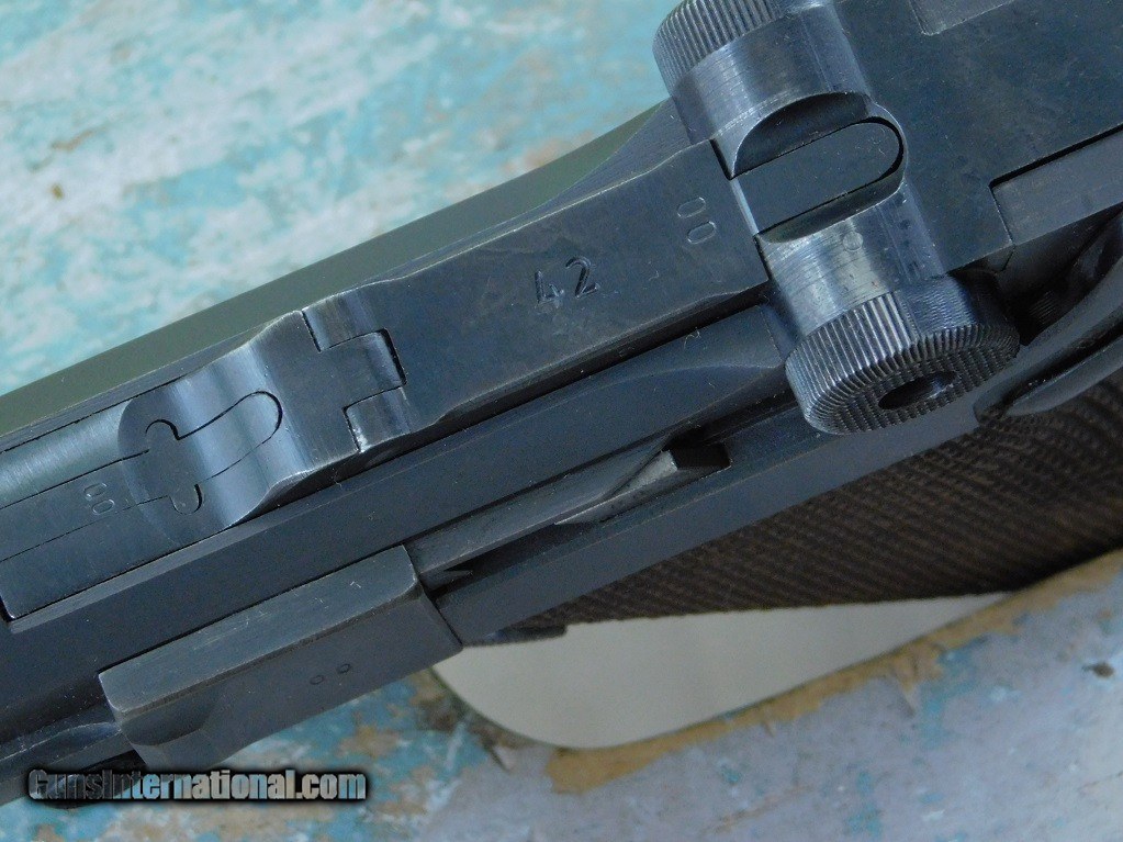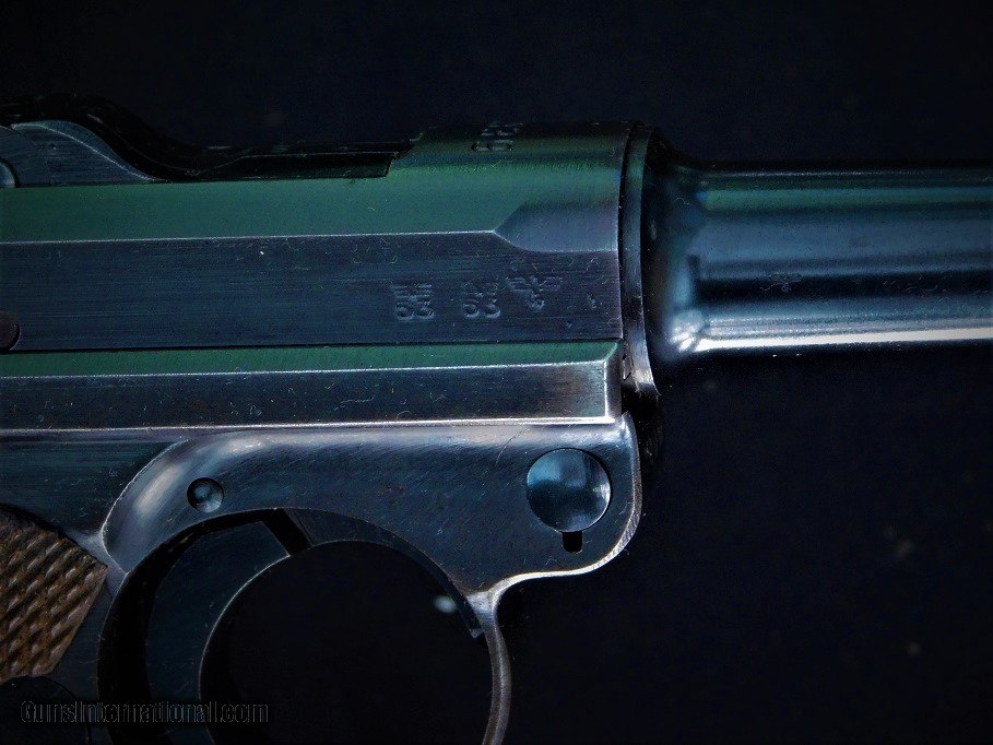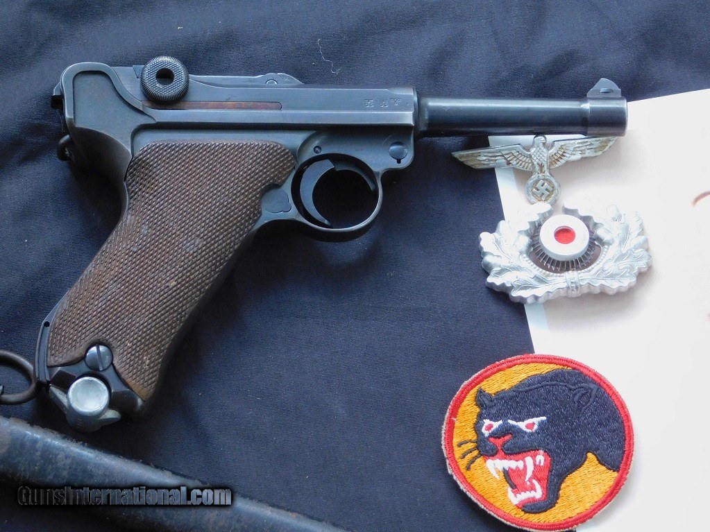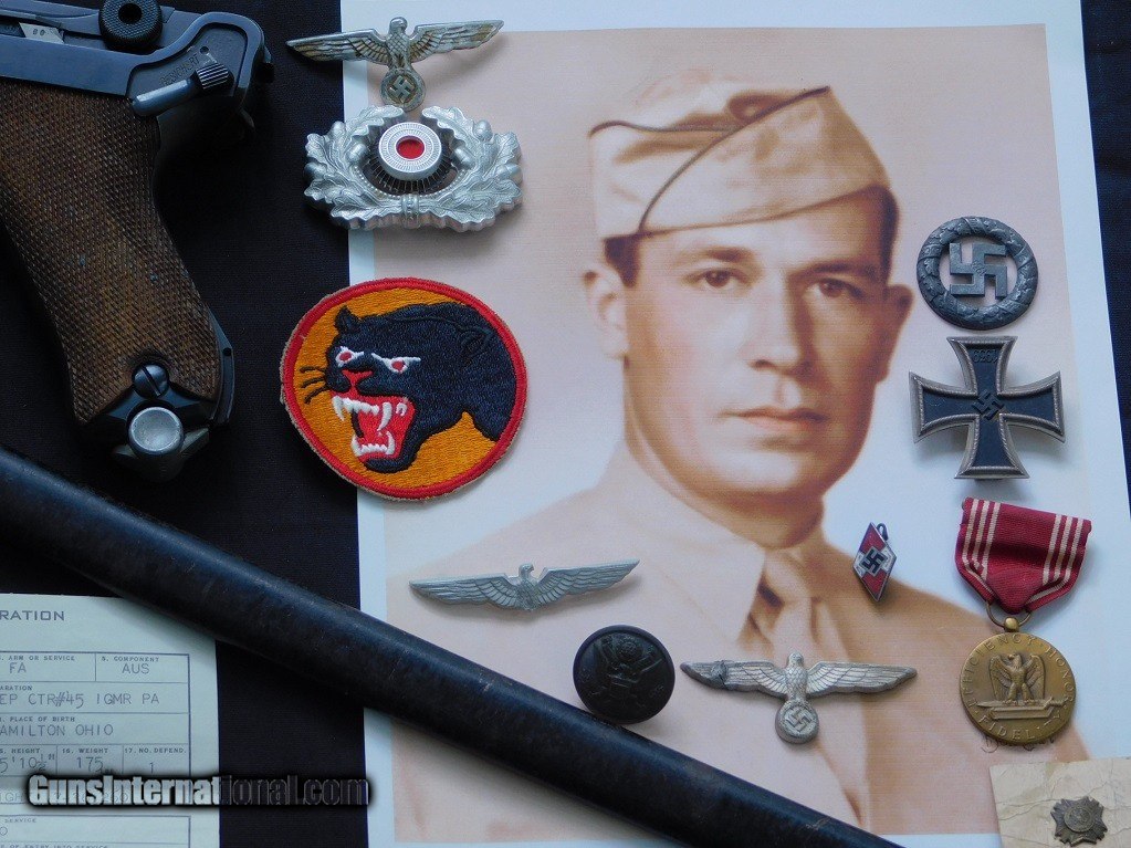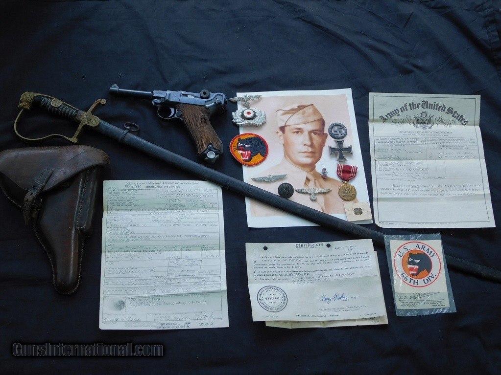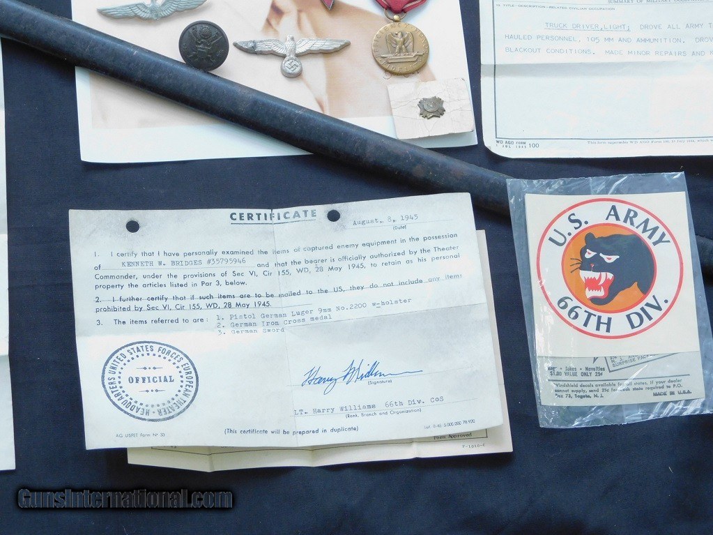 Description: WW2 German 1939 Luger 42 "Mauser" 9mm captured & identified grouping. All matching 1939 Mauser Luger with 2 magazines and maker marked 1939 holster + German medals. Grouping is identified with the Luger capture paper and the 66th Division American soldiers original papers, his DD-214 paper, his discharge paper, his photo, his Good Conduct Medal, sleeve patch for the 66th Division "Black Panthers" & lapel button as issued. The Luger is 98% Original Finish and all matching, bore is EX nice with sharp rifiling, has 2 magazines one has matching number as the luger with last digit overstamped but diff. letter code the other magazine is not matching. The holster is maker marked Karl Danh Waldbrbl 1939 and Eagle over WaA727 and condition is excellent with all stitching tight and intact and shows great leather patina, includes DWM take down tool in pocket. Grouping 1945 by T/5 Kennith Bridges BTRY B 872 F A BN attached and part of the 66th Division. Their mission in WW2 Europe was to to contain and destroy the enemy in the St. Nazaire and Lorient pockets near La Croix France. Grouping consist of German Iron Cross 1939 and various medals as pictured and listed as medals on capture papers, pictured sword is not included in the grouping. A great identified all original grouping. If you need specific pictures just ask and i can email them to ya. Shipped to FFL and or C&R only no exceptions. No sales to CA, NJ, Mass., Conn., NY, Hi, Alaska., Ill. or any other state where not allowed by State law. Sold & shipped only within the US no exportation. Feel free to ask any questions or make a reasonable offer. Shipped Fedx with insurance and signature reqd. 2 day delivery, $55. +On Hold Awaiting Pmt.+ SOLD Curio/Relic: Yes Manufacturer: MAUSER Model: LUGER Serial Number: 22XX Barrel Length: STD. Condition: 98% original Metal Condition: original finish Wood Condition: EX Bore Condition: sharp Action: Toggle Stock: wood checkered Finish: original blue Sights: Factory Manufacture Date: 1939 |