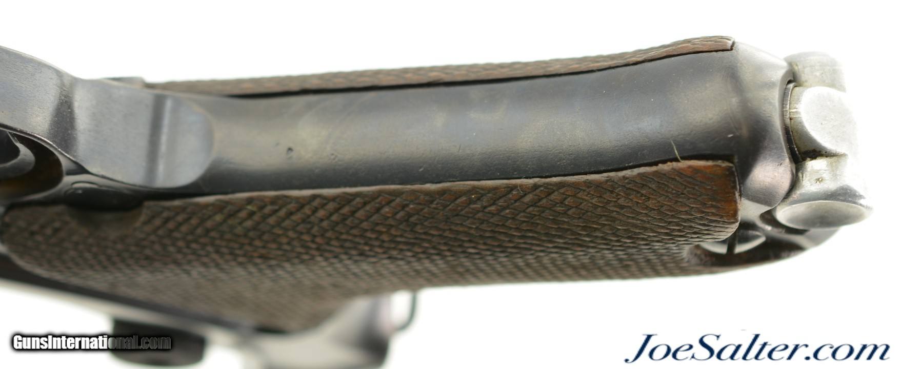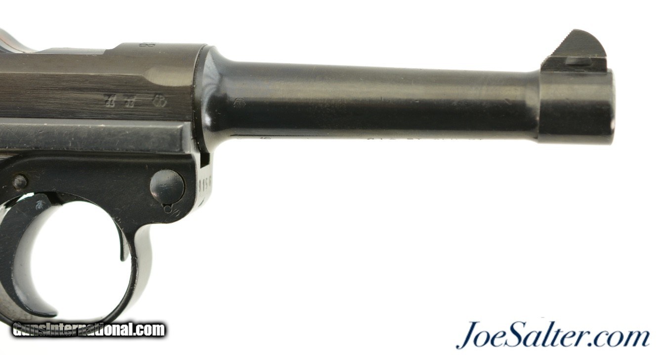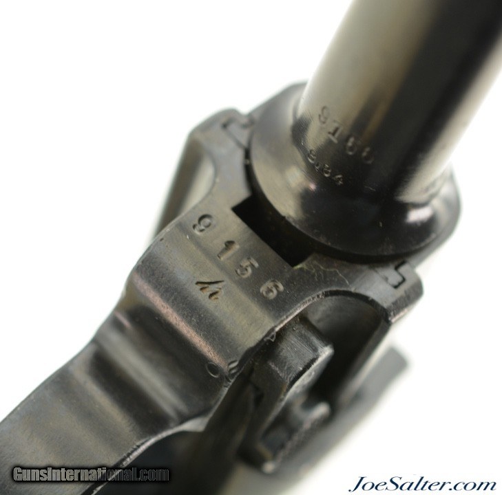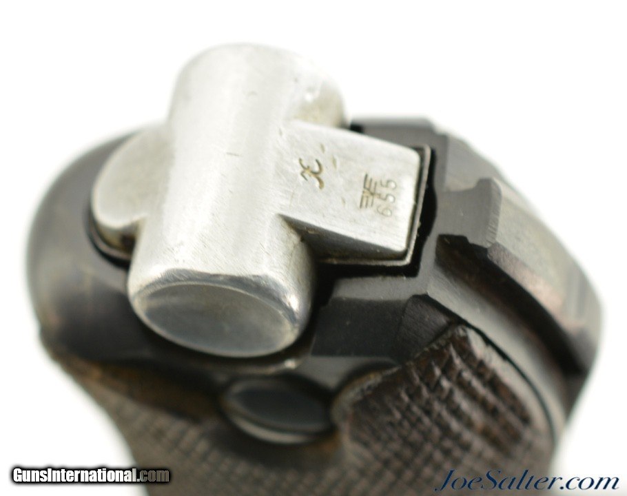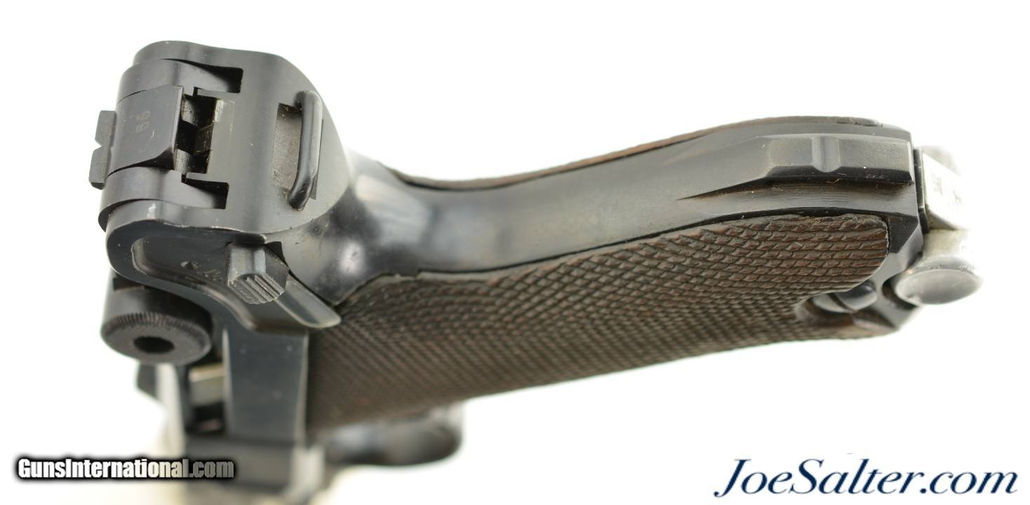 Description: Serial #9156u, 9mm Para., 4" barrel with an excellent, bright bore. This is an "S/42" coded pistol that has a 1938-dated chamber, and recent import stamp on the underside of the barrel. The pistol has mostly matching numbers, although the sideplate, toggle pin, trigger, sear, and toggle latch had their original numbers peened out and obscured (the numbers "56" were scratched into the sideplate, however). The metal retains 98-99% of an overall excellent added blue finish that has only some very minor spots of silvering on a few of the high points and bearing surfaces. The checkered wooden grips are in very good shape with light wear and flattening of the points on both panels, most noticeably at the butt. The pistol is housed in an original 1941-dated hard-side P.08 holster with Waffenamt proof between the belt loops (the manufacturer code is not legible). The leather is lightly scuffed in places, but is otherwise in very good shape with some minor flaking along the edges of the cover flap. The pistol is further accompanied by: two aluminum base magazines (one with Waffenamt proof) and an eagle proofed takedown tool. This is a very good WW2 Luger overall, with a nice war dated holster. FFL or C&R; Curio/Relic: Yes Price: $1,595.00 Contact Seller |
