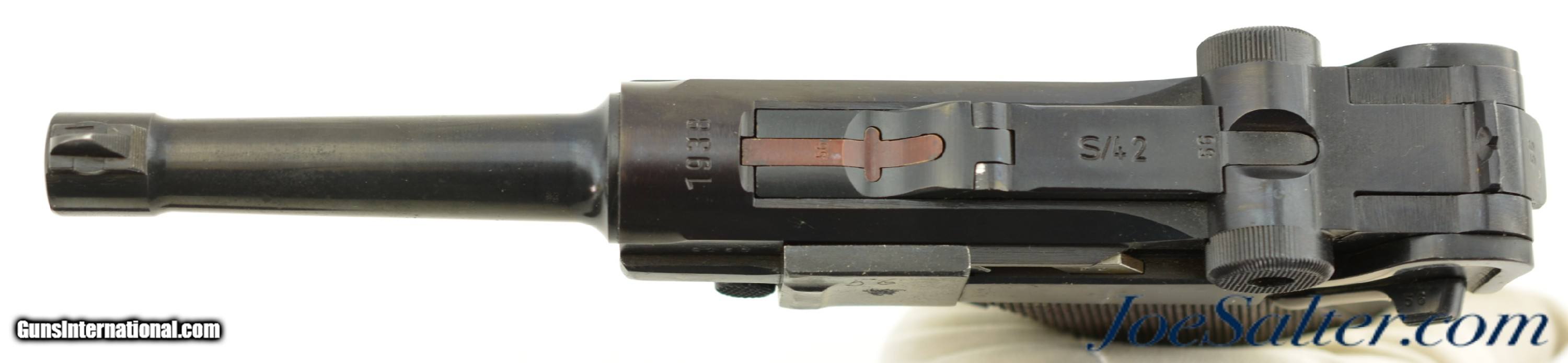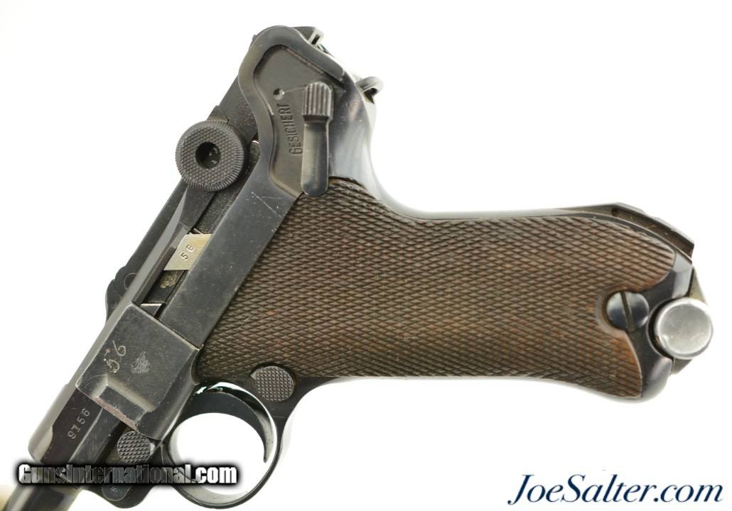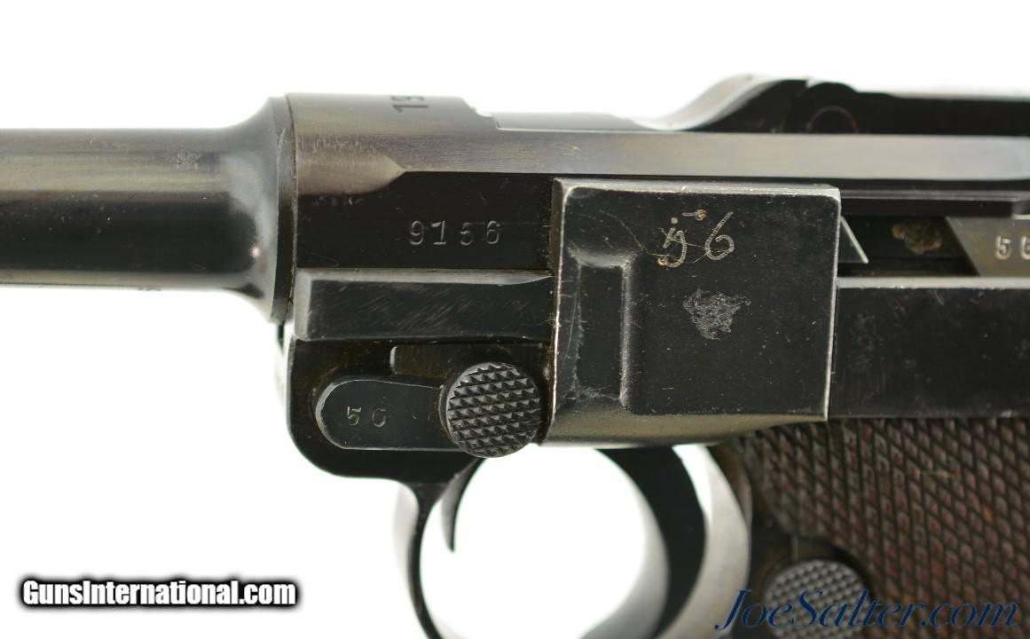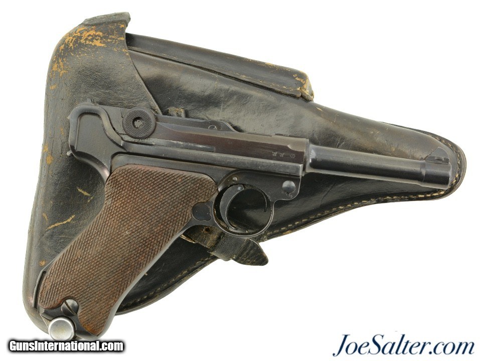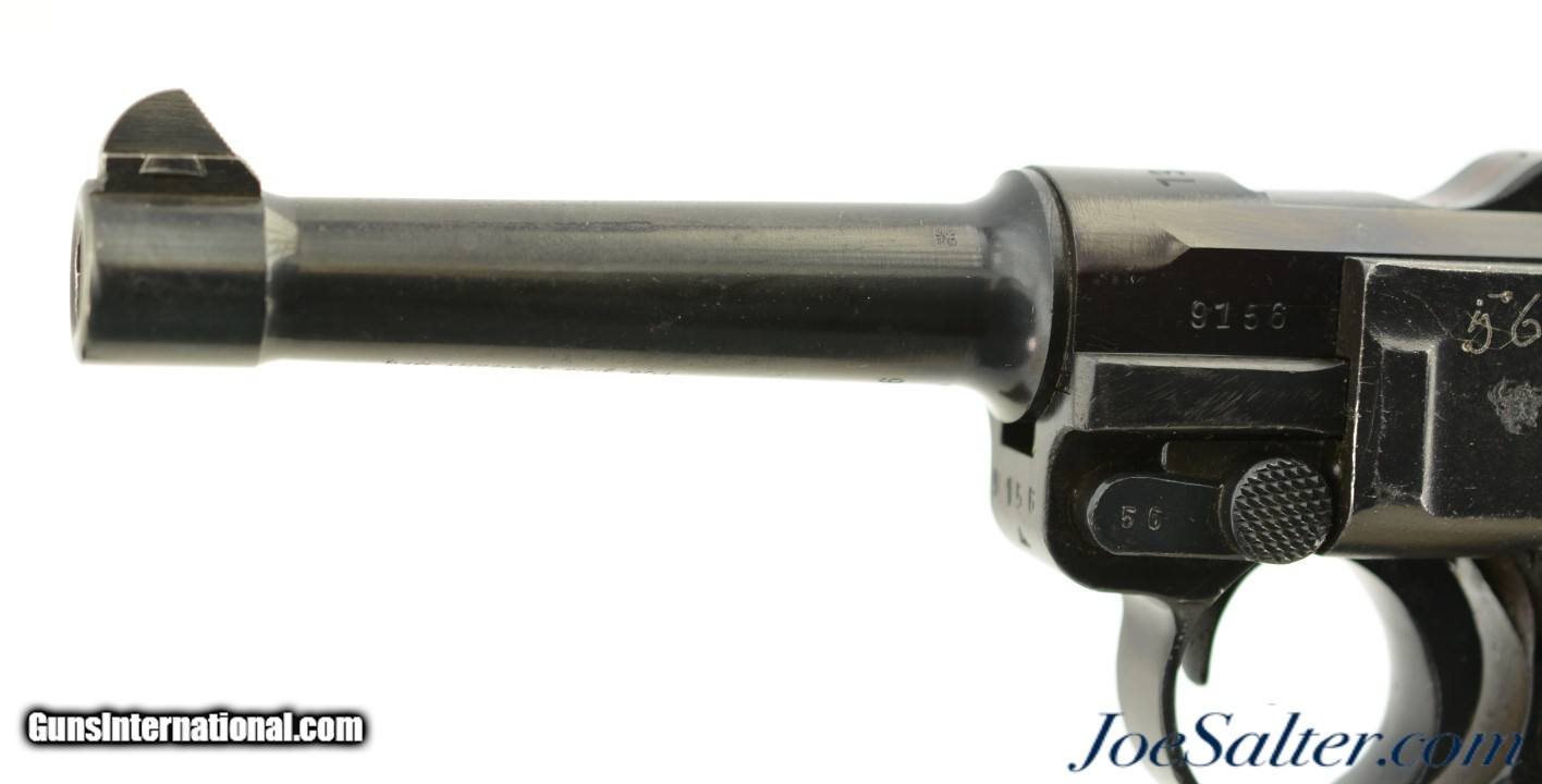 Description: Serial #9156u, 9mm Para., 4" barrel with an excellent, bright bore. This is an "S/42" coded pistol that has a 1938-dated chamber, and recent import stamp on the underside of the barrel. The pistol has mostly matching numbers, although the sideplate, toggle pin, trigger, sear, and toggle latch had their original numbers peened out and obscured (the numbers "56" were scratched into the sideplate, however). The metal retains 98-99% of an overall excellent added blue finish that has only some very minor spots of silvering on a few of the high points and bearing surfaces. The checkered wooden grips are in very good shape with light wear and flattening of the points on both panels, most noticeably at the butt. The pistol is housed in an original 1941-dated hard-side P.08 holster with Waffenamt proof between the belt loops (the manufacturer code is not legible). The leather is lightly scuffed in places, but is otherwise in very good shape with some minor flaking along the edges of the cover flap. The pistol is further accompanied by: two aluminum base magazines (one with Waffenamt proof) and an eagle proofed takedown tool. This is a very good WW2 Luger overall, with a nice war dated holster. FFL or C&R; Curio/Relic: Yes Price: $1,595.00 Contact Seller |