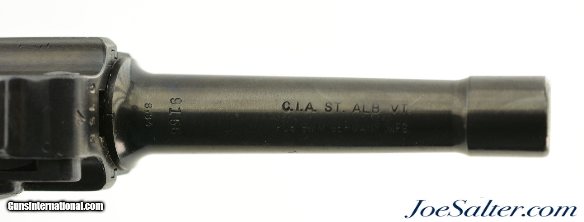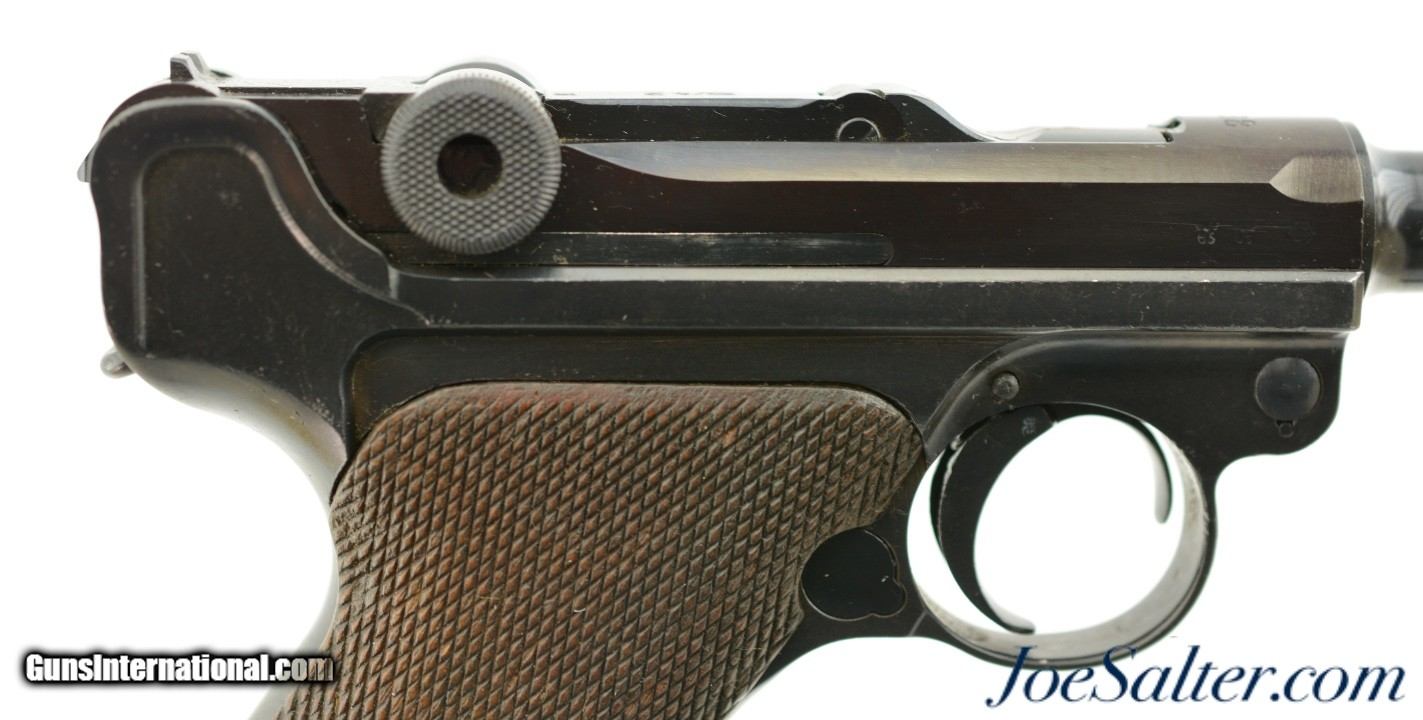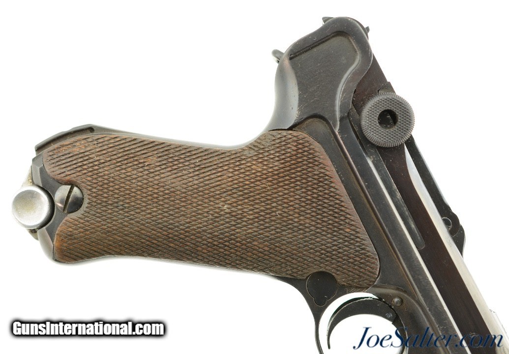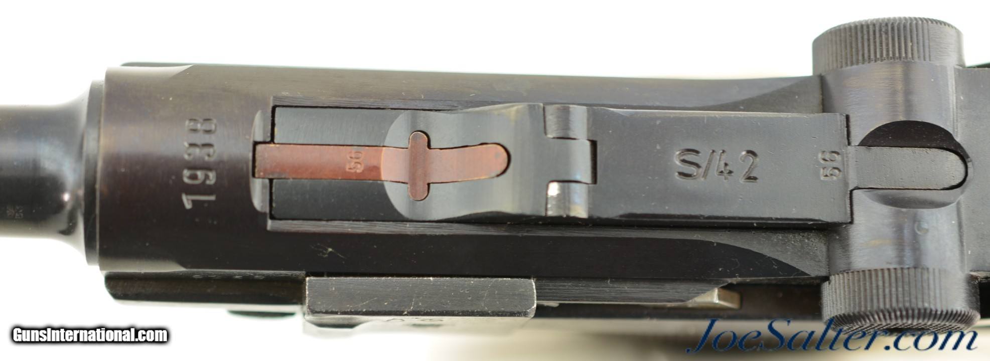 Description: Serial #9156u, 9mm Para., 4" barrel with an excellent, bright bore. This is an "S/42" coded pistol that has a 1938-dated chamber, and recent import stamp on the underside of the barrel. The pistol has mostly matching numbers, although the sideplate, toggle pin, trigger, sear, and toggle latch had their original numbers peened out and obscured (the numbers "56" were scratched into the sideplate, however). The metal retains 98-99% of an overall excellent added blue finish that has only some very minor spots of silvering on a few of the high points and bearing surfaces. The checkered wooden grips are in very good shape with light wear and flattening of the points on both panels, most noticeably at the butt. The pistol is housed in an original 1941-dated hard-side P.08 holster with Waffenamt proof between the belt loops (the manufacturer code is not legible). The leather is lightly scuffed in places, but is otherwise in very good shape with some minor flaking along the edges of the cover flap. The pistol is further accompanied by: two aluminum base magazines (one with Waffenamt proof) and an eagle proofed takedown tool. This is a very good WW2 Luger overall, with a nice war dated holster. FFL or C&R; Curio/Relic: Yes Price: $1,595.00 Contact Seller |